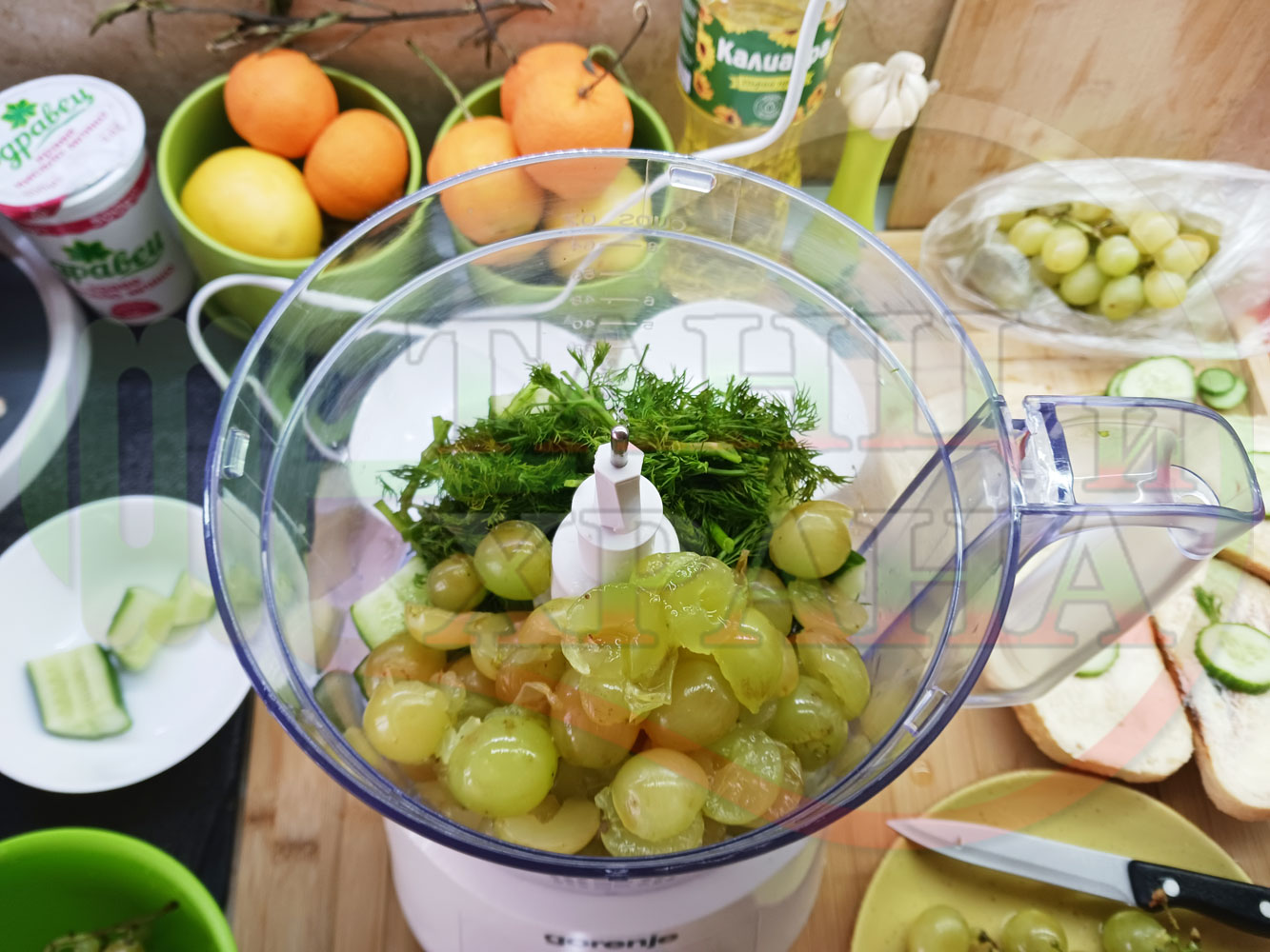 Измийте краставицата и гроздето, оронете гроздовите зърна от чепката и ги почистете от семките с разрязване през средата и изваждане на семките с остър нож (заделете по-хубави и цели зърна от гроздето за украса). Сипете нарязаната краставица заедно с измития и нарязан на едро копър и гроздовите зърна в чопър и разбийте с чопъра продуктите до образуване на средно гъста гроздовокопърова, хомогенизирана супа с краставица (гроздова супа (заделете стръкчета копър за украса на супата)).