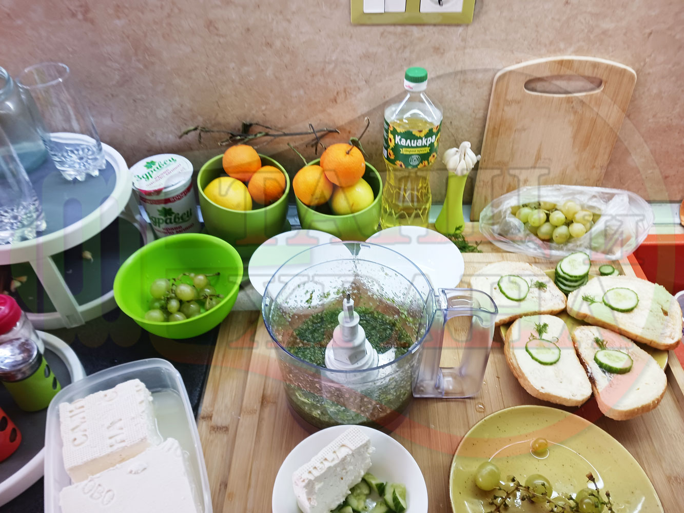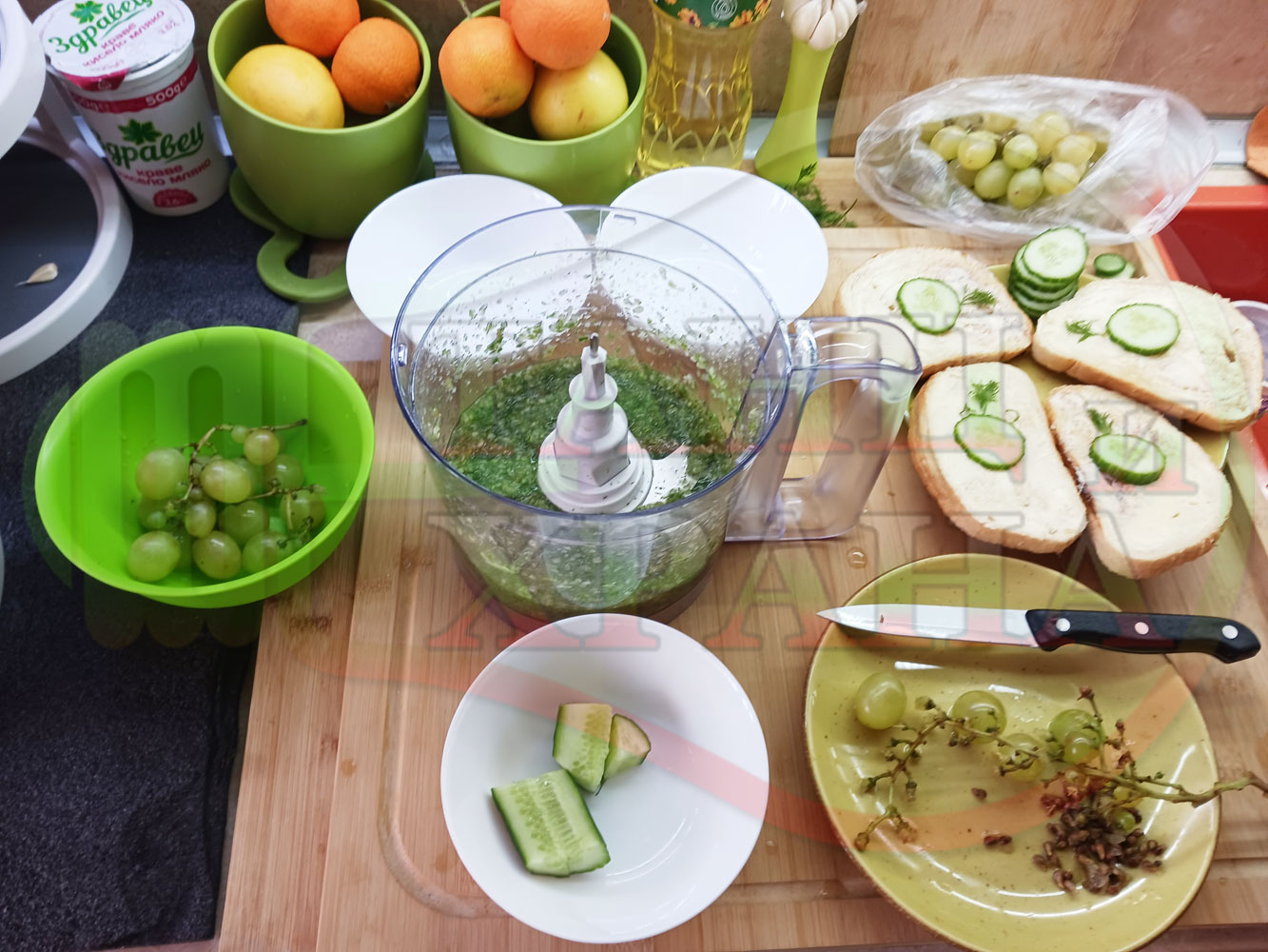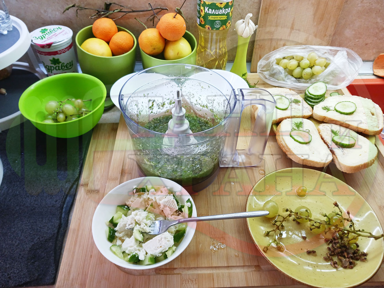 ПРОДУКТИ: Приблизителни количества за българска сурова сладко солена супа "Гроздовокопърова сиреновокраставична с БГсирене" приготвена с прясно грозде, краставици и свеж копър гарнирана с топчета от сиреново краставичен крем с краве бяло сирене (българско, саламурено) - двукомпонентна