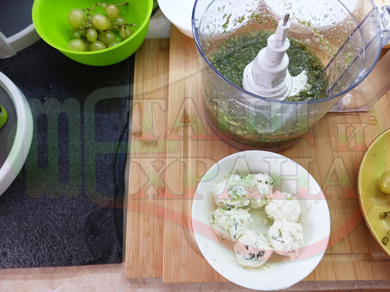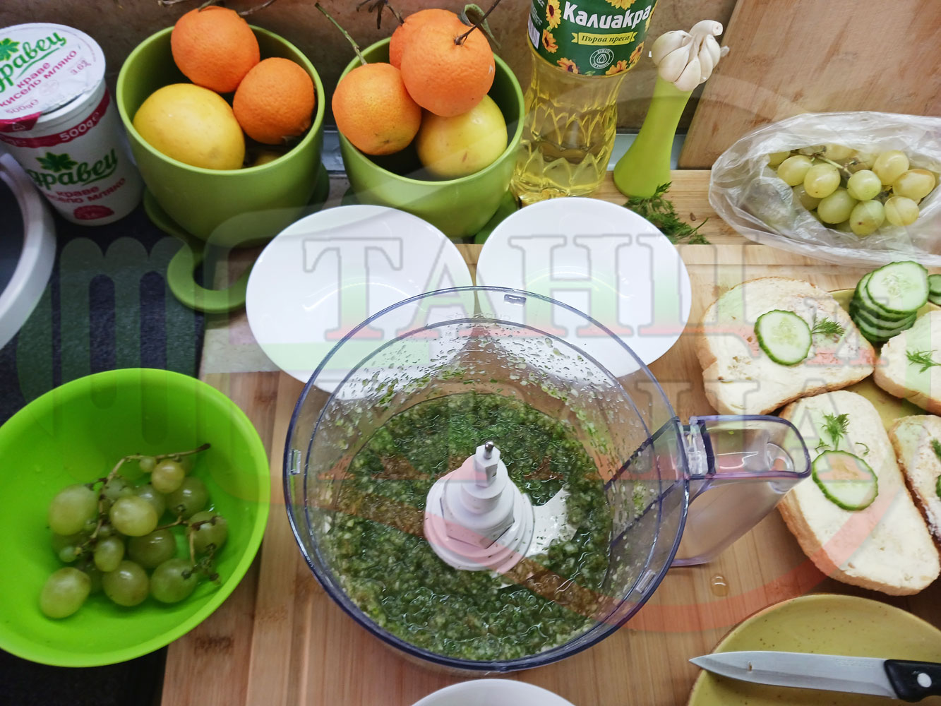 Измийте краставицата, нарежете я на малки парченца в купа и добавете българското краве бяло сирене и обеления и нарязан на едро чесън (нарежете част от краставицата на кръгчета за украса). Разбъркайте и намачкайте с вилица за да се овкусят продуктите до образуване на сравнително гъст сиреново краставичен, хомогенизиран крем (сиренов крем). Оформете 6 средно големи топчета от крема за гарниране на гроздовата супа.
