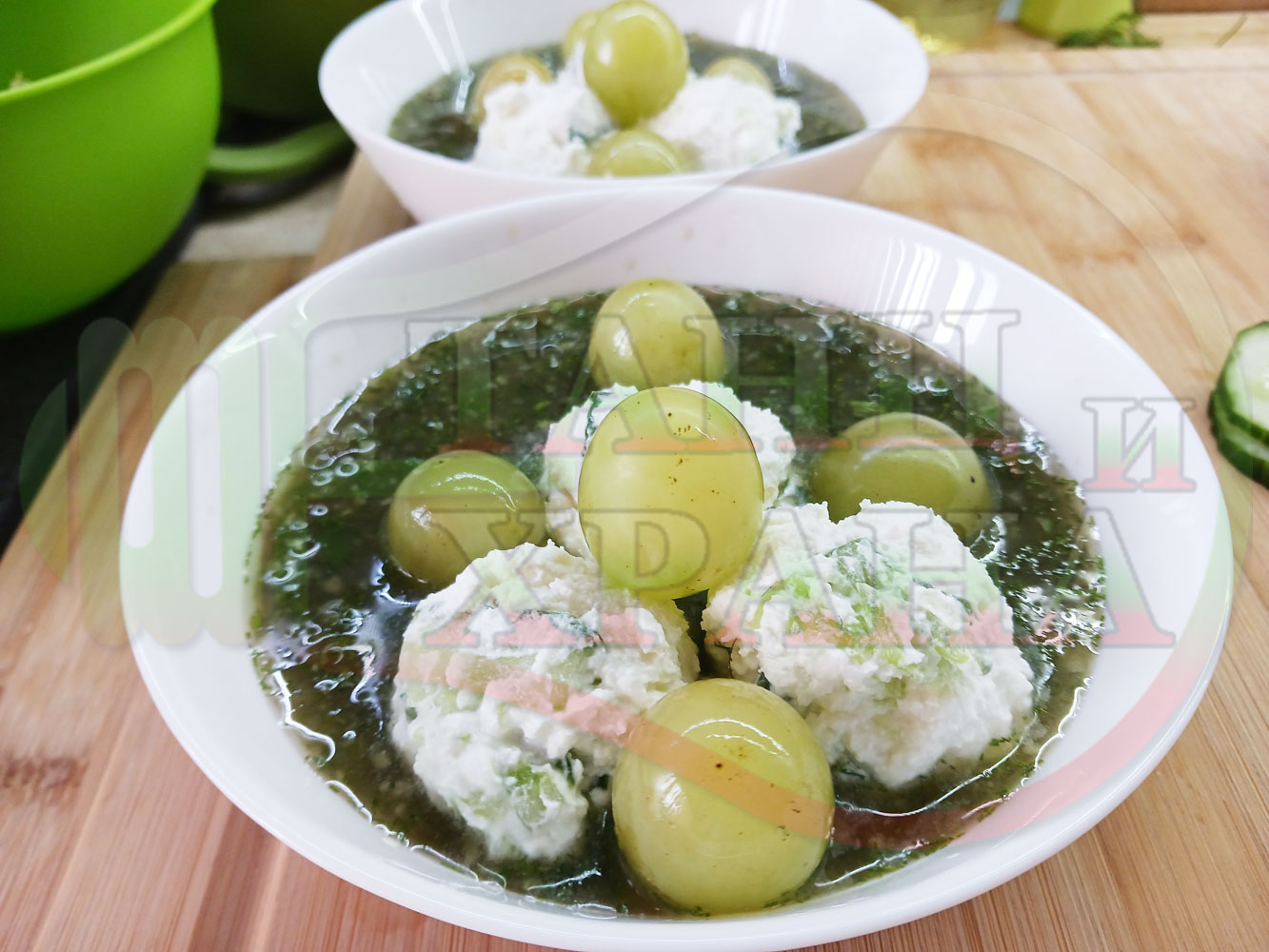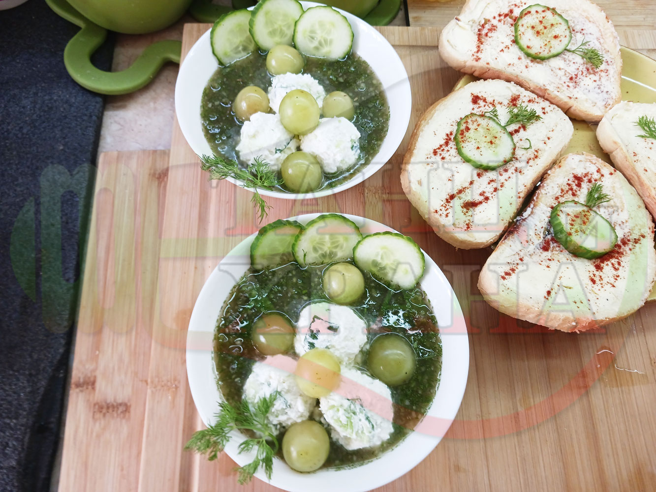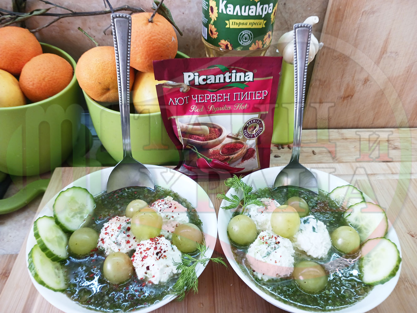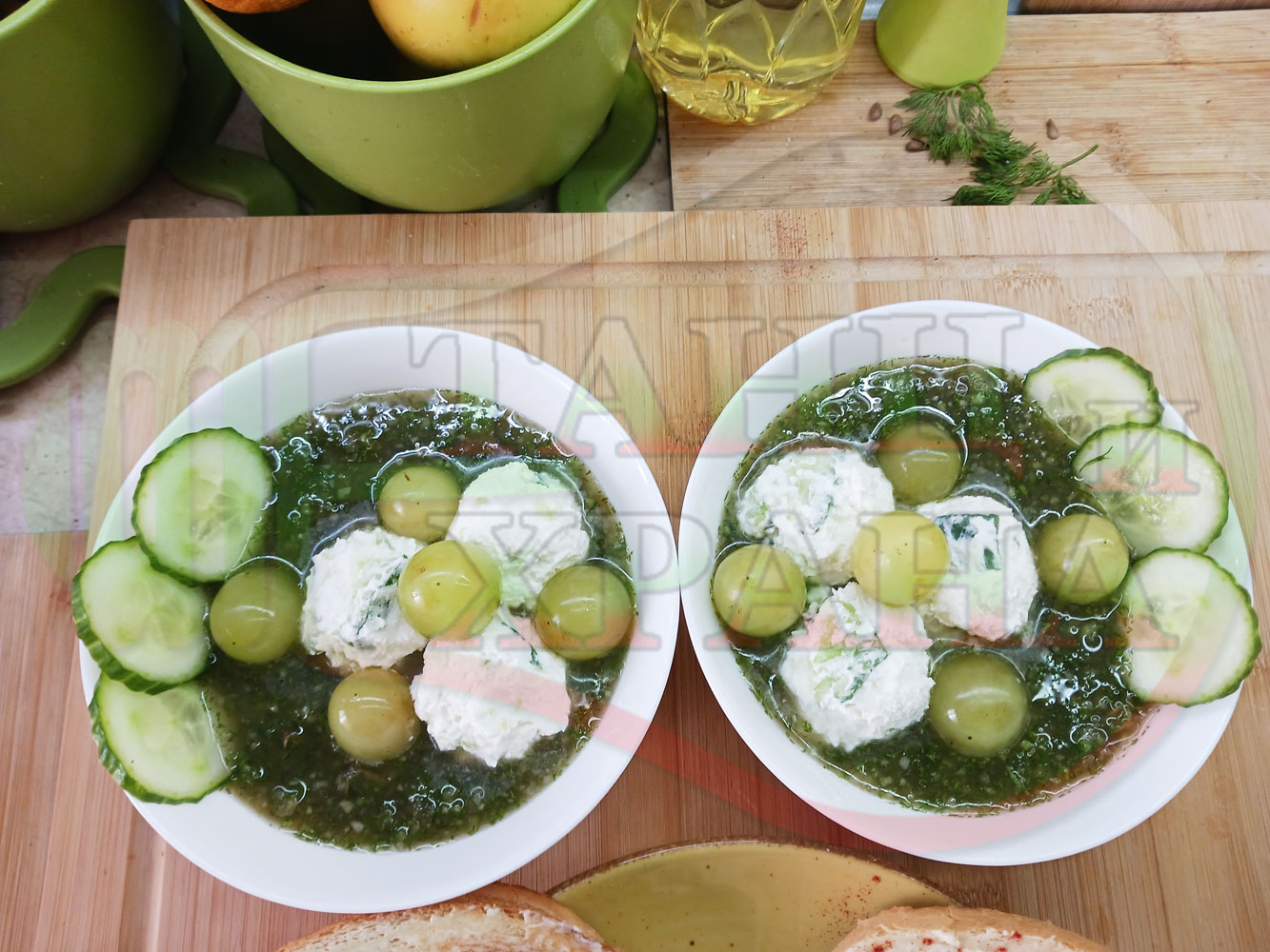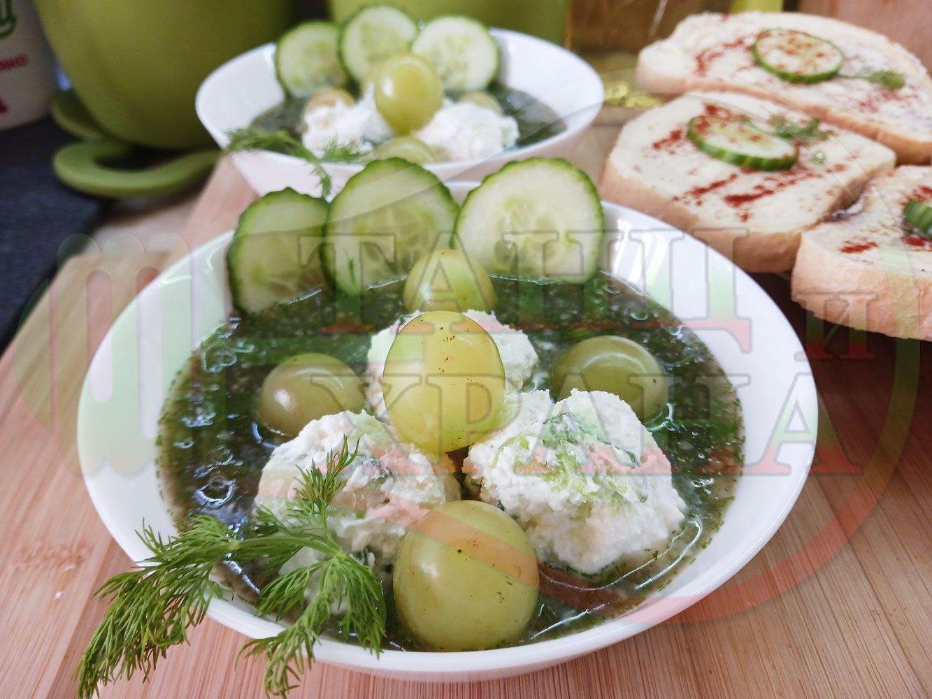 Българска сурова сладко солена супа "Гроздовокопърова сиреновокраставична с БГсирене" приготвена с прясно грозде, краставици и свеж копър гарнирана с топчета от сиреново краставичен крем с краве бяло сирене (българско, саламурено) - двукомпонентна