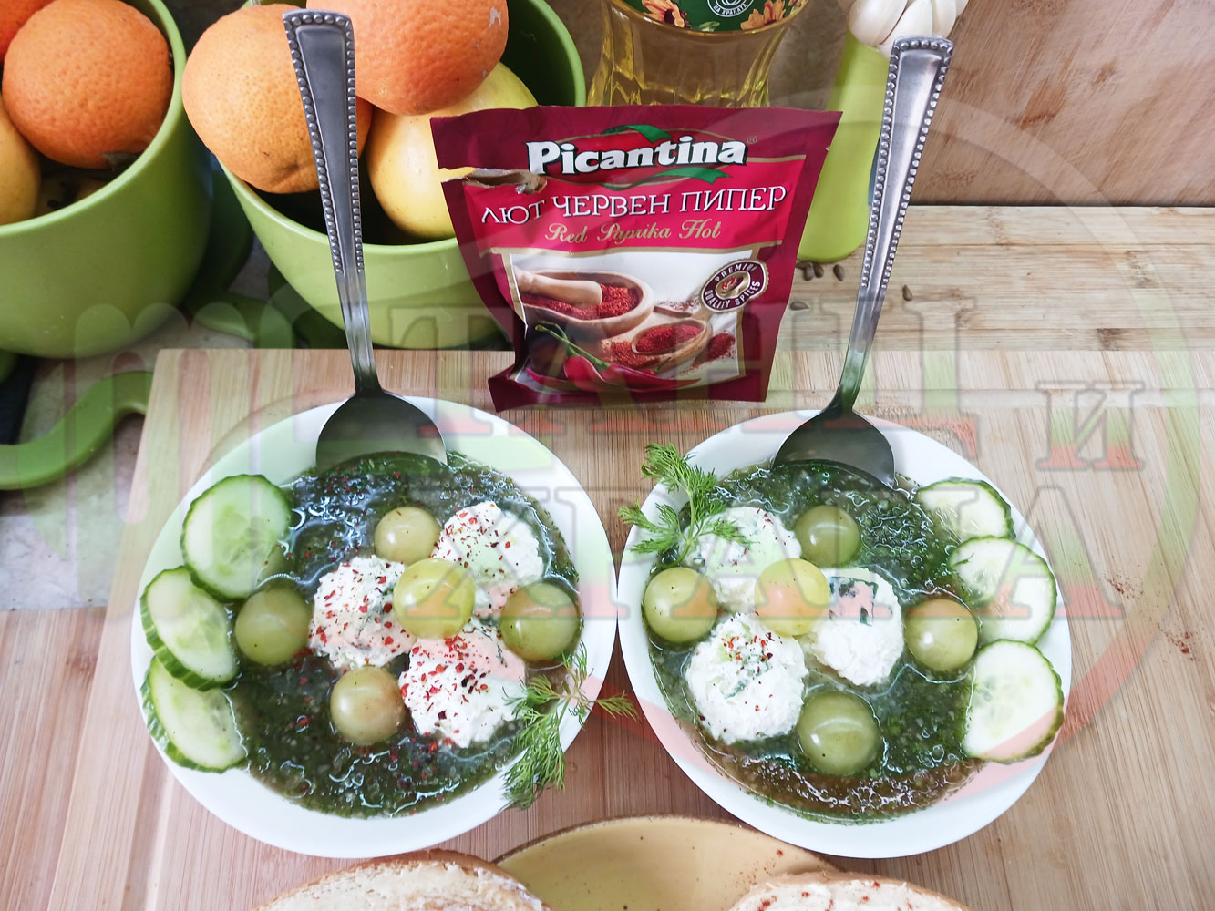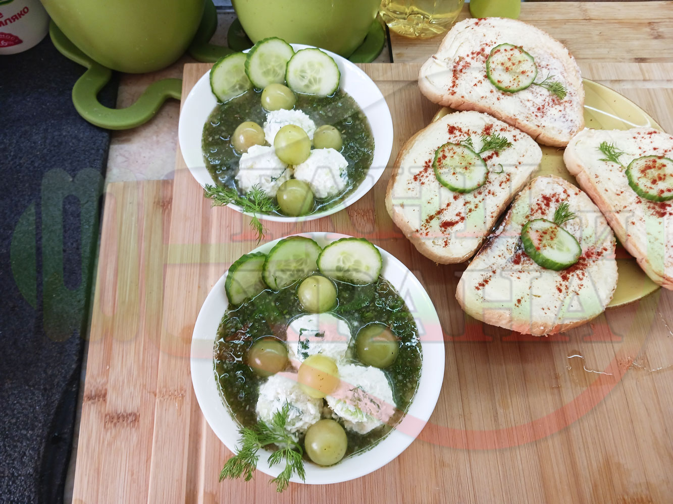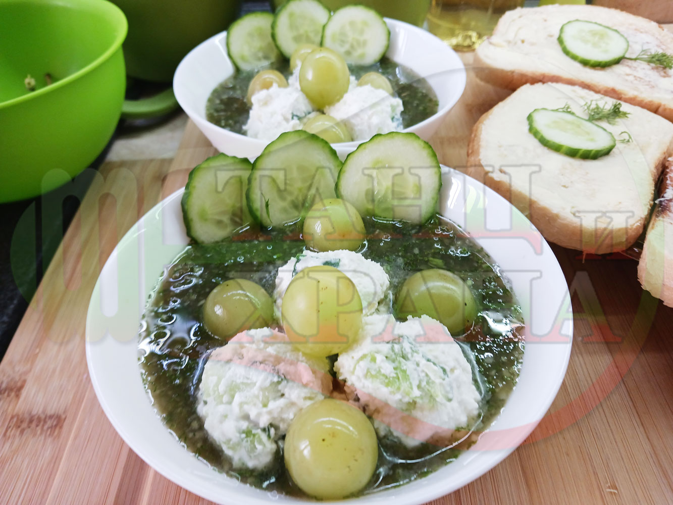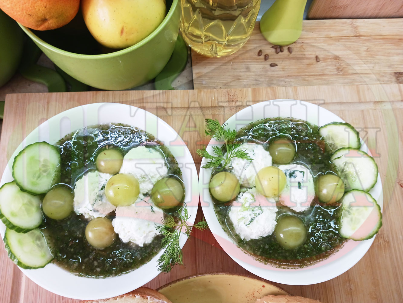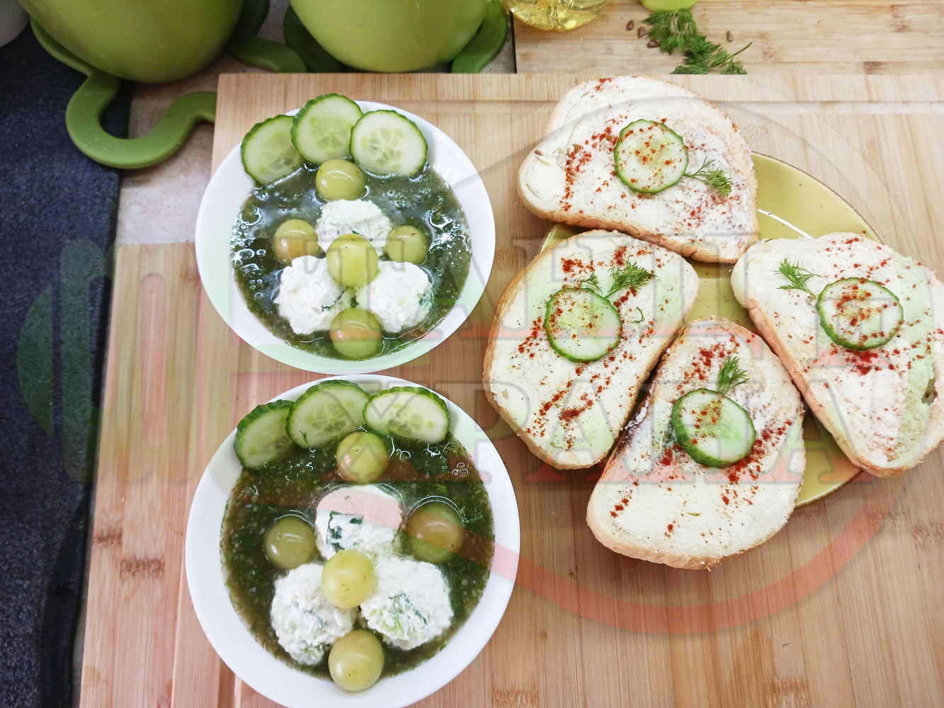 Българска сурова сладко солена супа "Гроздовокопърова сиреновокраставична с БГсирене" приготвена с прясно грозде, краставици и свеж копър гарнирана с топчета от сиреново краставичен крем с краве бяло сирене (българско, саламурено) - двукомпонентна