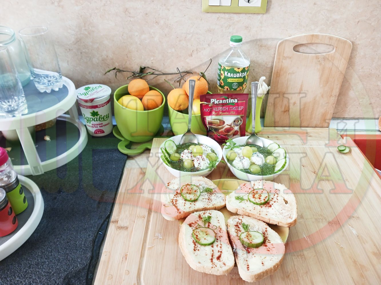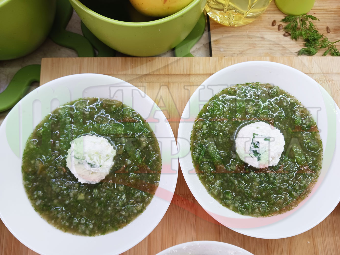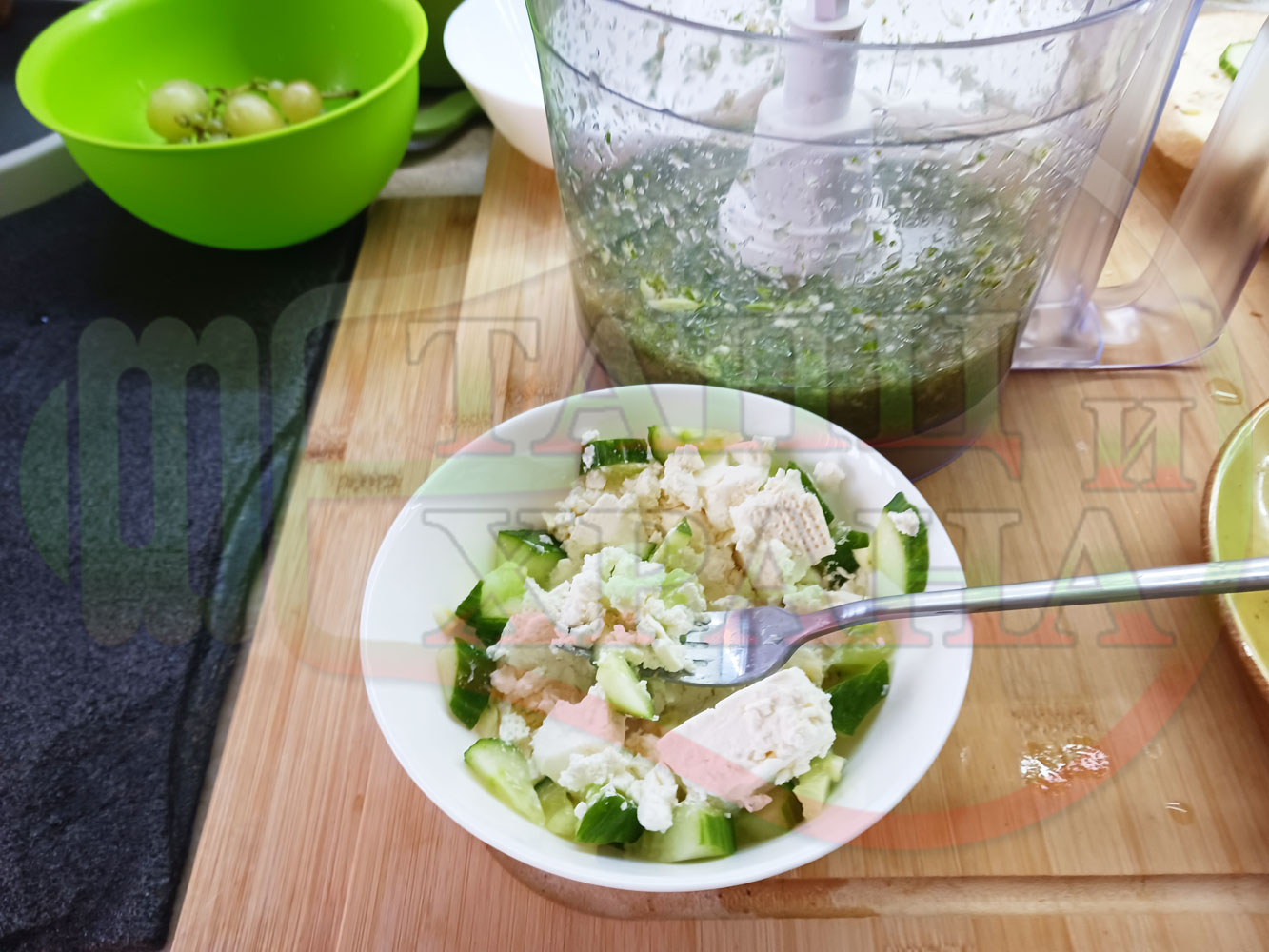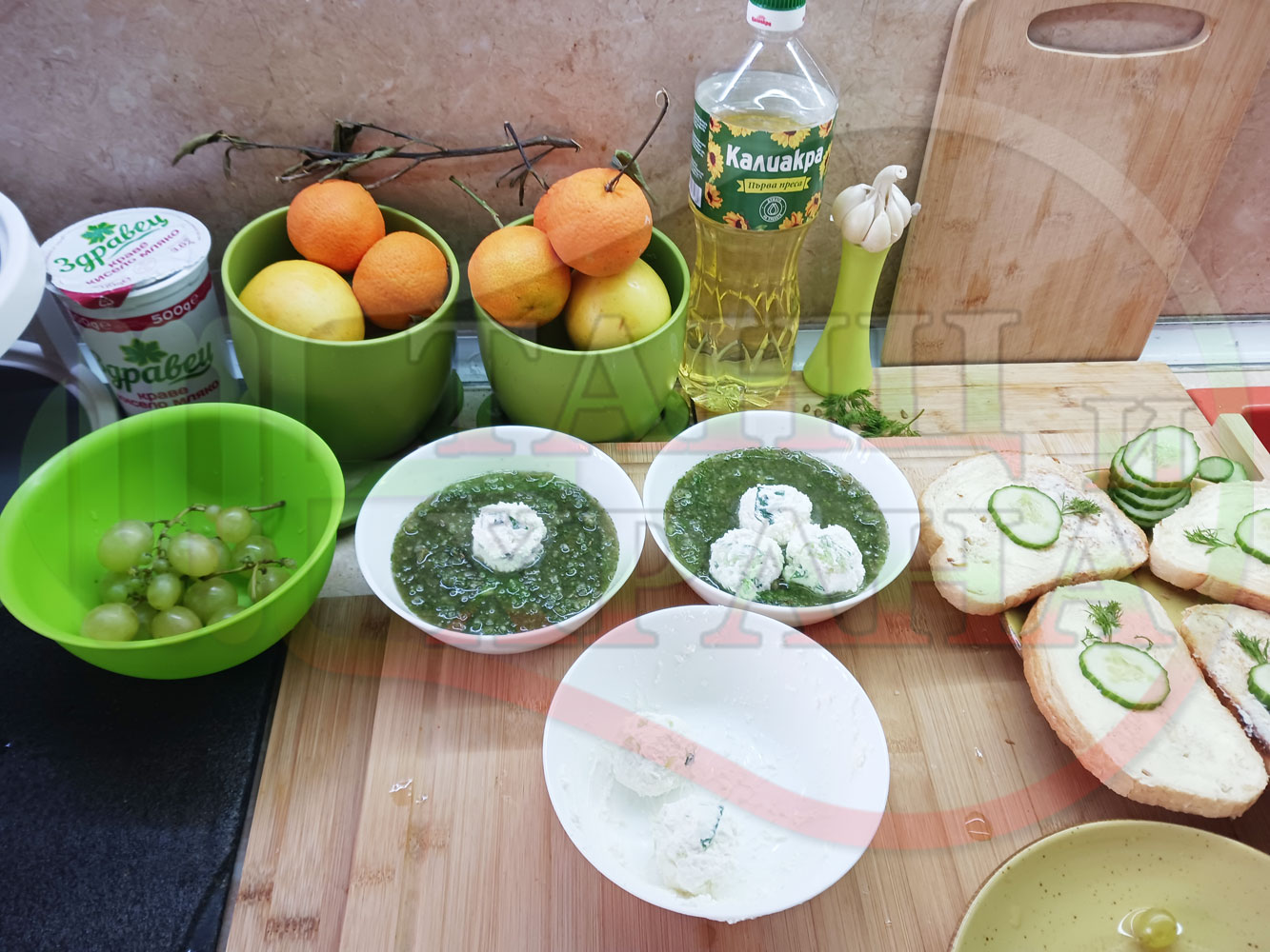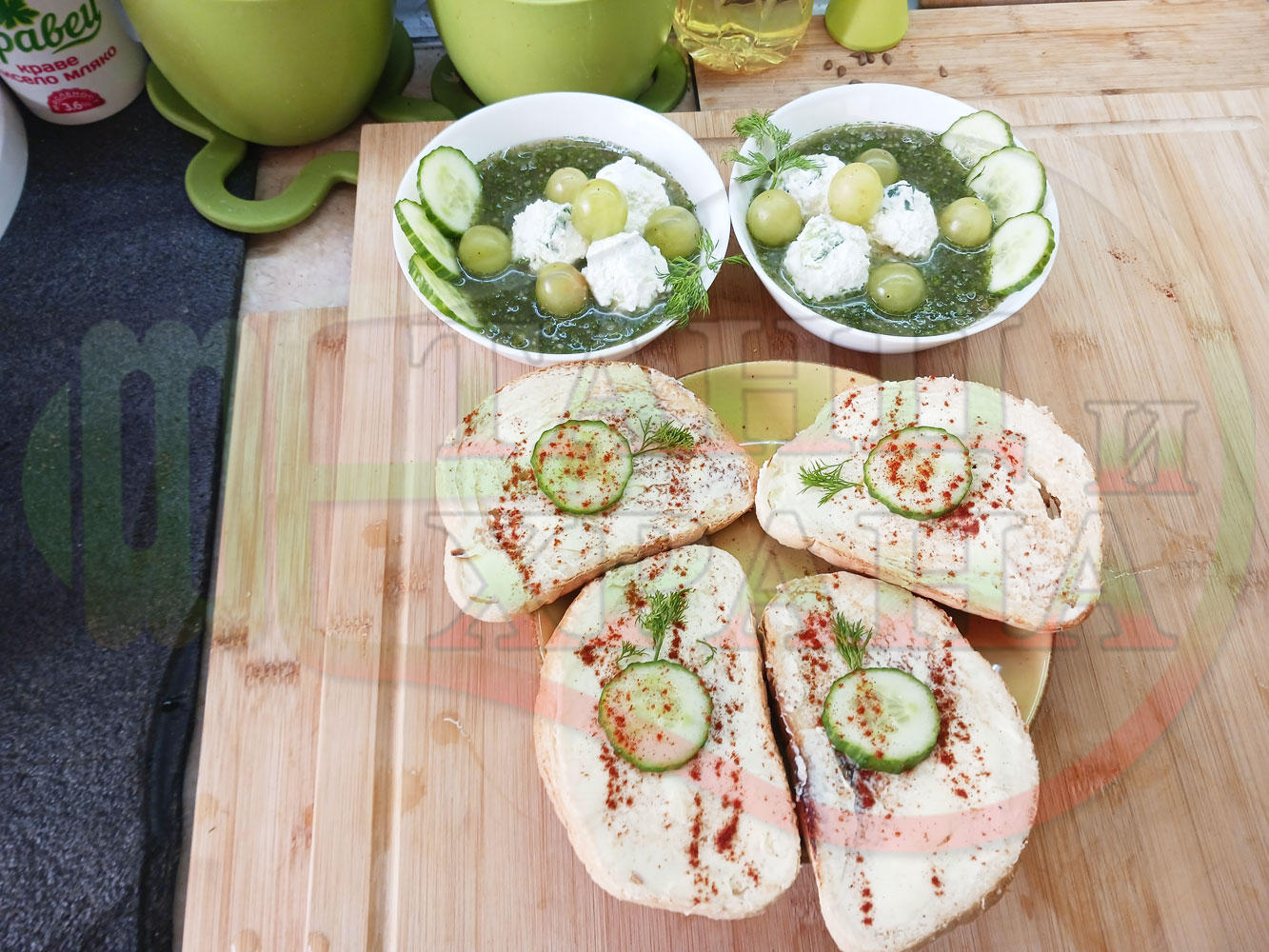 Българска сурова сладко солена супа "Гроздовокопърова сиреновокраставична с БГсирене" приготвена с прясно грозде, краставици и свеж копър гарнирана с топчета от сиреново краставичен крем с краве бяло сирене (българско, саламурено) - двукомпонентна
