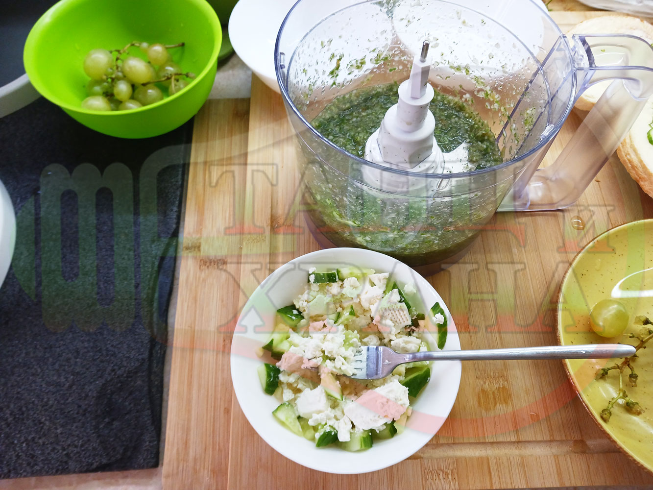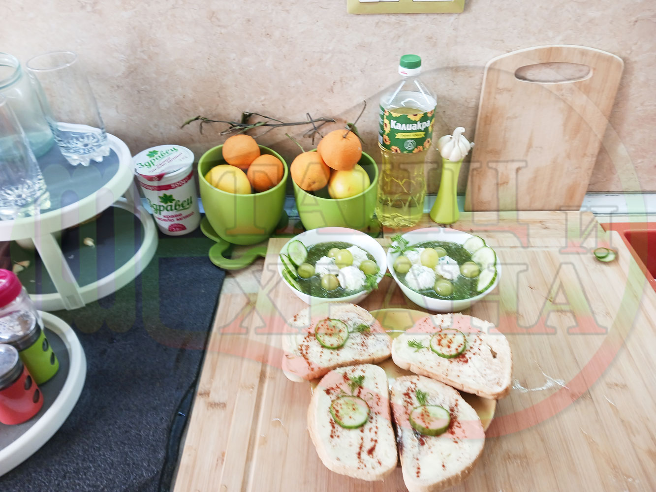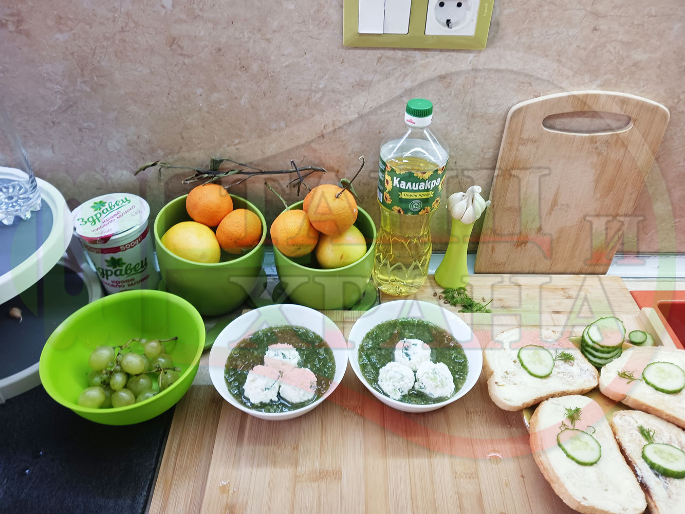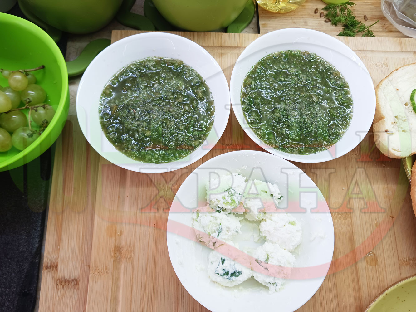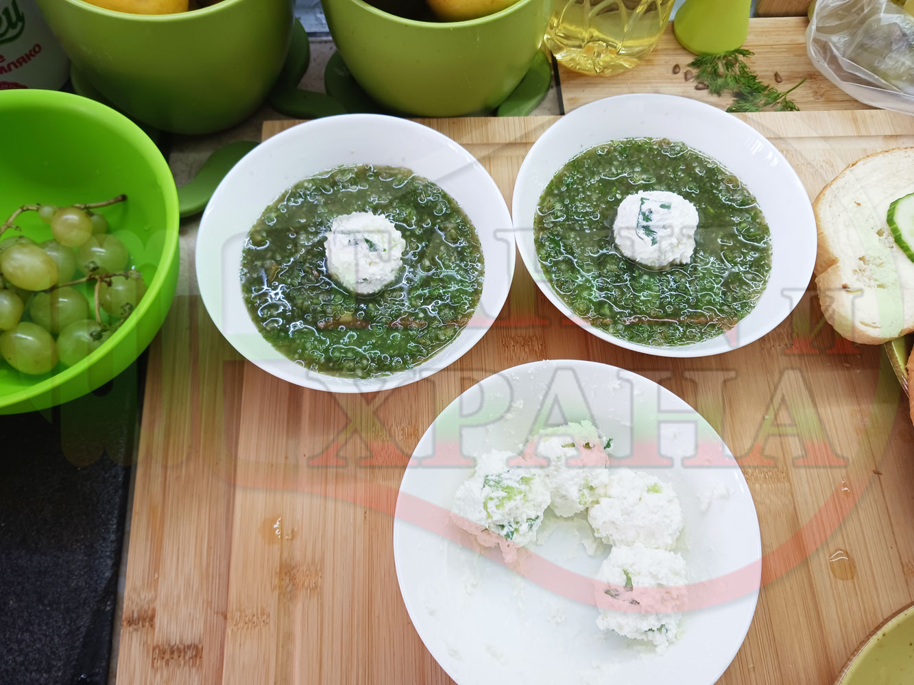 Българска сурова сладко солена супа "Гроздовокопърова сиреновокраставична с БГсирене" приготвена с прясно грозде, краставици и свеж копър гарнирана с топчета от сиреново краставичен крем с краве бяло сирене (българско, саламурено) - двукомпонентна