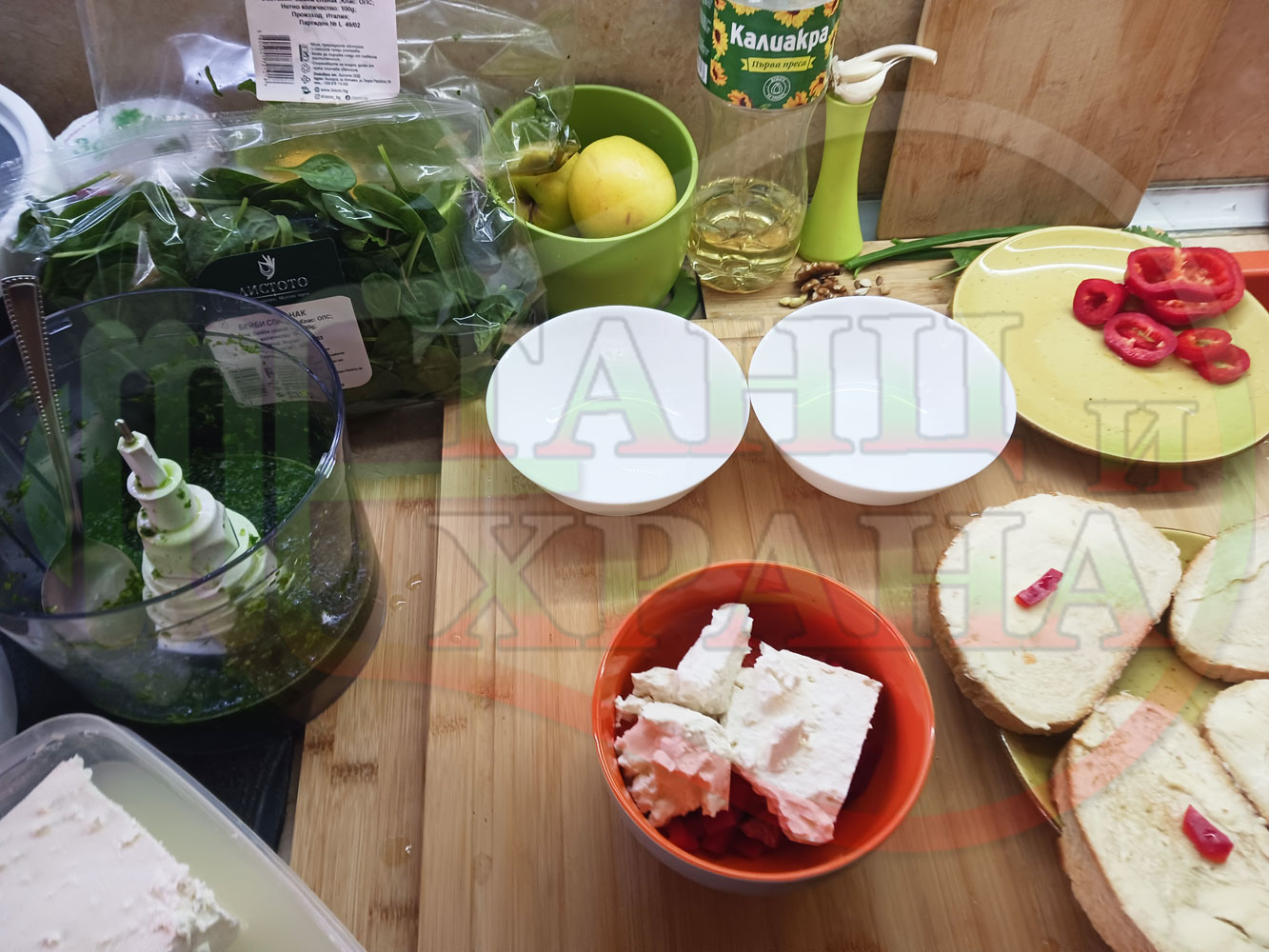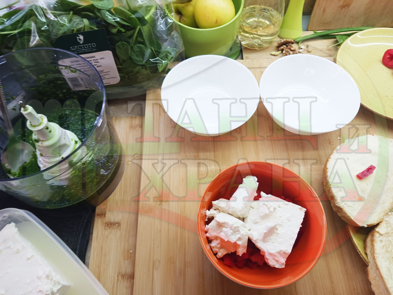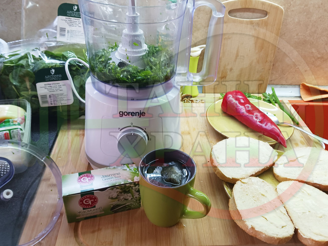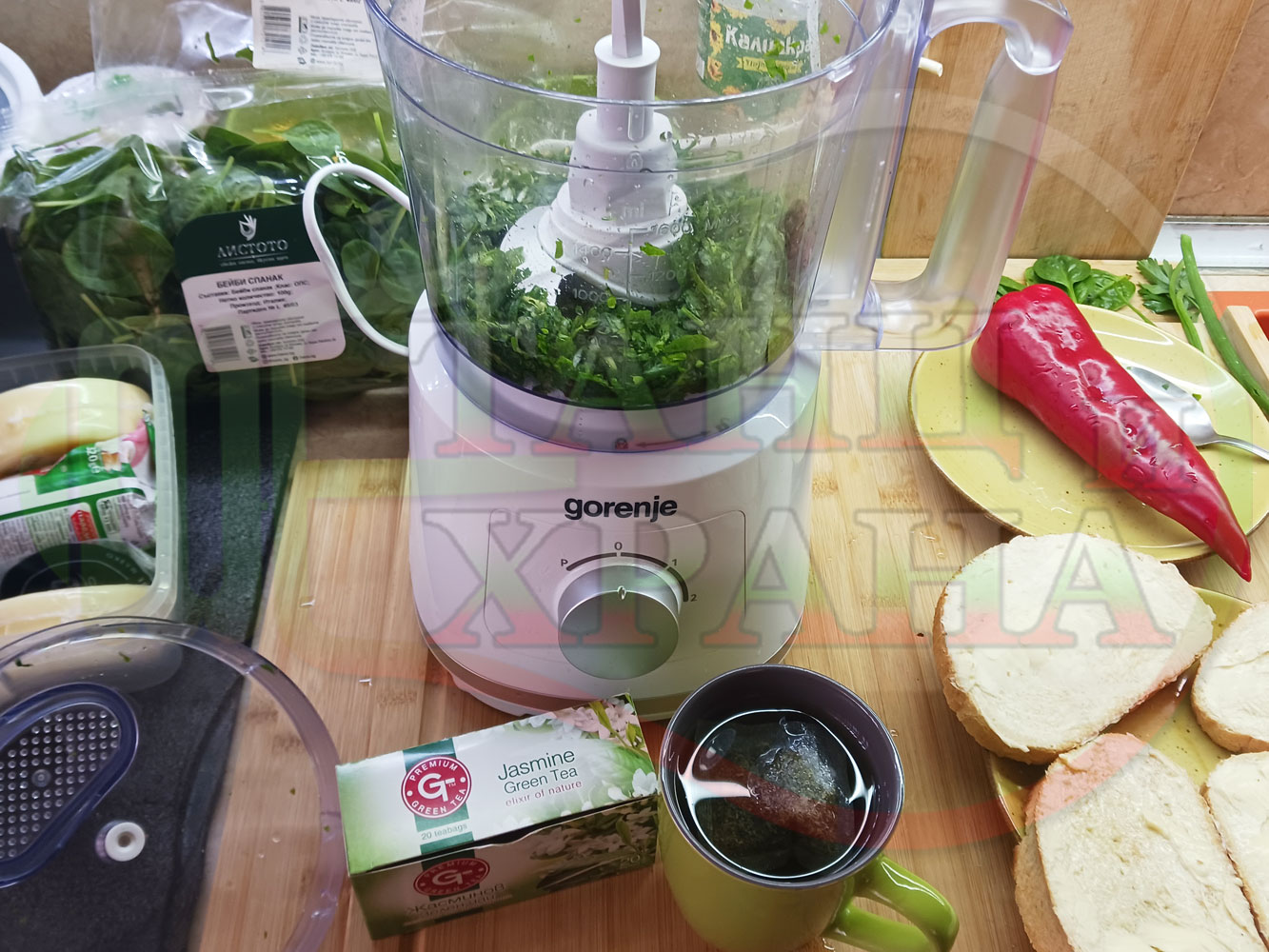 ПРОДУКТИ: Приблизителни количества за българска сурова супа със зелен чай "Спаначеномагданозена пряснолучена червеночушкова с БГсирене" приготвена със свеж спанак, пресен лук и магданоз гарнирана с топчета от сиренов крем с червени пресни чушки и краве бяло сирене - двукомпонентна