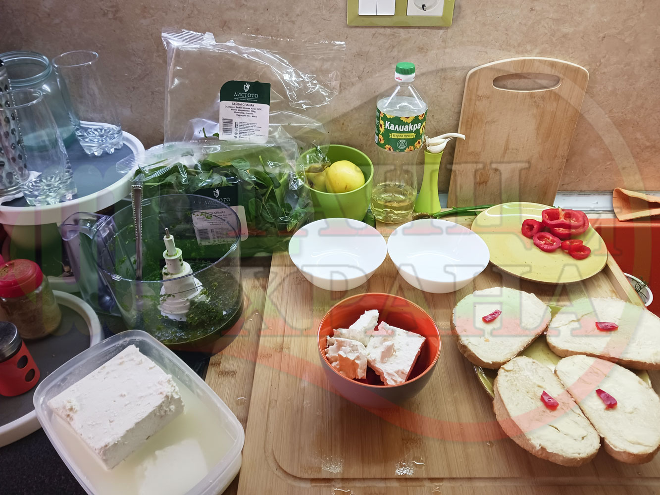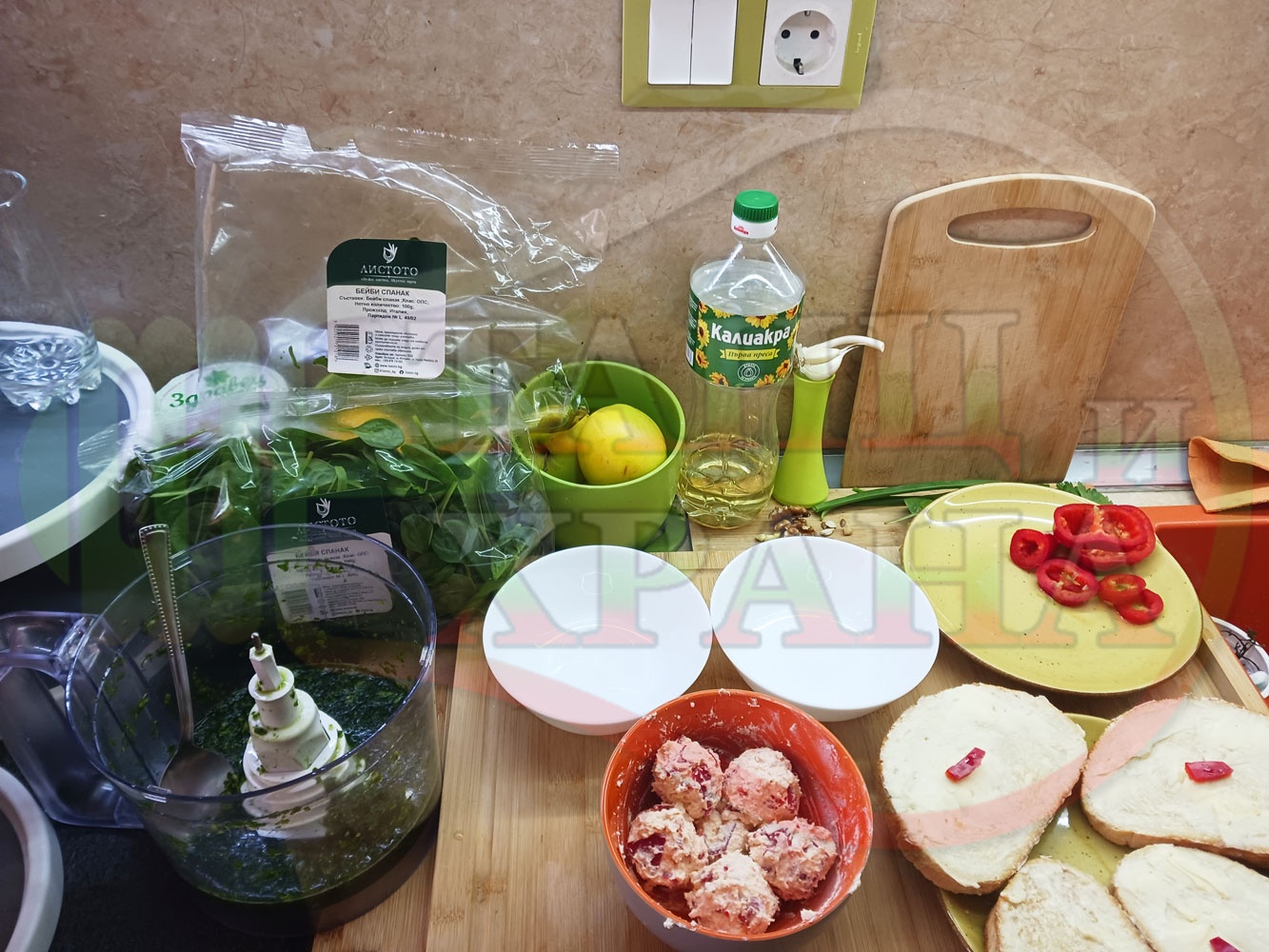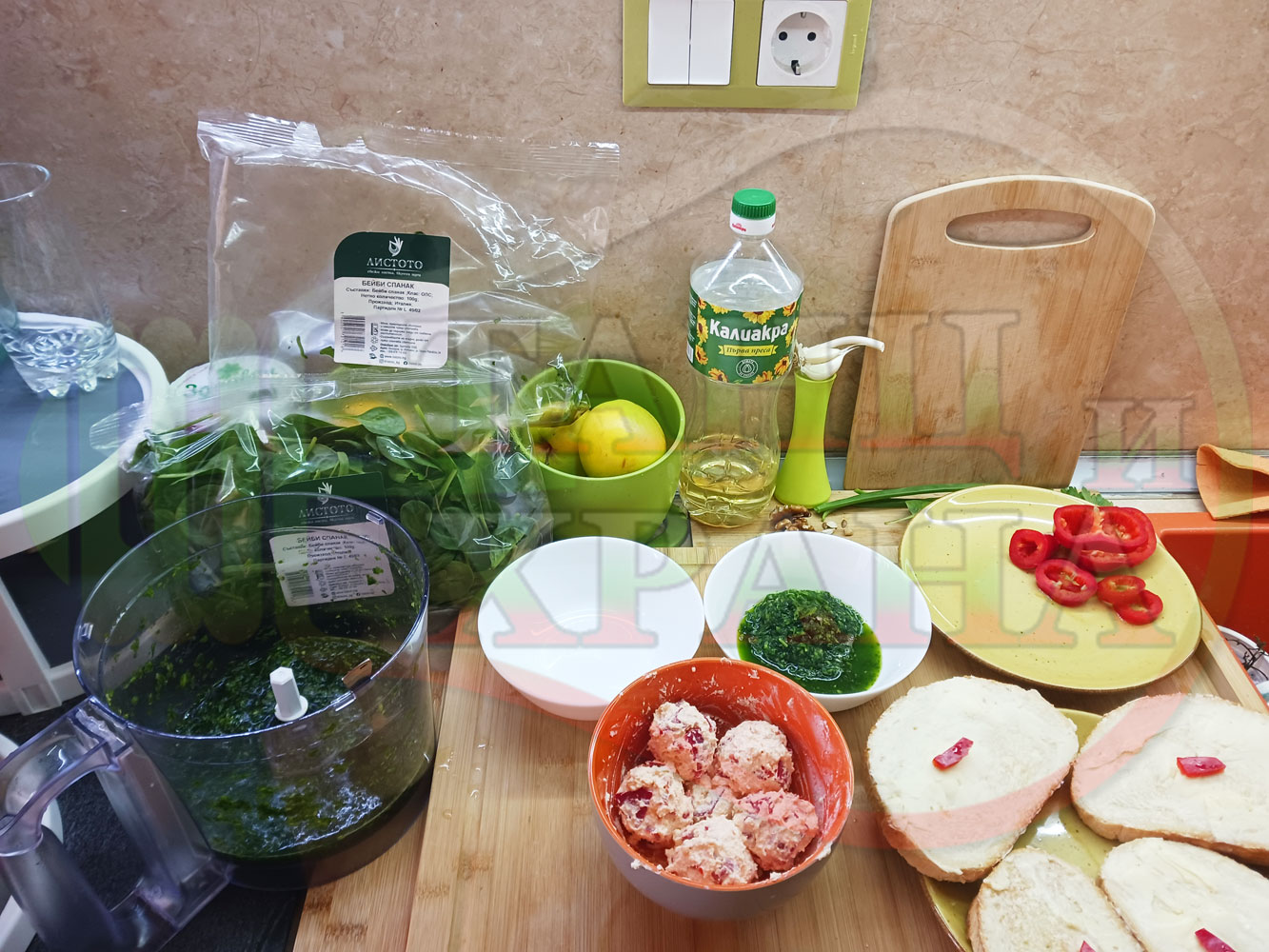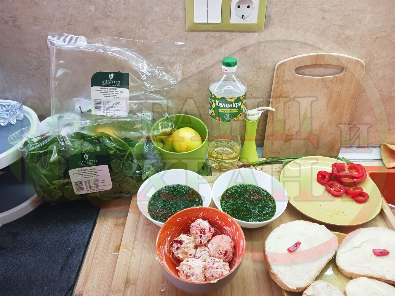 ПРОДУКТИ: Приблизителни количества за българска сурова супа със зелен чай "Спаначеномагданозена пряснолучена червеночушкова с БГсирене" приготвена със свеж спанак, пресен лук и магданоз гарнирана с топчета от сиренов крем с червени пресни чушки и краве бяло сирене - двукомпонентна