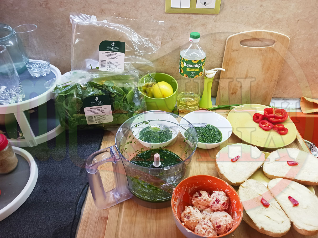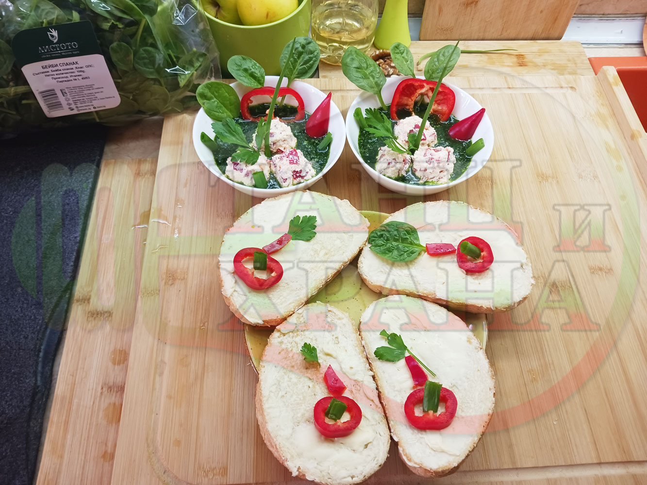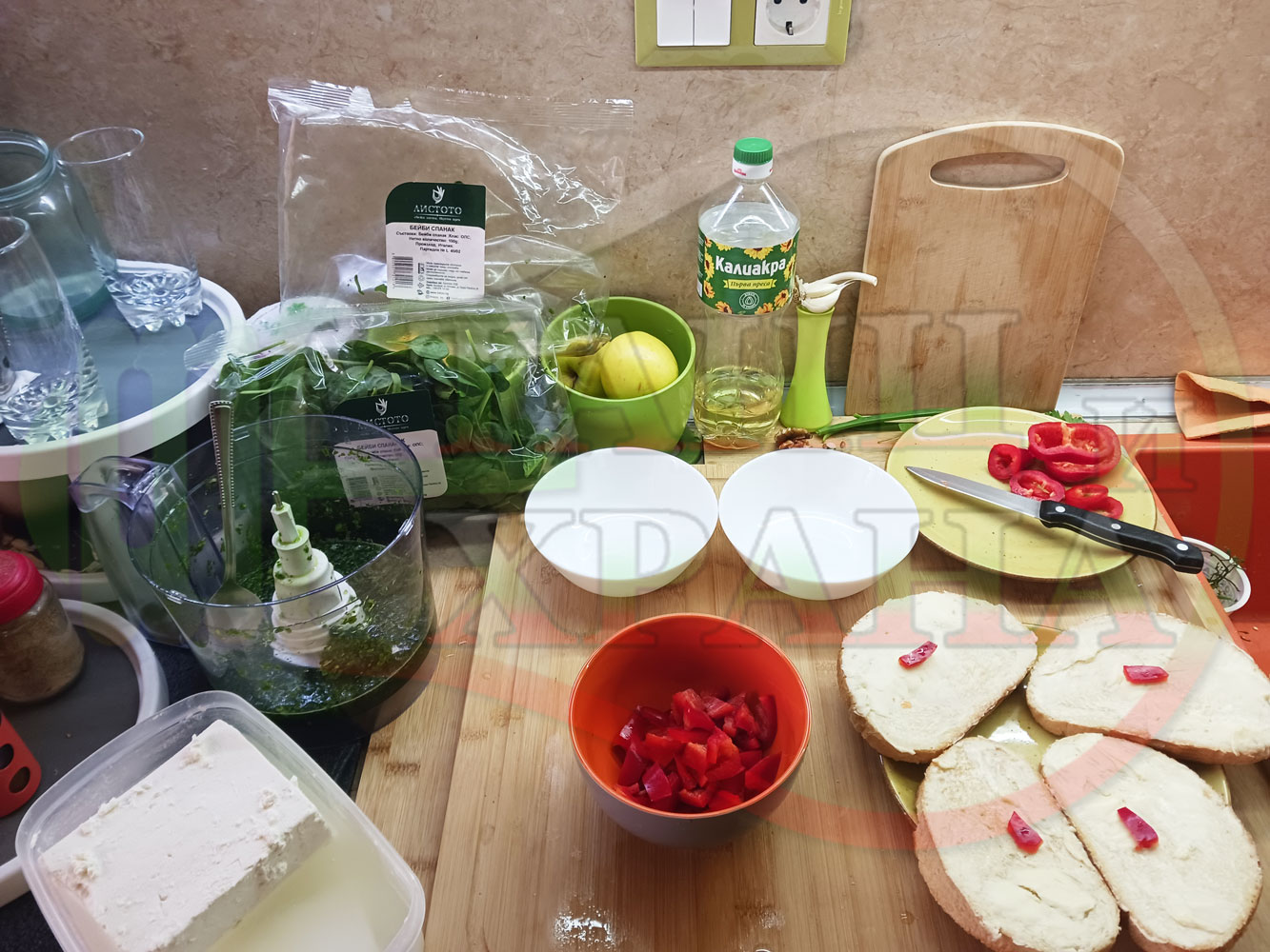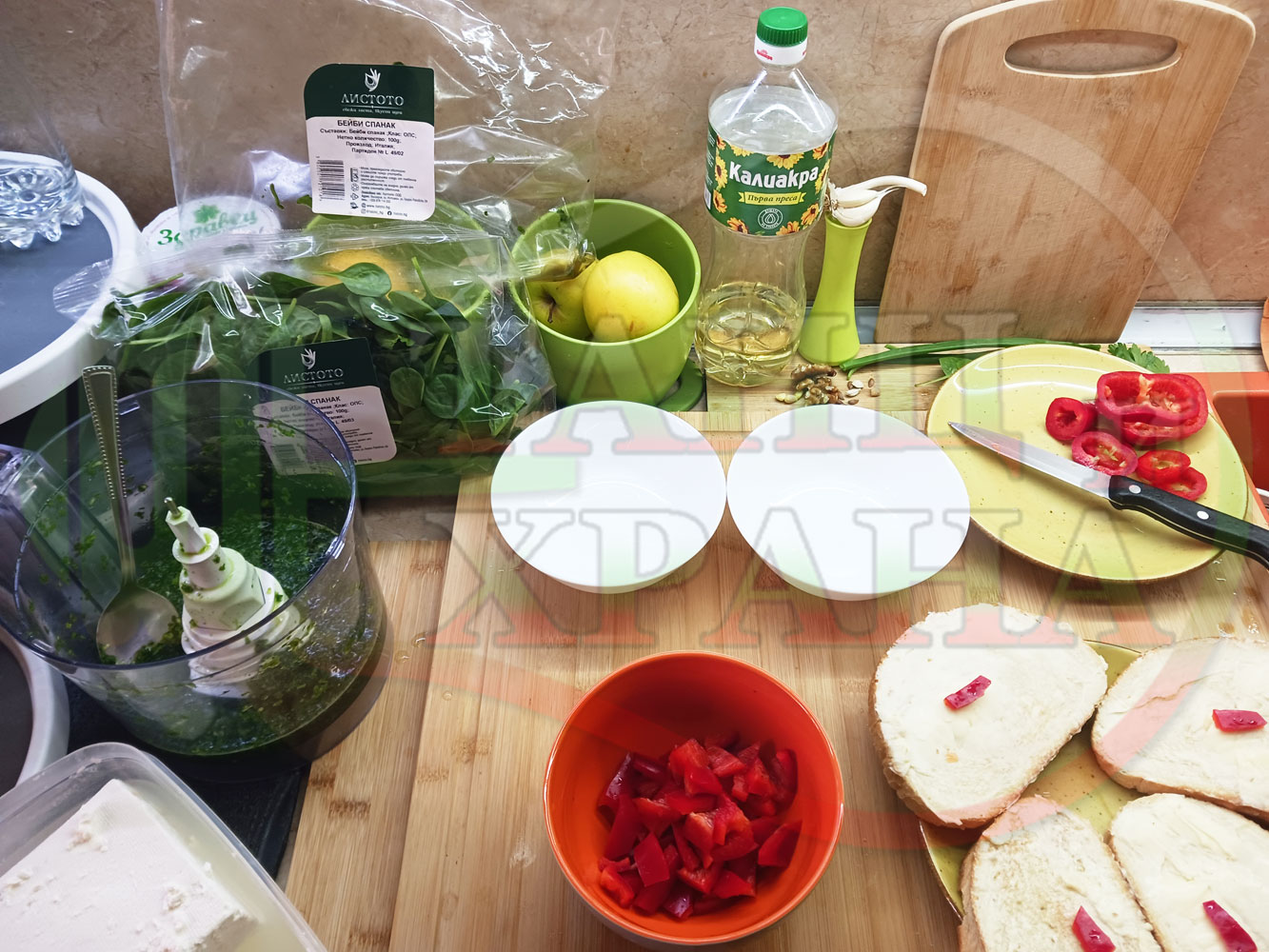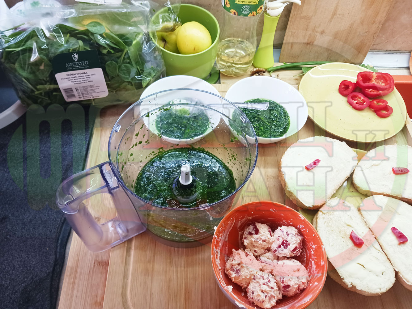 ПРОДУКТИ: Приблизителни количества за българска сурова супа със зелен чай "Спаначеномагданозена пряснолучена червеночушкова с БГсирене" приготвена със свеж спанак, пресен лук и магданоз гарнирана с топчета от сиренов крем с червени пресни чушки и краве бяло сирене - двукомпонентна
