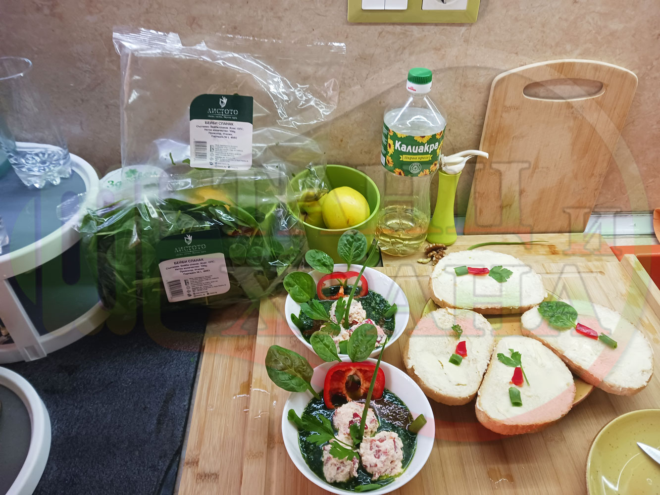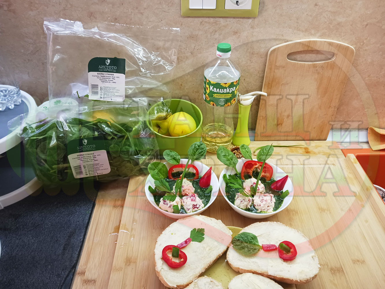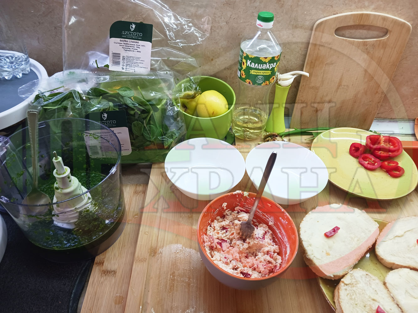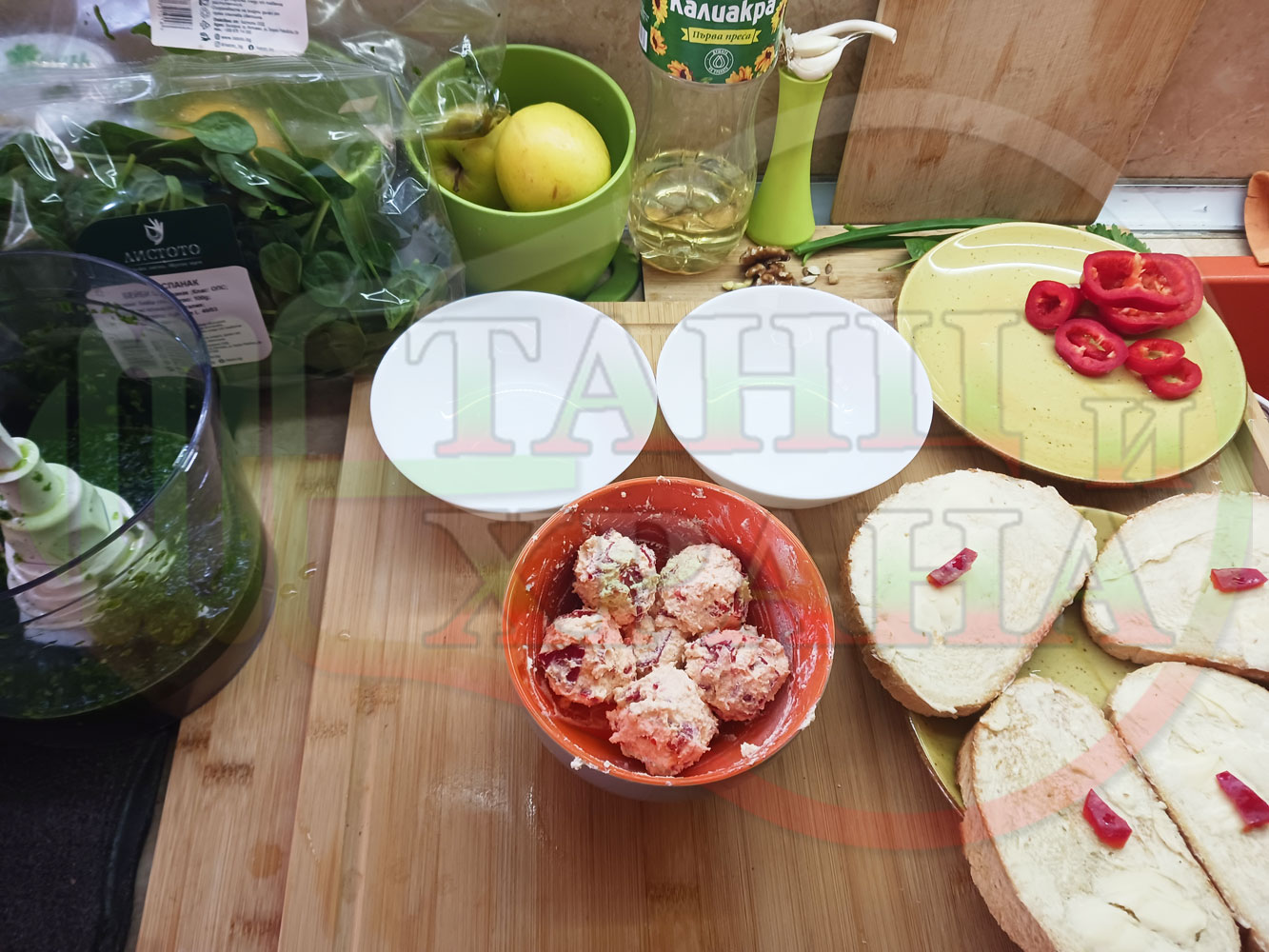 ПРОДУКТИ: Приблизителни количества за българска сурова супа със зелен чай "Спаначеномагданозена пряснолучена червеночушкова с БГсирене" приготвена със свеж спанак, пресен лук и магданоз гарнирана с топчета от сиренов крем с червени пресни чушки и краве бяло сирене - двукомпонентна