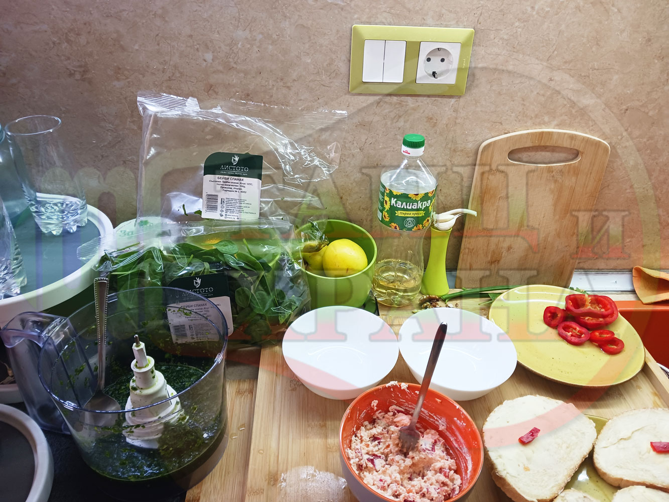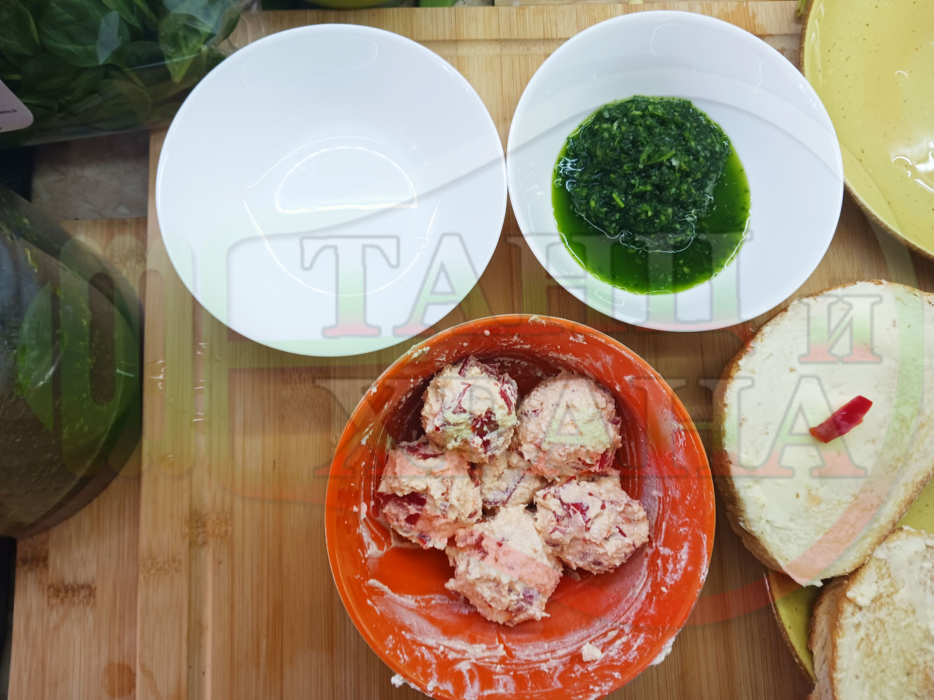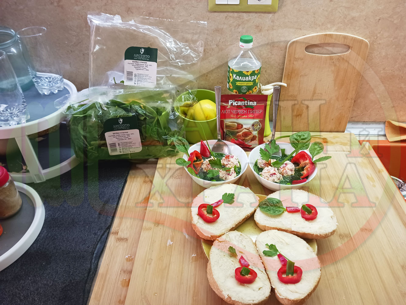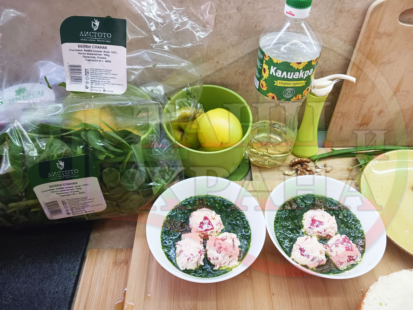 ПРОДУКТИ: Приблизителни количества за българска сурова супа със зелен чай "Спаначеномагданозена пряснолучена червеночушкова с БГсирене" приготвена със свеж спанак, пресен лук и магданоз гарнирана с топчета от сиренов крем с червени пресни чушки и краве бяло сирене - двукомпонентна