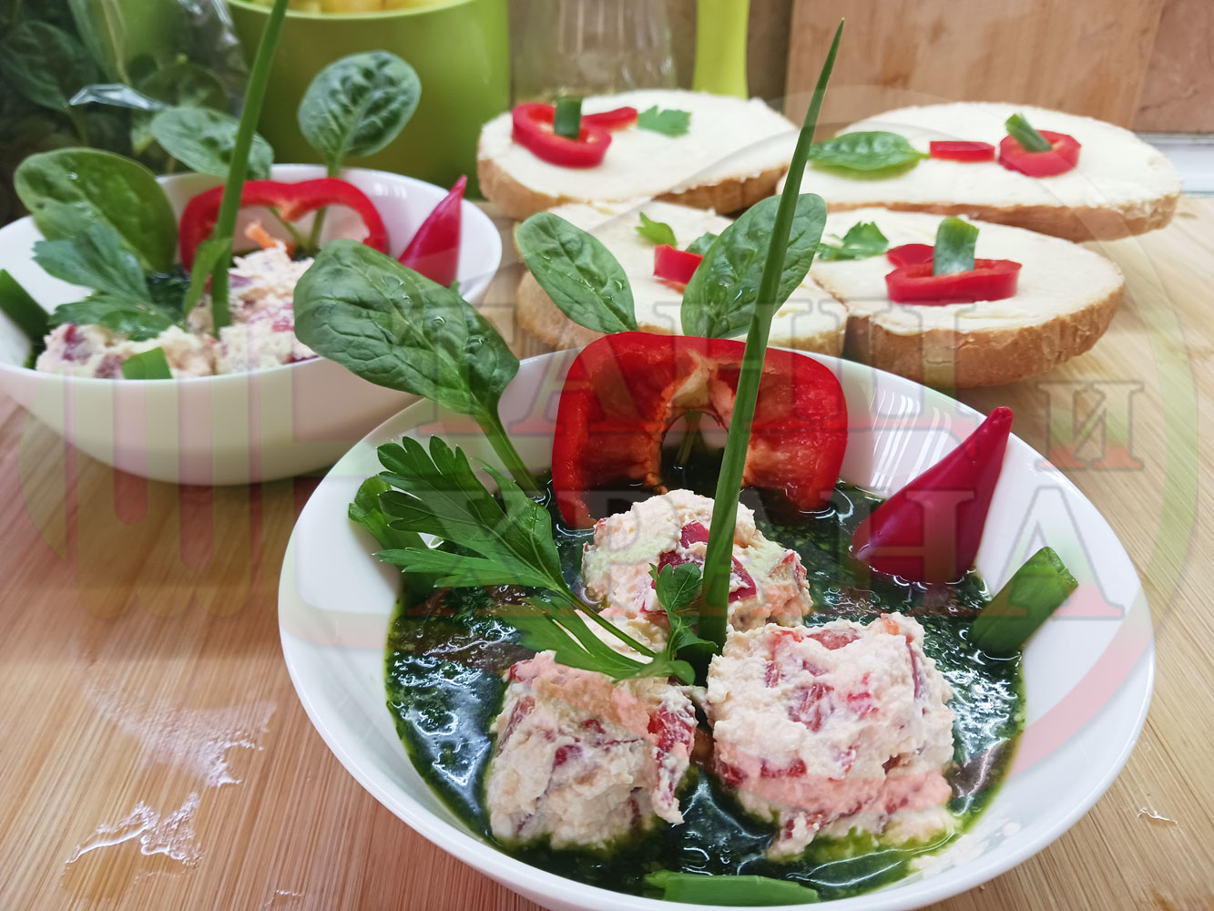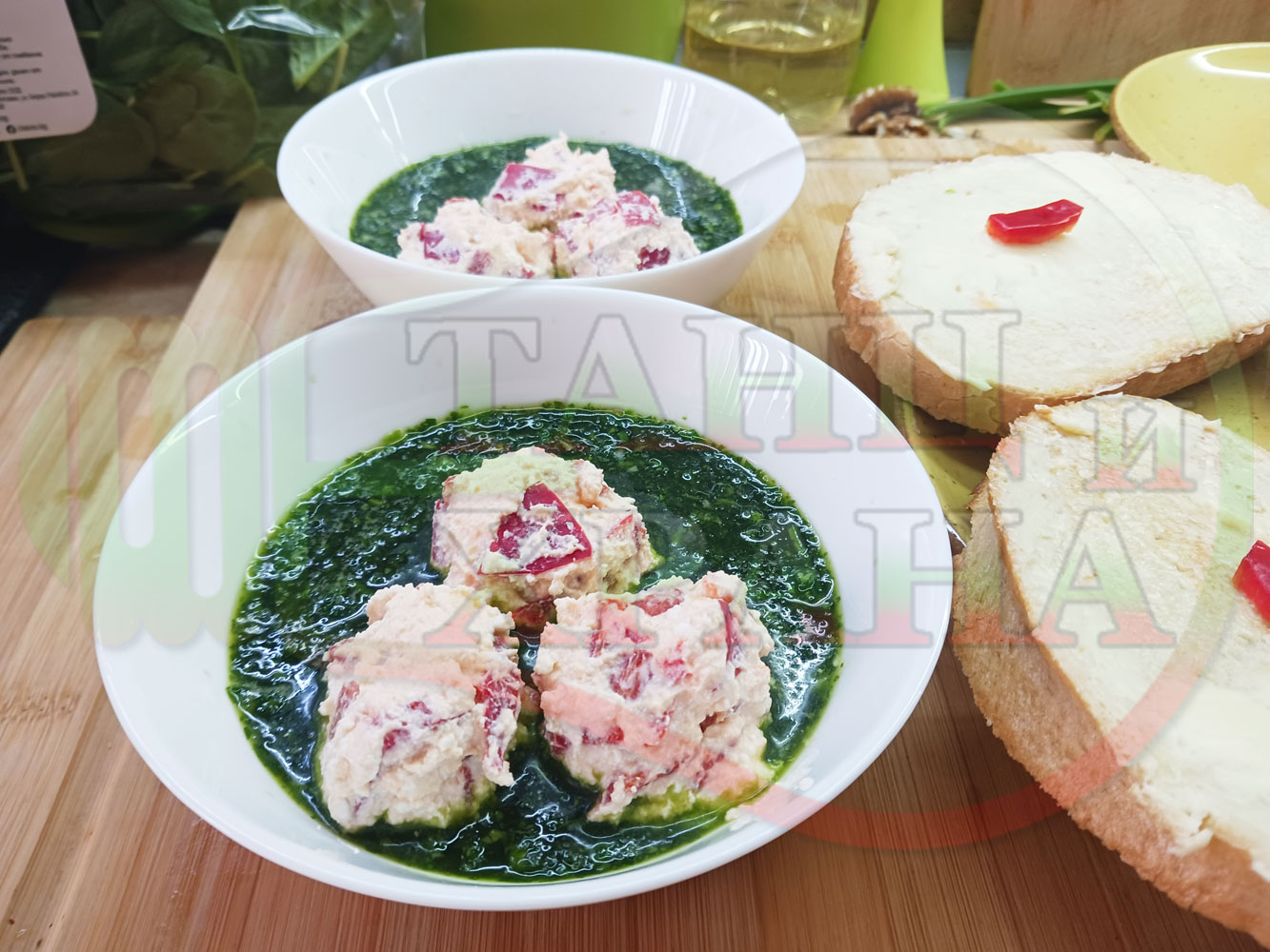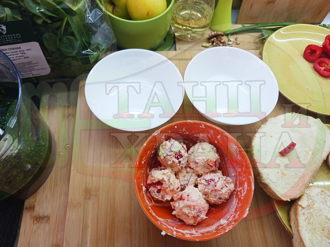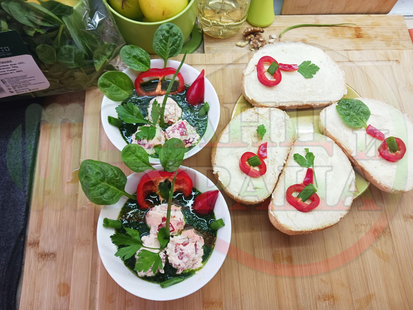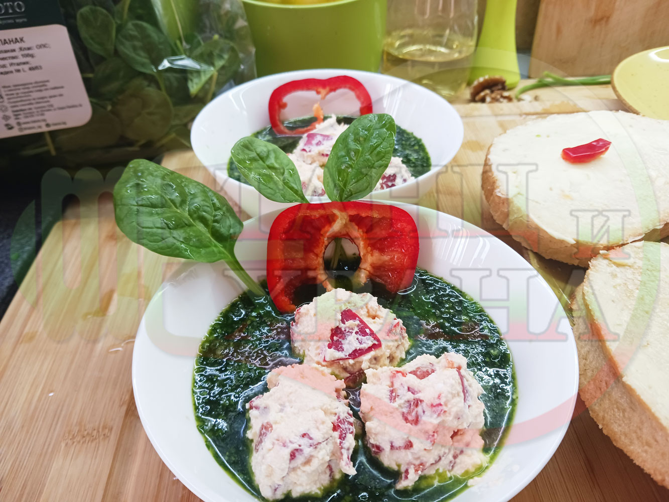 Спретнах поредната изключително вкусна и полезна сурова спаначена супа с идеална хармония и баланс между зеленчуците и българското краве бяло саламурено сирене. Оформих топчета от сиреново червеночушков крем с червени пресни чушки и българско краве бяло сирене, с които гарнирах супите. Сиреновите топчета се разтварят постепенно при хапване, насищайки спаначеномагданозената супа със солената саламура от сиренето, дообогатена със сладостта и леката хрупкавост на червената прясна чушка. Зеленият жасминов чай допълва сладостта от чушката и дообогатява вкуса на супата с нежен аромат на жасмин. Отново се получи невероятно вкусно, вкусна, вкусотия (вкуснотия)...