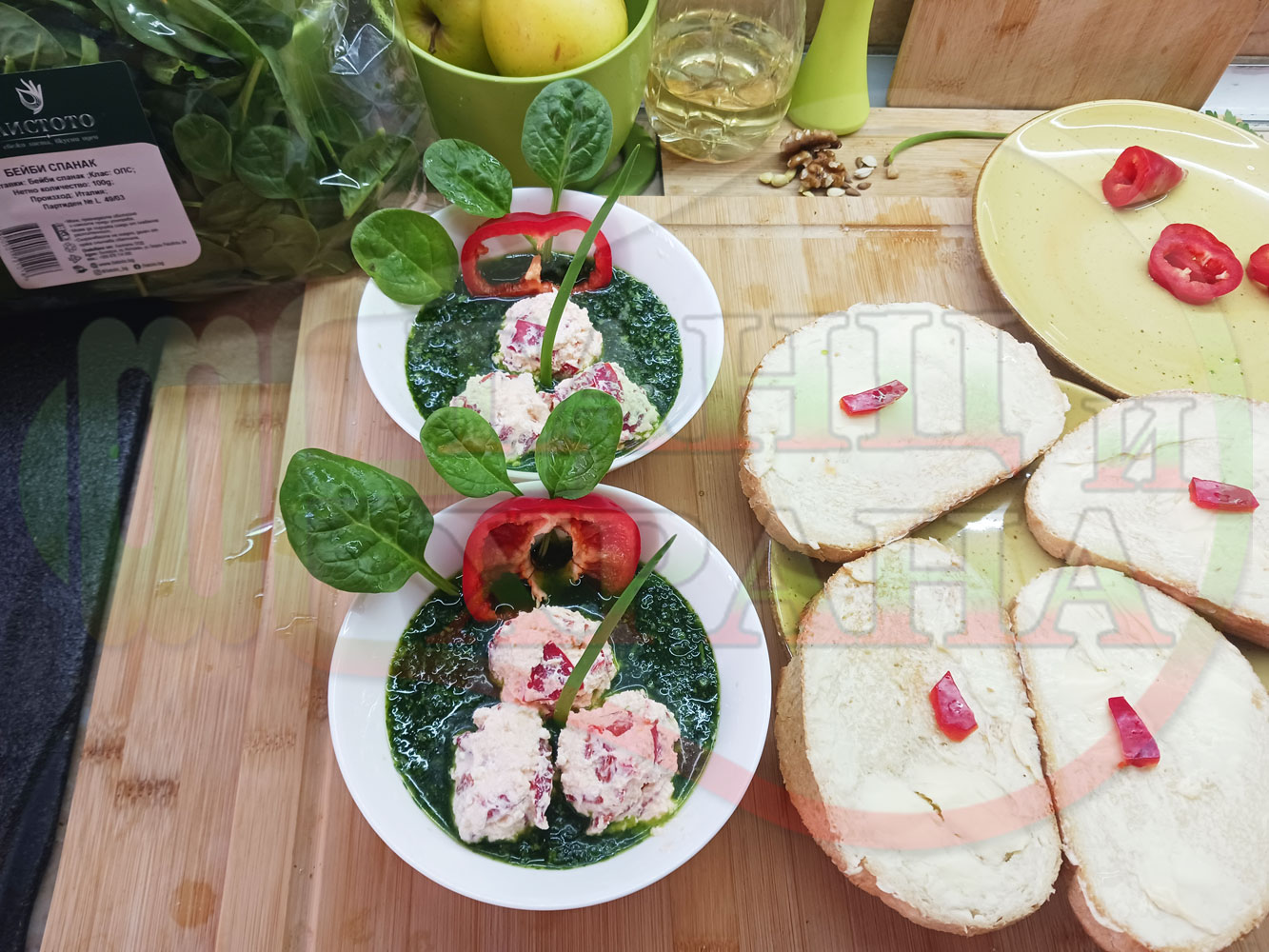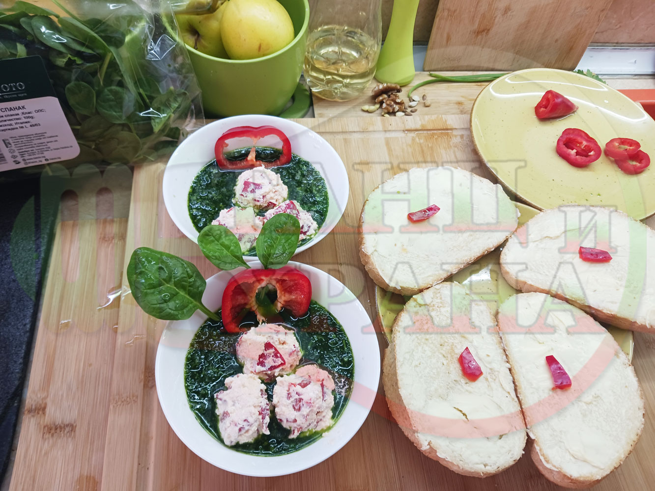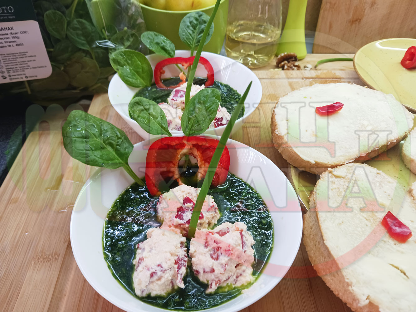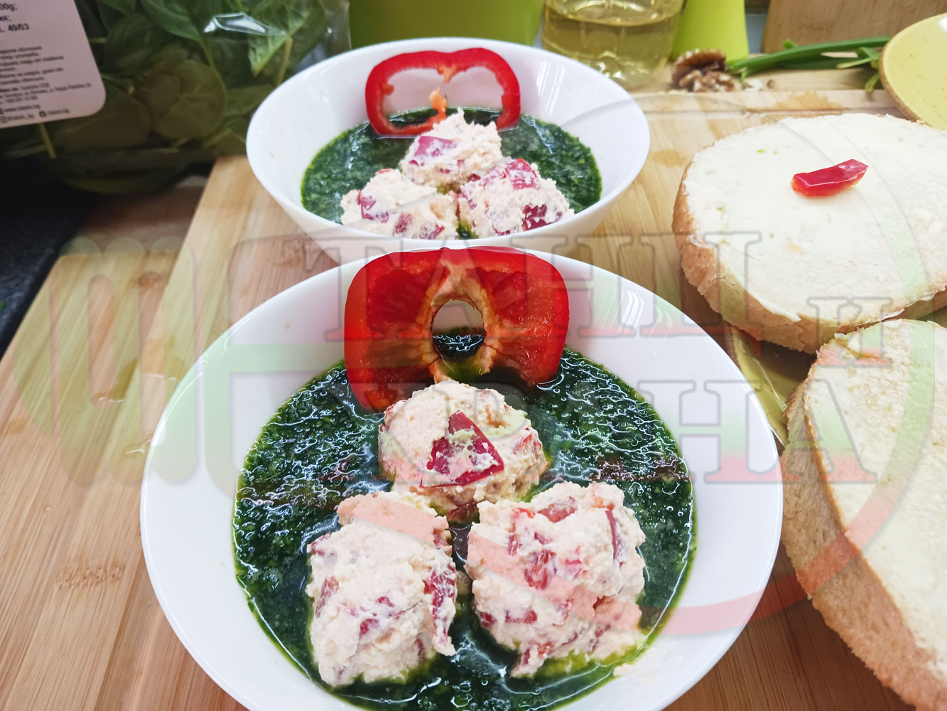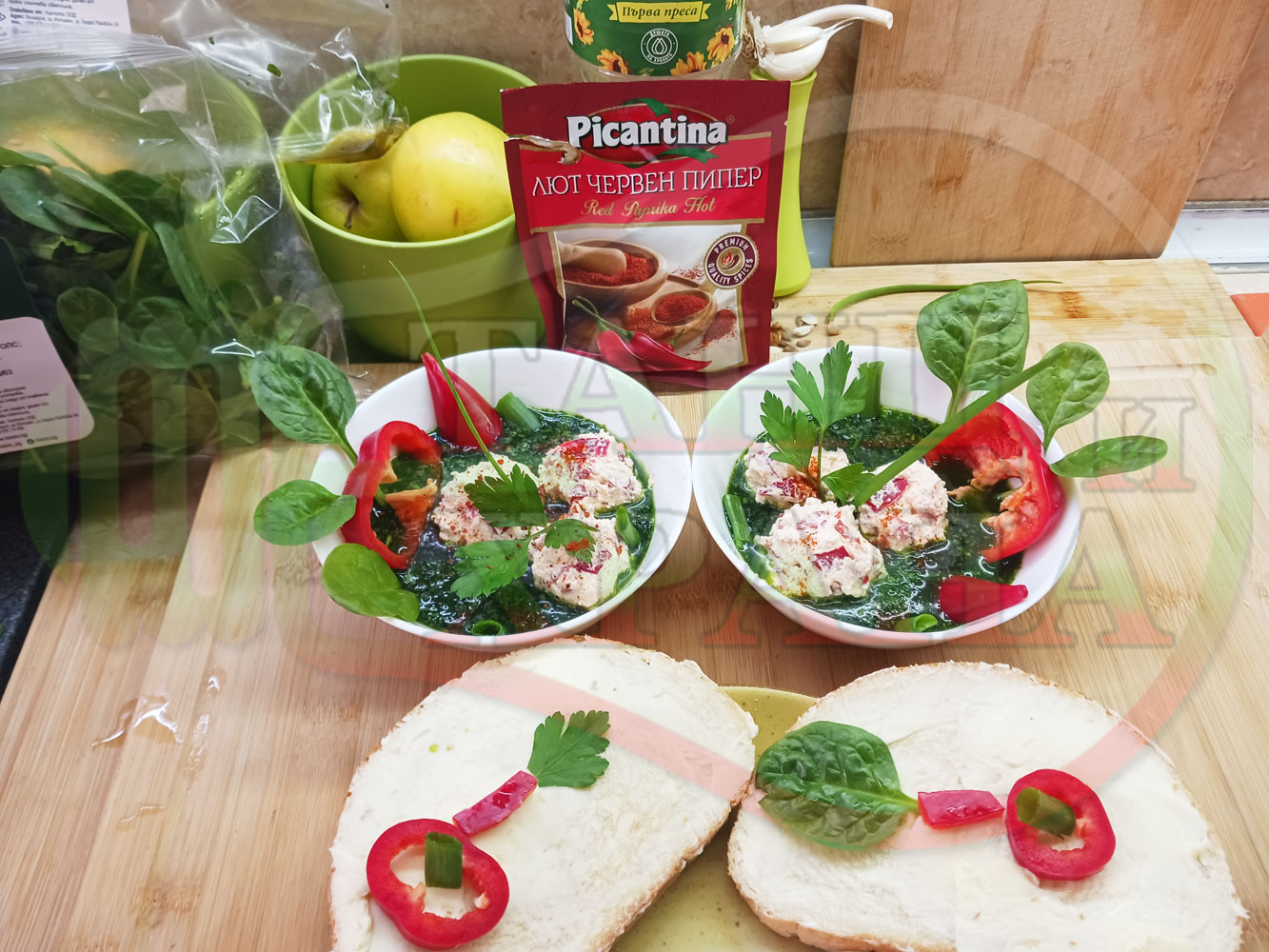 Спретнах поредната изключително вкусна и полезна сурова спаначена супа с идеална хармония и баланс между зеленчуците и българското краве бяло саламурено сирене. Оформих топчета от сиреново червеночушков крем с червени пресни чушки и българско краве бяло сирене, с които гарнирах супите. Сиреновите топчета се разтварят постепенно при хапване, насищайки спаначеномагданозената супа със солената саламура от сиренето, дообогатена със сладостта и леката хрупкавост на червената прясна чушка. Зеленият жасминов чай допълва сладостта от чушката и дообогатява вкуса на супата с нежен аромат на жасмин. Отново се получи невероятно вкусно, вкусна, вкусотия (вкуснотия)...