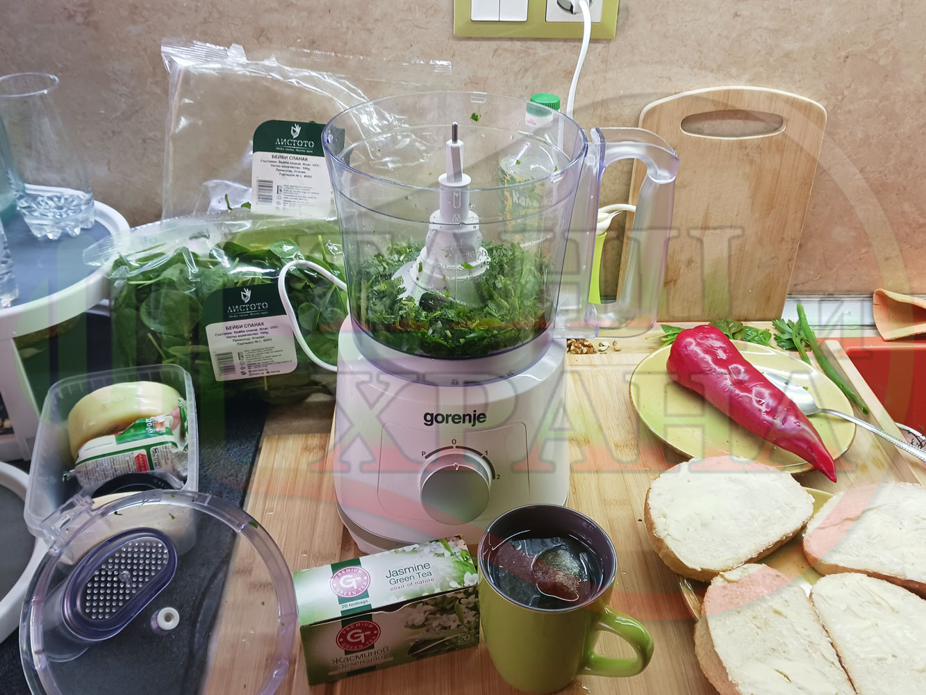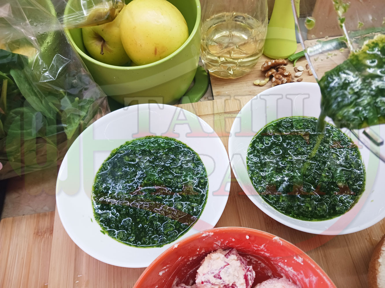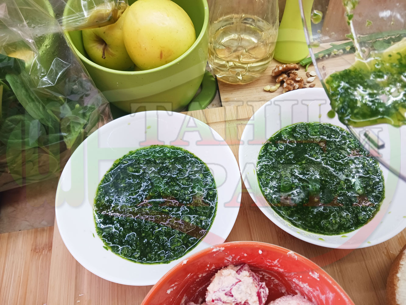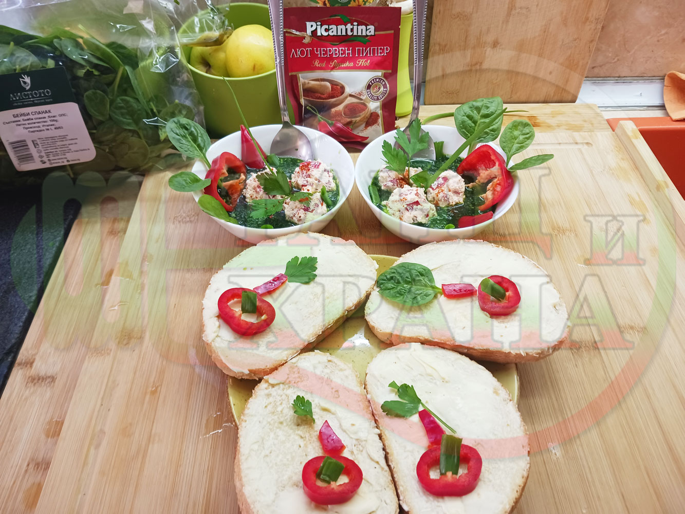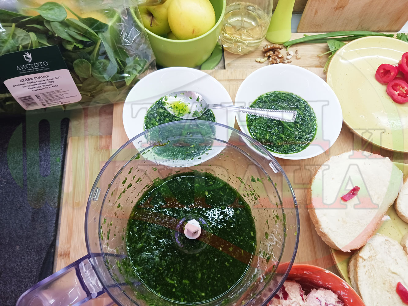 Спретнах поредната изключително вкусна и полезна сурова спаначена супа с идеална хармония и баланс между зеленчуците и българското краве бяло саламурено сирене. Оформих топчета от сиреново червеночушков крем с червени пресни чушки и българско краве бяло сирене, с които гарнирах супите. Сиреновите топчета се разтварят постепенно при хапване, насищайки спаначеномагданозената супа със солената саламура от сиренето, дообогатена със сладостта и леката хрупкавост на червената прясна чушка. Зеленият жасминов чай допълва сладостта от чушката и дообогатява вкуса на супата с нежен аромат на жасмин. Отново се получи невероятно вкусно, вкусна, вкусотия (вкуснотия)...