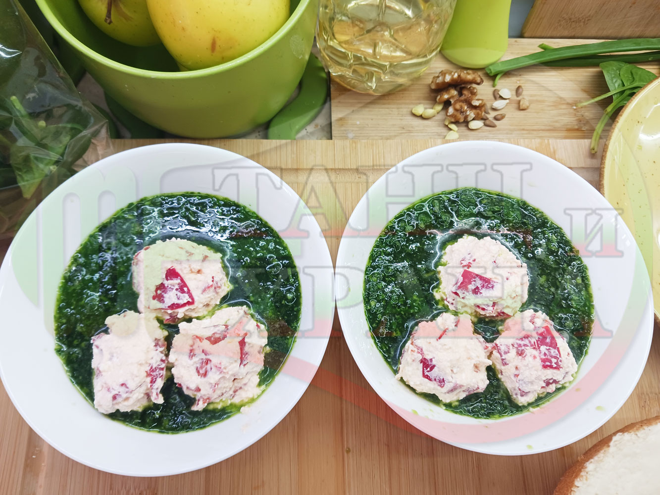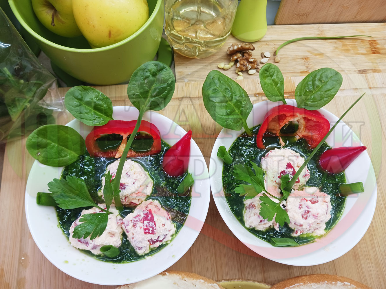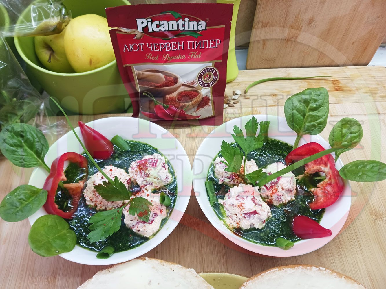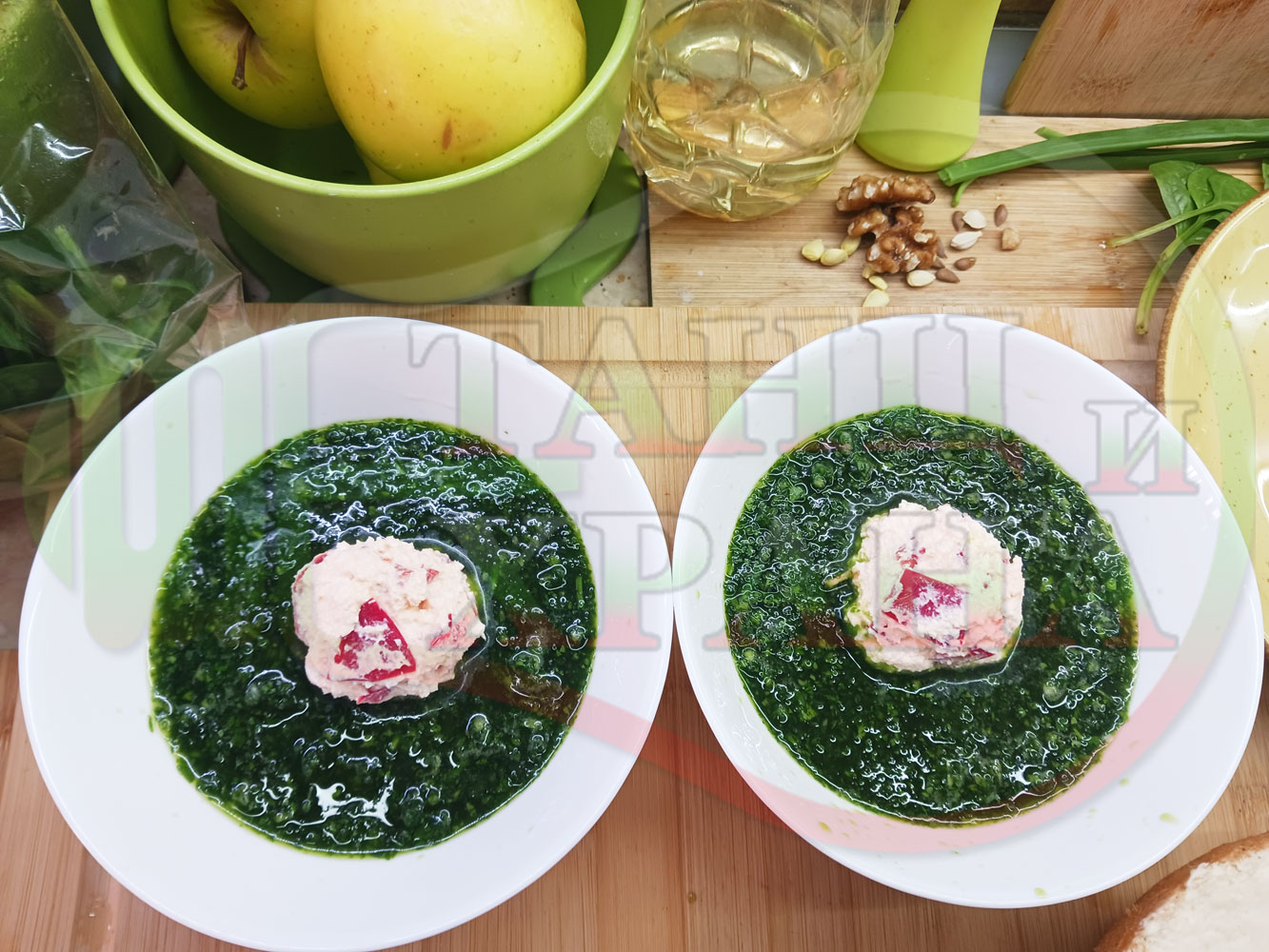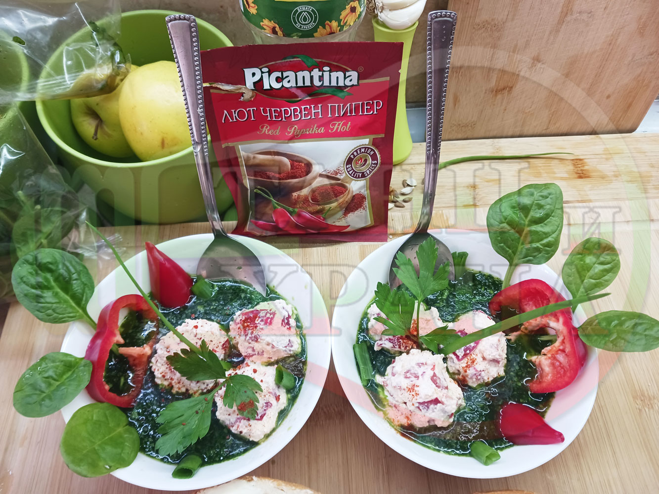 Българска сурова супа със зелен чай "Спаначеномагданозена пряснолучена червеночушкова с БГсирене" приготвена със свеж спанак, пресен лук и магданоз гарнирана с топчета от сиренов крем с червени пресни чушки и краве бяло сирене - двукомпонентна