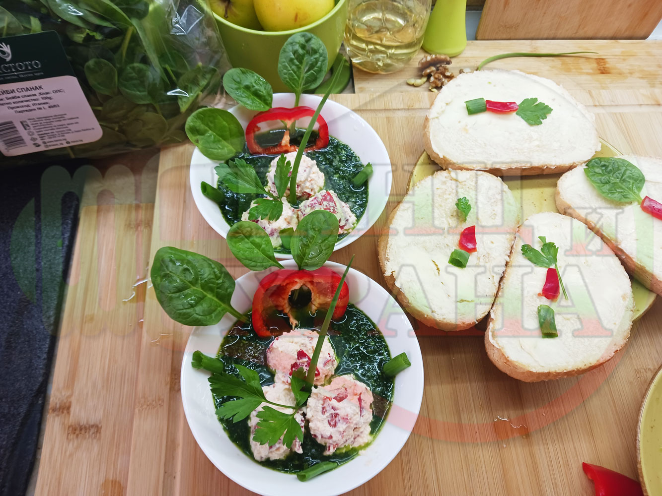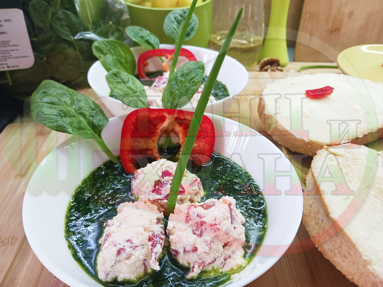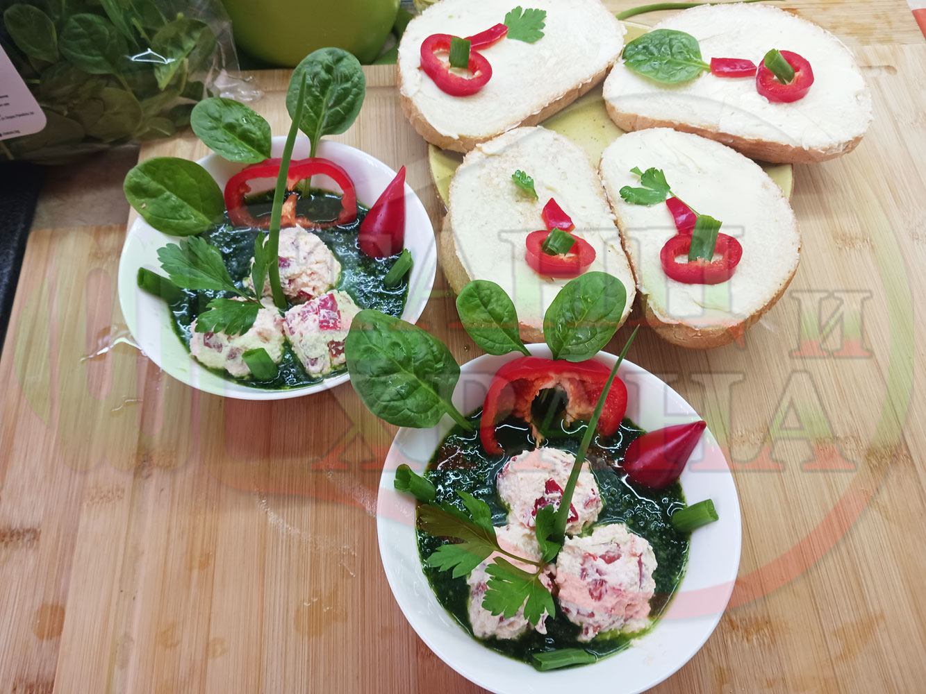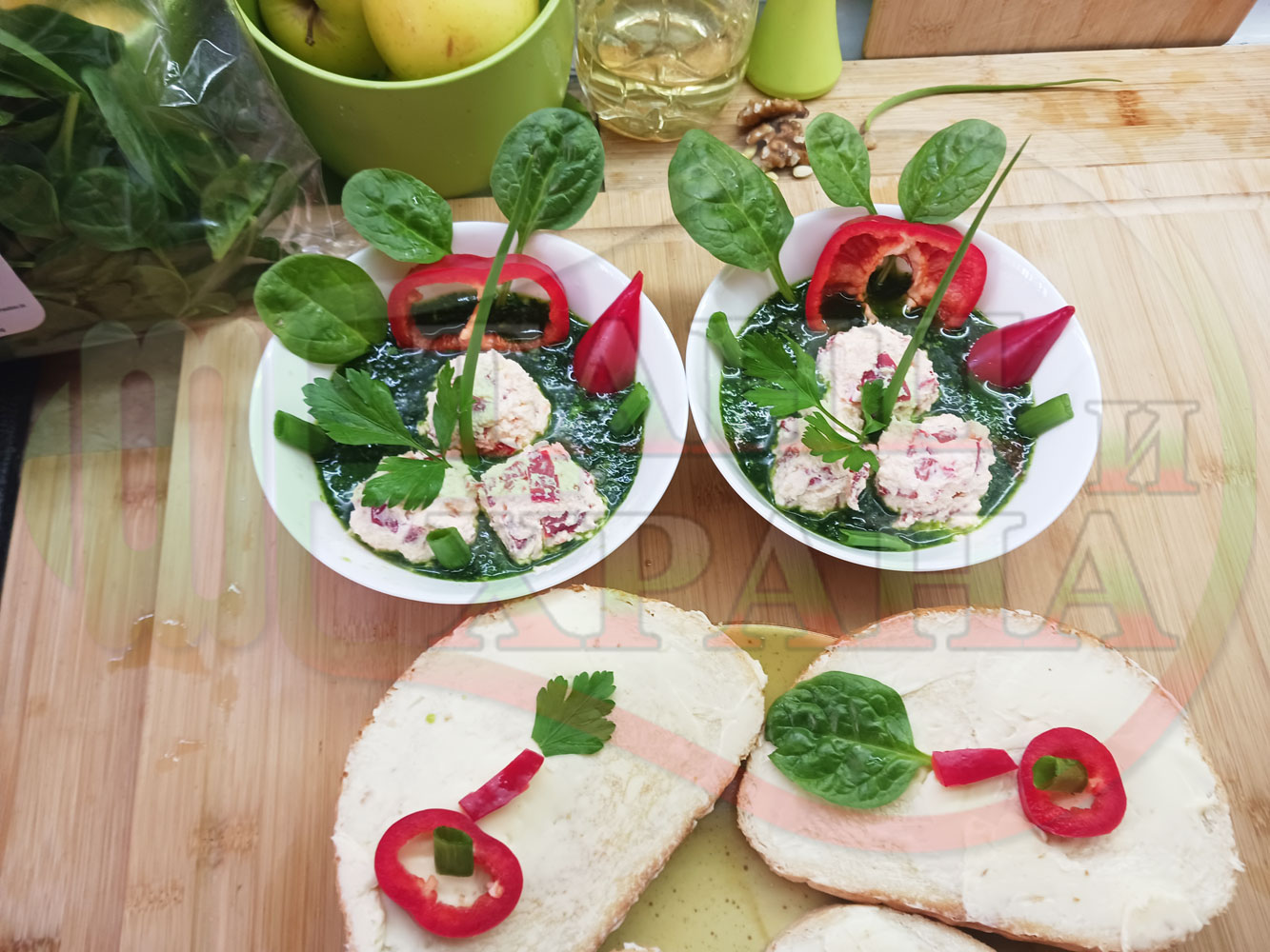 Българска сурова супа със зелен чай "Спаначеномагданозена пряснолучена червеночушкова с БГсирене" приготвена със свеж спанак, пресен лук и магданоз гарнирана с топчета от сиренов крем с червени пресни чушки и краве бяло сирене - двукомпонентна