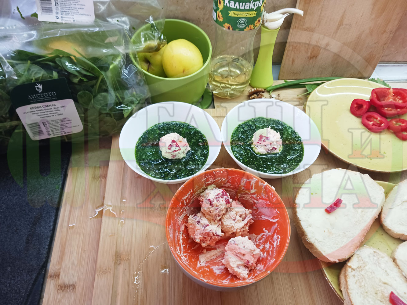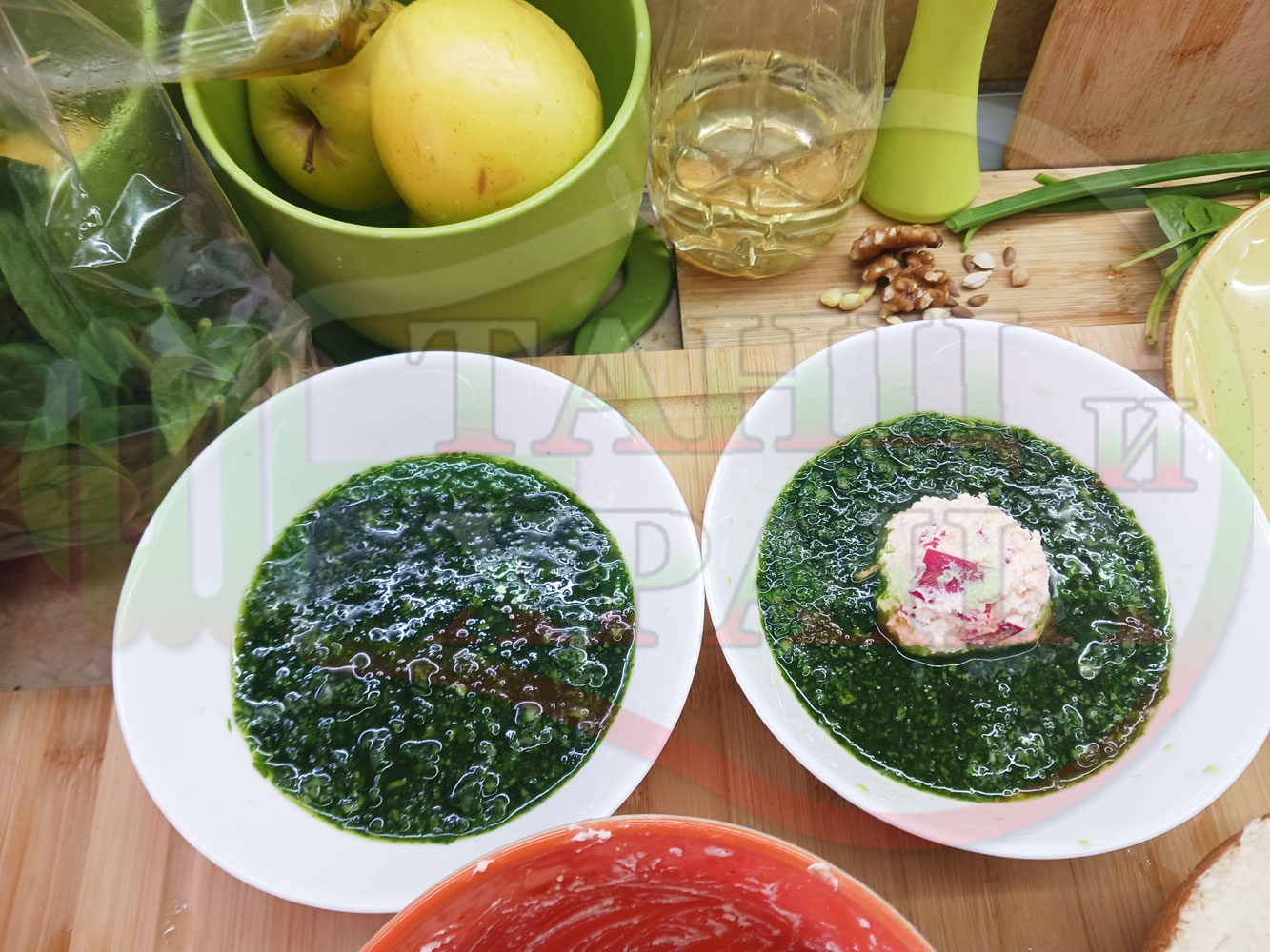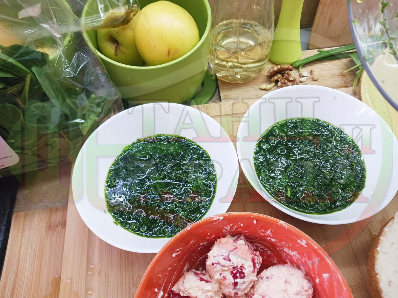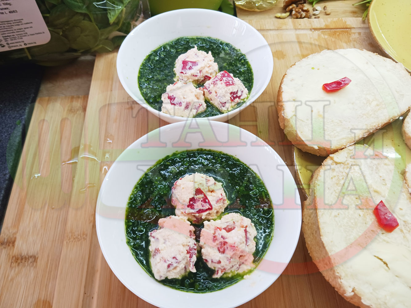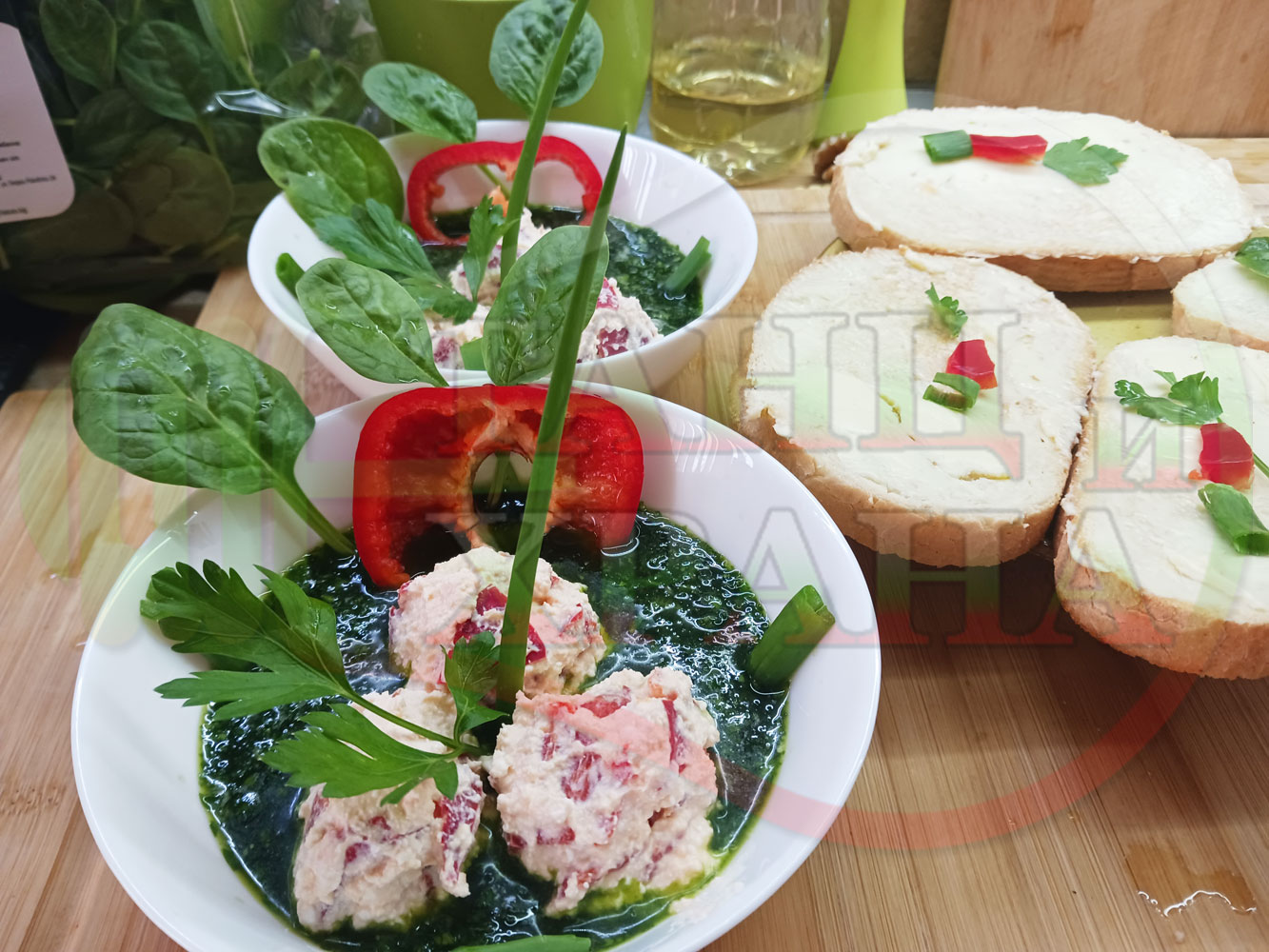 Българска сурова супа със зелен чай "Спаначеномагданозена пряснолучена червеночушкова с БГсирене" приготвена със свеж спанак, пресен лук и магданоз гарнирана с топчета от сиренов крем с червени пресни чушки и краве бяло сирене - двукомпонентна
