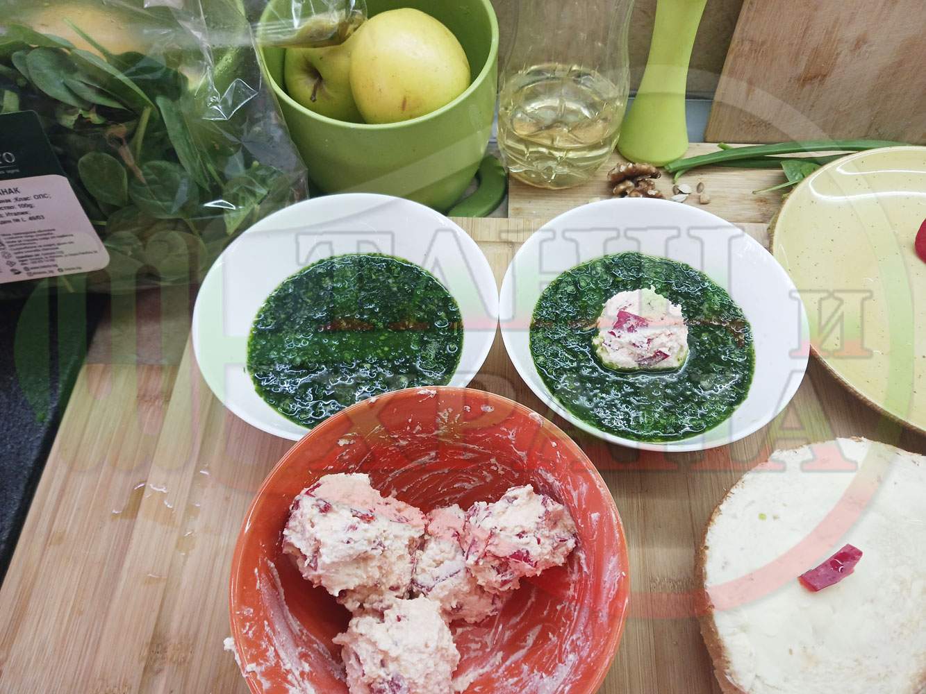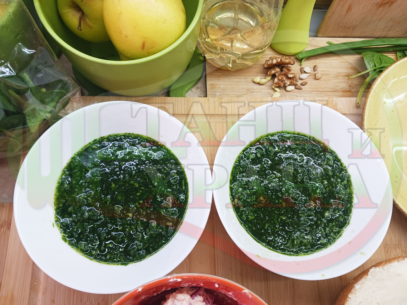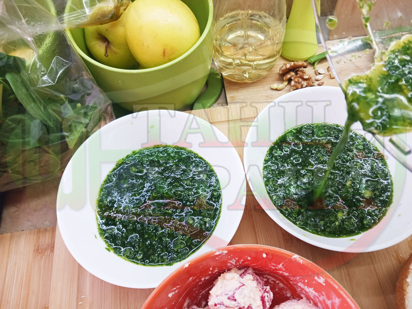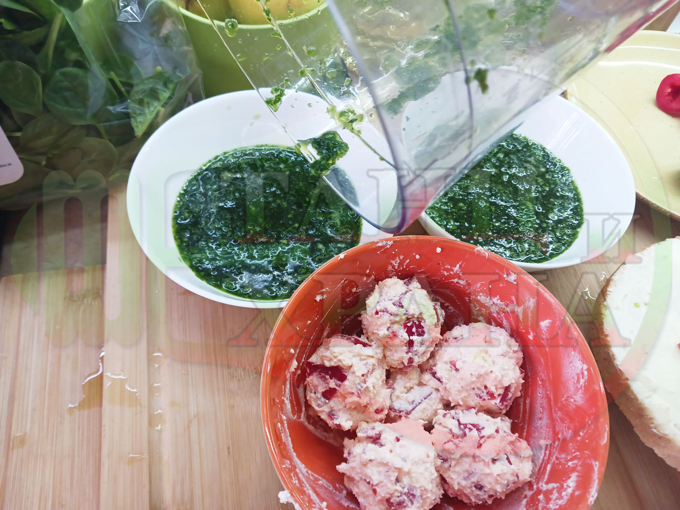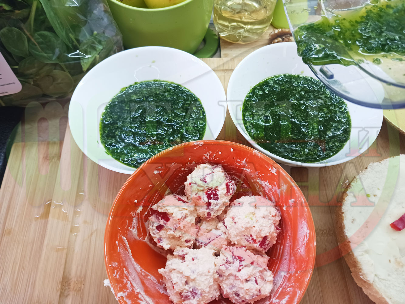 Българска сурова супа със зелен чай "Спаначеномагданозена пряснолучена червеночушкова с БГсирене" приготвена със свеж спанак, пресен лук и магданоз гарнирана с топчета от сиренов крем с червени пресни чушки и краве бяло сирене - двукомпонентна
