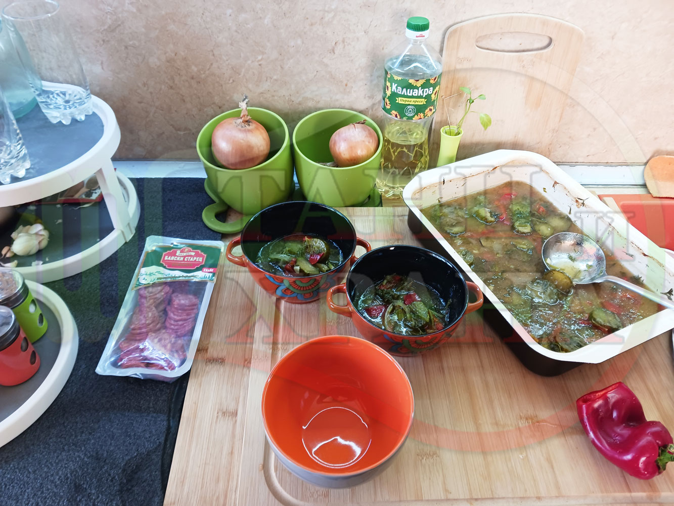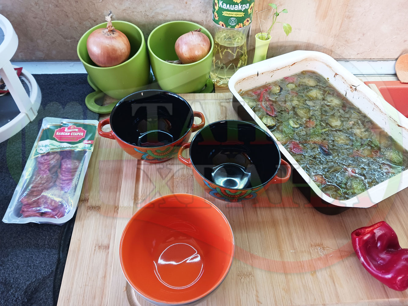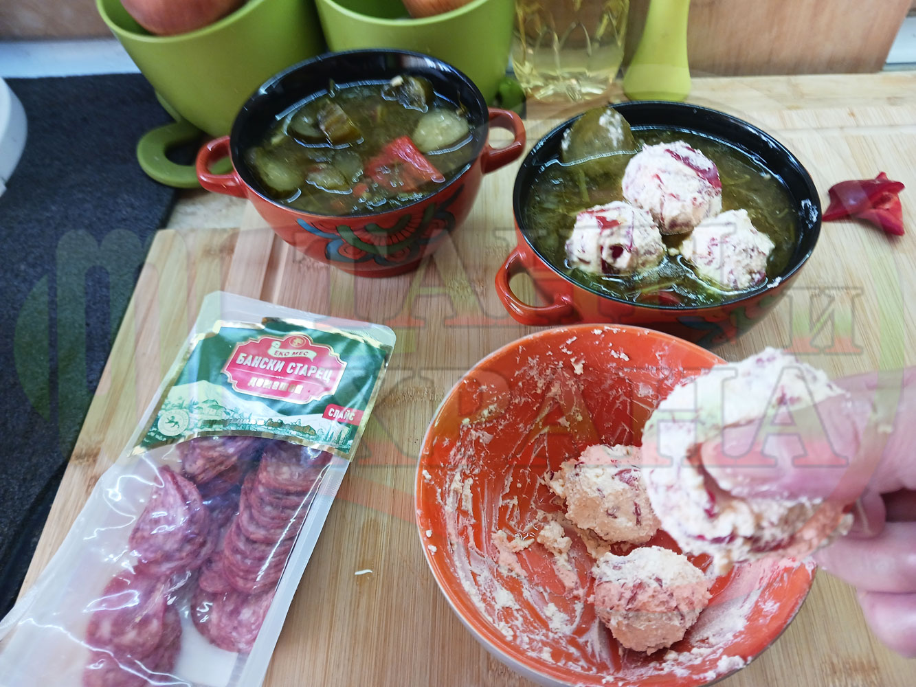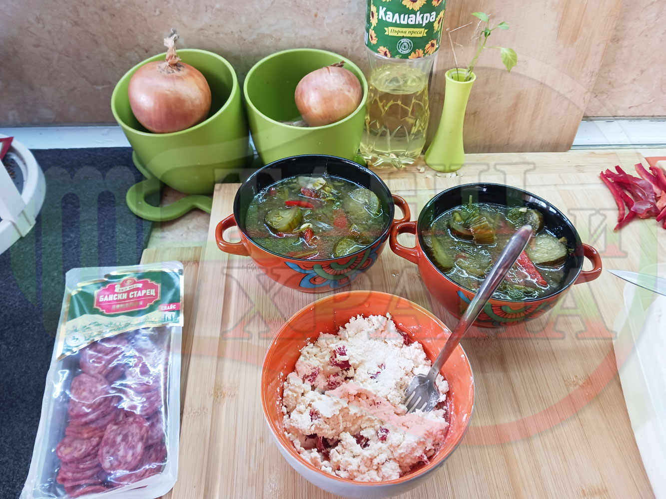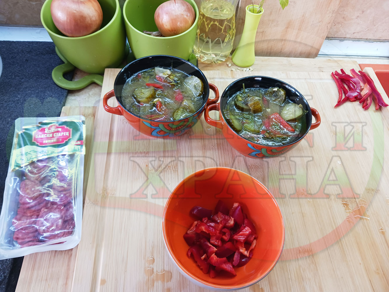 ПРОДУКТИ: Приблизителни количества за български пилешки бульон "Саламенотопчест краставичнокопъров червеночушковолучен с БГсирене" сварен на фурна с краставици, кромид лук, чесън и свеж копър гарниран с топчета от краве бяло сирене, червени пресни чушки и деликатесен салам - производен