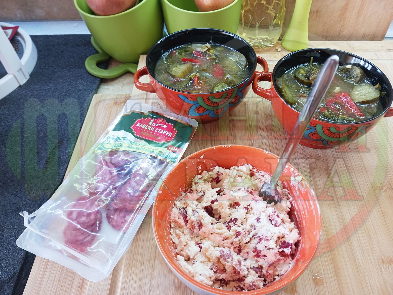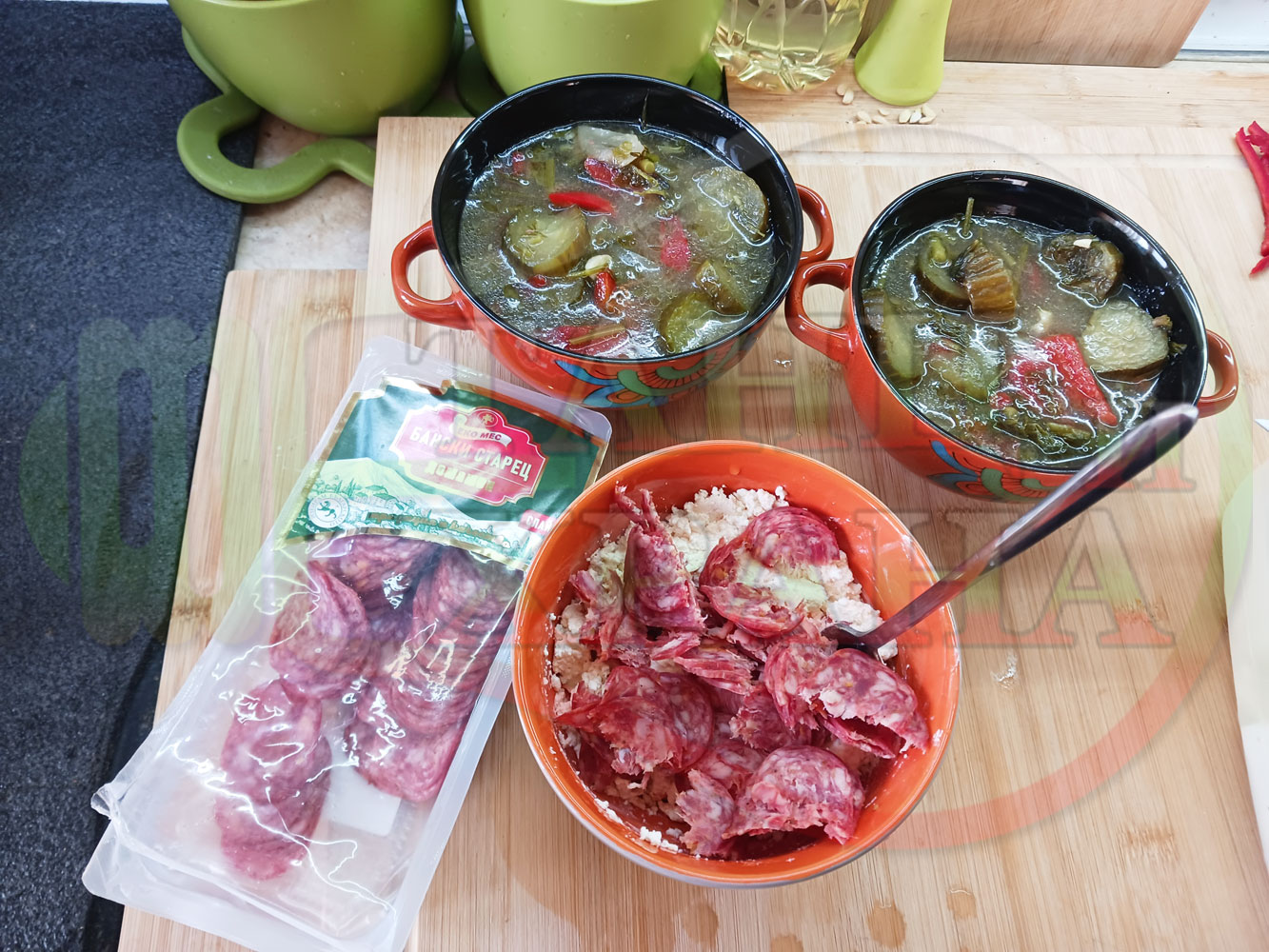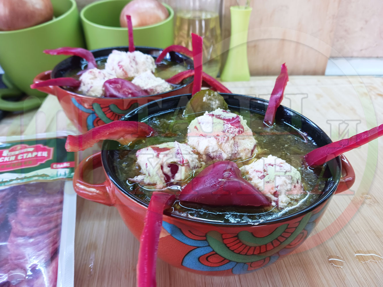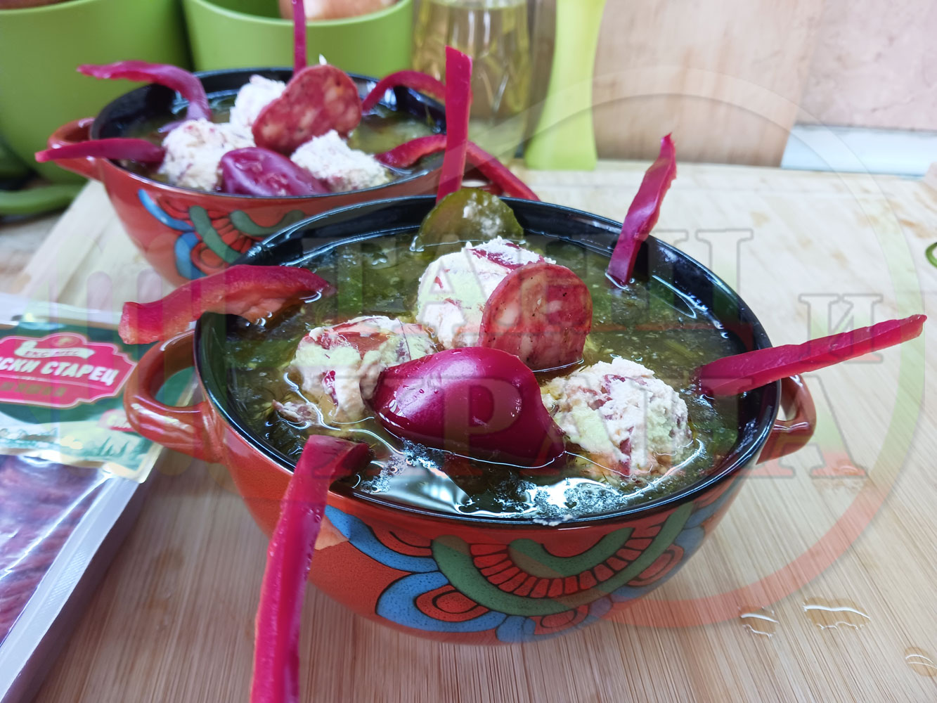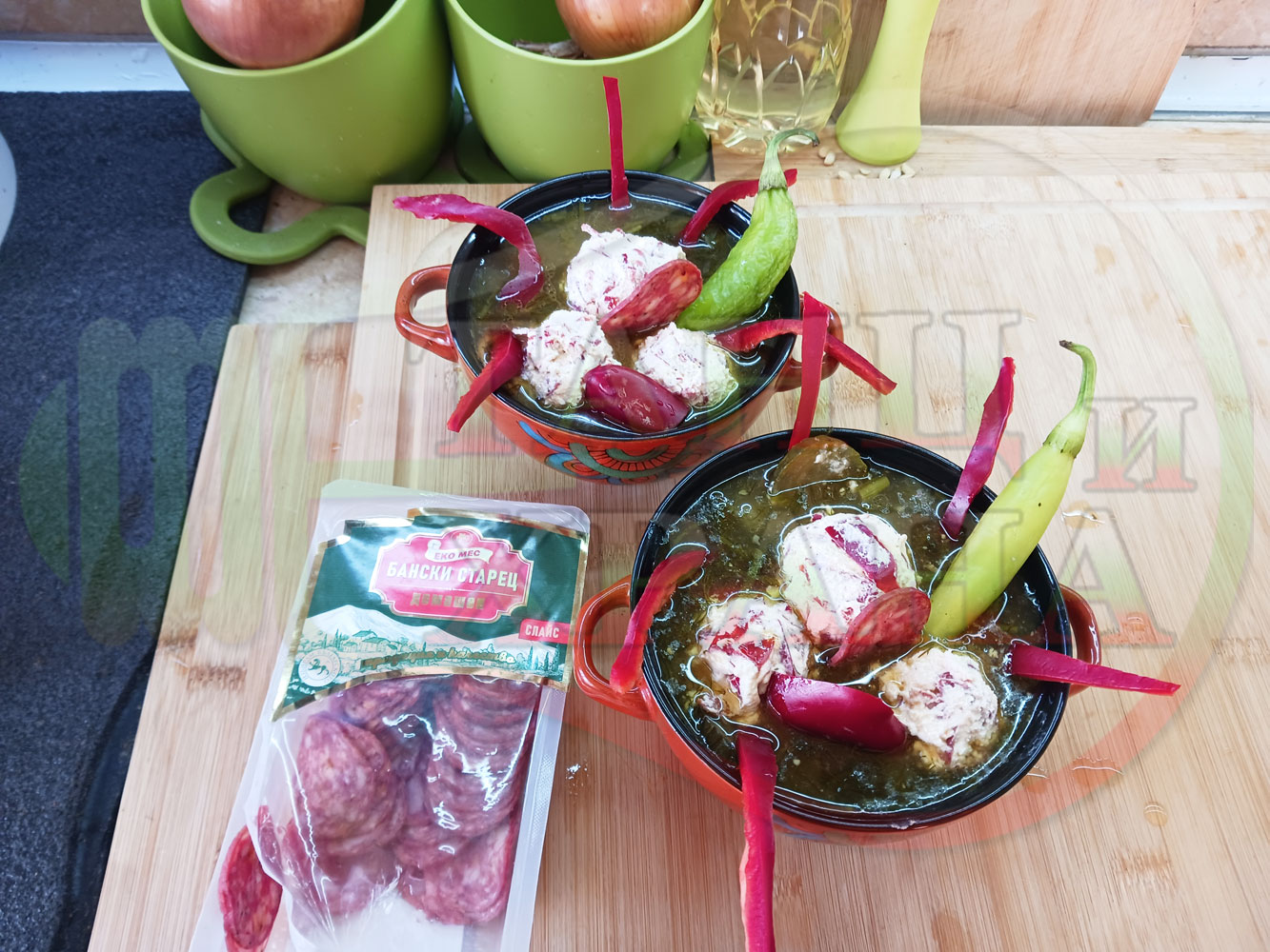 Български пилешки бульон "Саламенотопчест краставичнокопъров червеночушковолучен с БГсирене" сварен на фурна с краставици, кромид лук, чесън и свеж копър гарниран с топчета от краве бяло сирене, червени пресни чушки и деликатесен салам - производен
