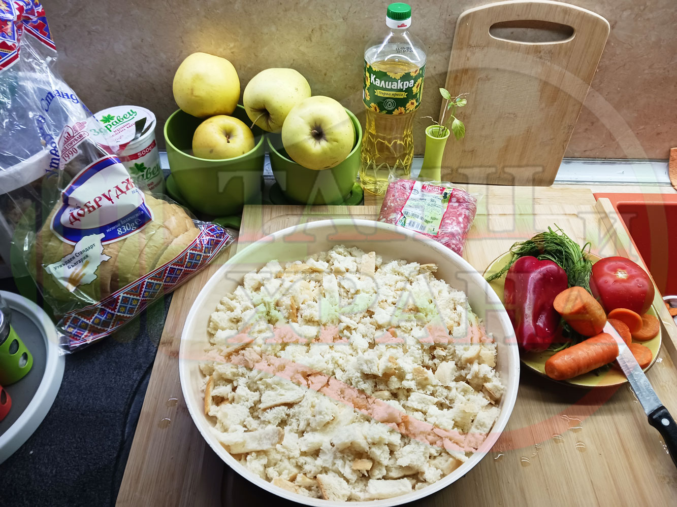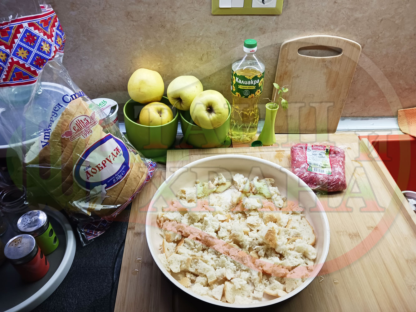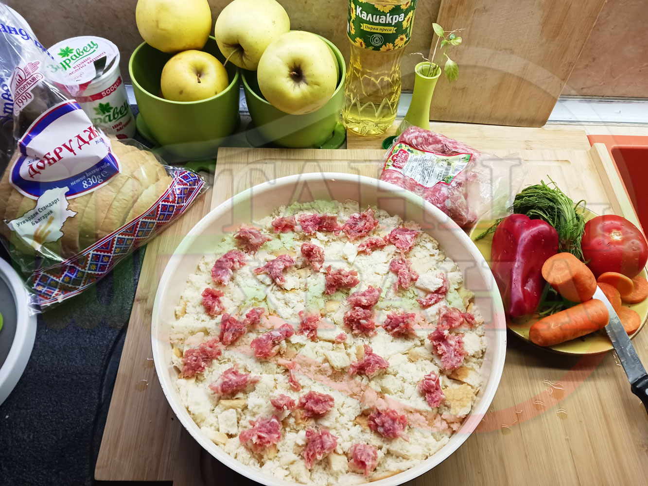 В "Свързани продукти" вижте рецептите на други хлебни баници с кайма и зеленчуци, солени плоски торти, ястия със стар или пресен хляб, хлебни печива и техни"ТЕ" производни.