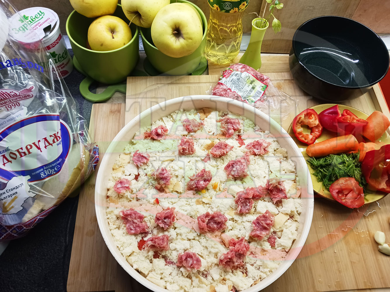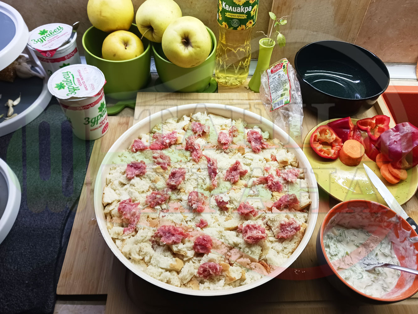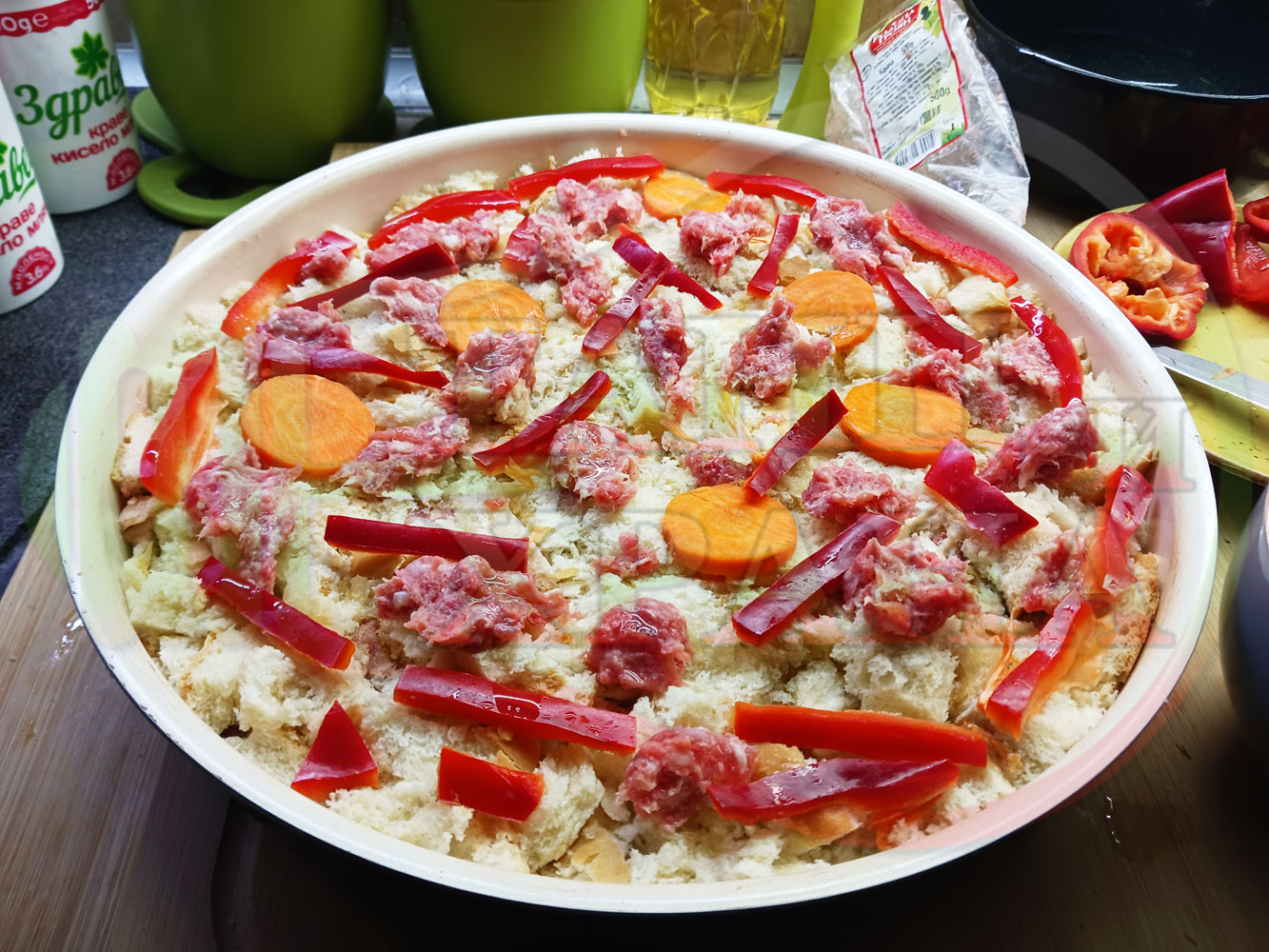 Спретнах многопластова хлебна баница с кайма, моркови, червени пресни чушки и домати. Запекох хлебната баница на фурна с яйчено млечна заливка приготвена от яйца, свеж копър, чесън и българско кисело мляко. Оползотворих близо 2 хляба по възможно най-вкусния начин ( на които предстоеше да изтече срока ). Ммммм... в кухнята се носи аромат на запечени зеленчуци, овкусени от каймата в идеална хармония и отново се получи голяма вкусно, вкусна, вкусотия (вкуснотия). laughing В единия от дните, хапнахме по-големи парчета от хлебната баница с краве масло, което доовкусява и обогатява запечения хляб с кайма и зеленчуци (препоръчвам да не пестите растителната мазнина и да добавите масло между слоевете).