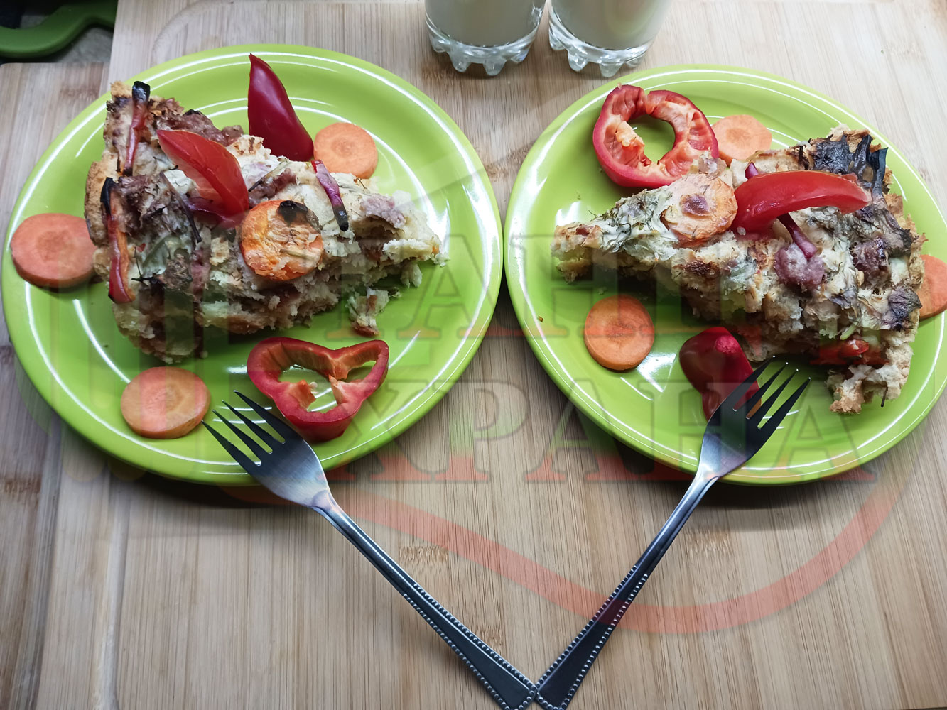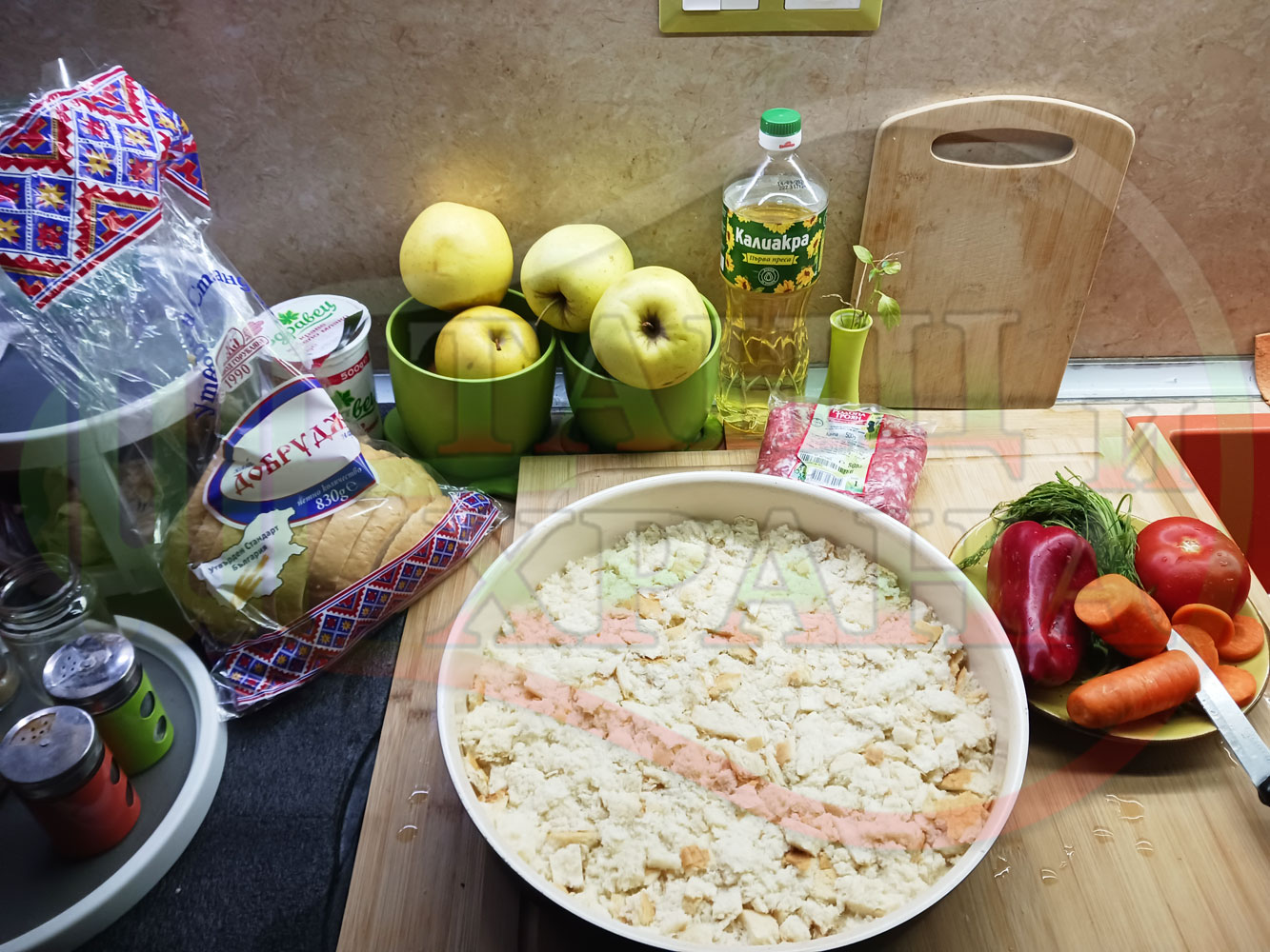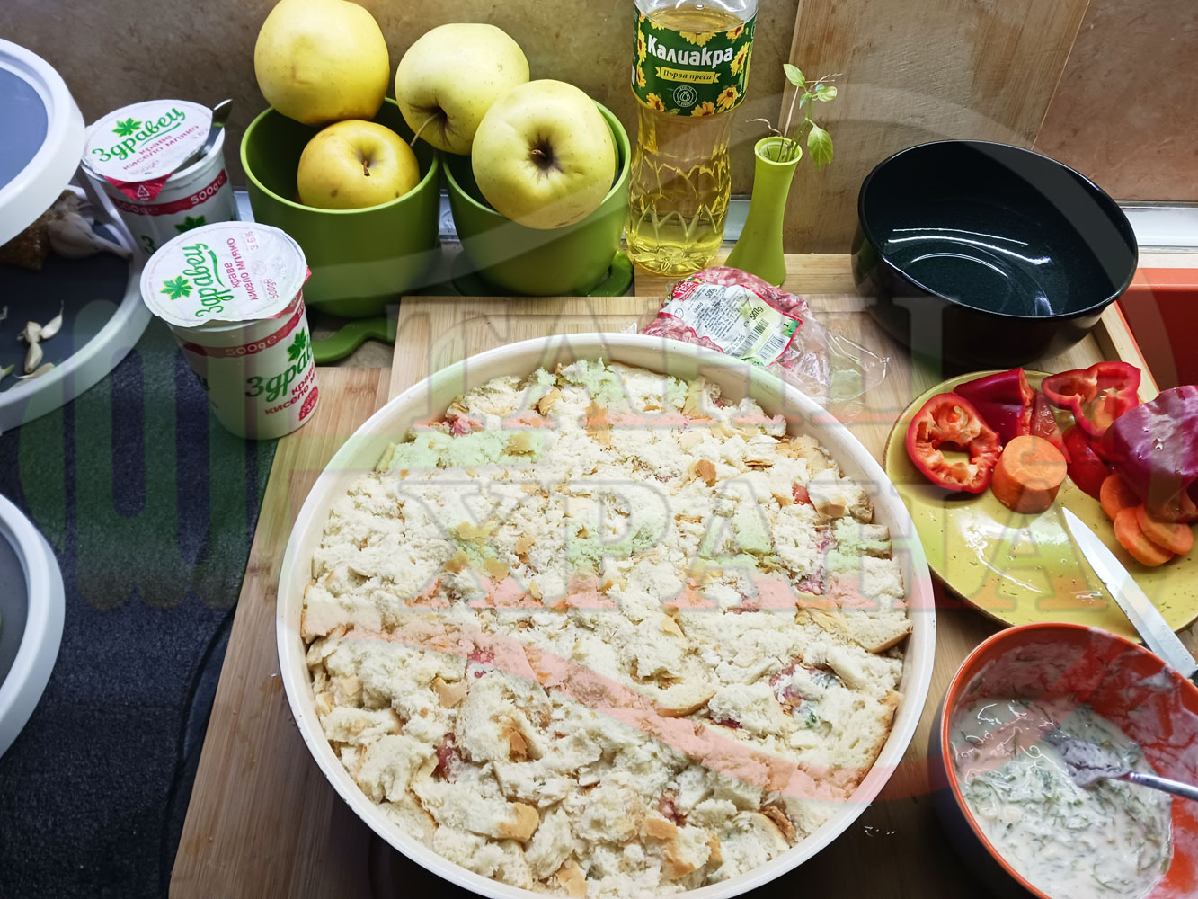 Спретнах многопластова хлебна баница с кайма, моркови, червени пресни чушки и домати. Запекох хлебната баница на фурна с яйчено млечна заливка приготвена от яйца, свеж копър, чесън и българско кисело мляко. Оползотворих близо 2 хляба по възможно най-вкусния начин ( на които предстоеше да изтече срока ). Ммммм... в кухнята се носи аромат на запечени зеленчуци, овкусени от каймата в идеална хармония и отново се получи голяма вкусно, вкусна, вкусотия (вкуснотия). laughing В единия от дните, хапнахме по-големи парчета от хлебната баница с краве масло, което доовкусява и обогатява запечения хляб с кайма и зеленчуци (препоръчвам да не пестите растителната мазнина и да добавите масло между слоевете).