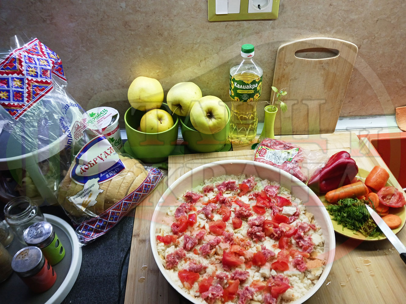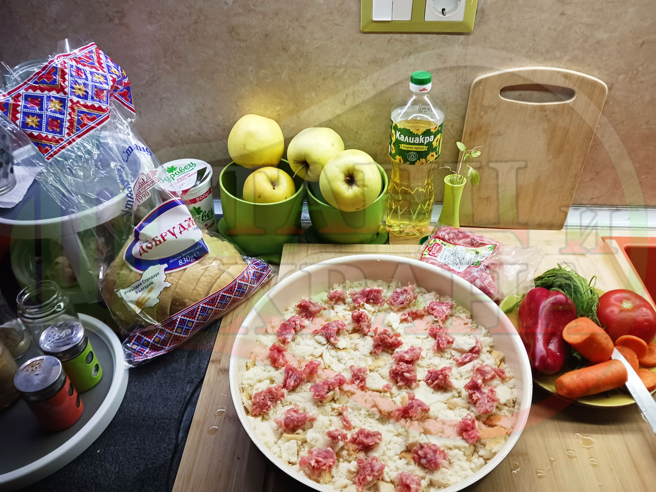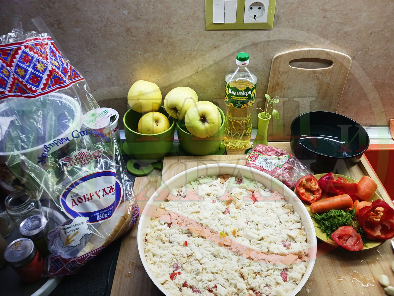 ПРОДУКТИ: Приблизителни количества за многопластова хлебна баница "Каймянодоматена киселомлечна червеночушковоморковена" запечена на фурна с кайма, домати, червени пресни чушки и моркови с яйчено млечна заливка приготвена със свеж копър, стар чесън и кисело мляко от България