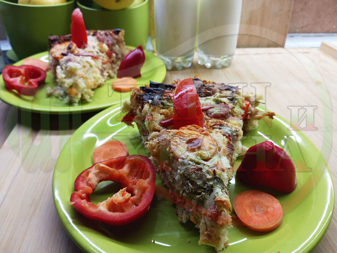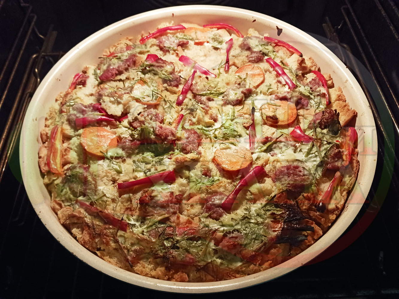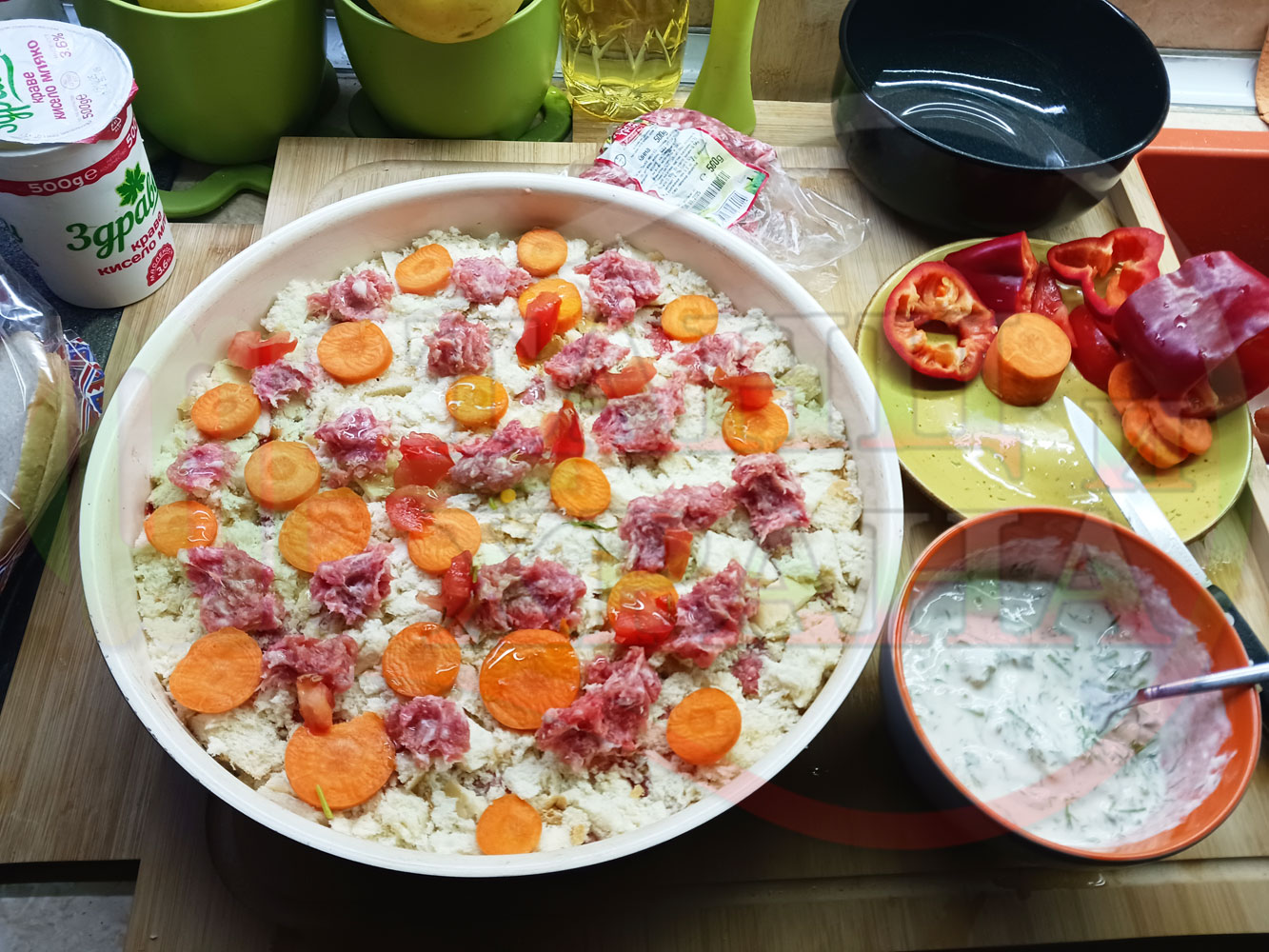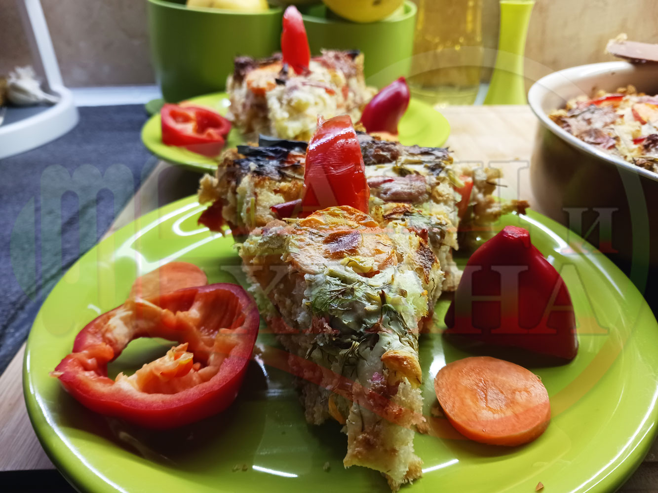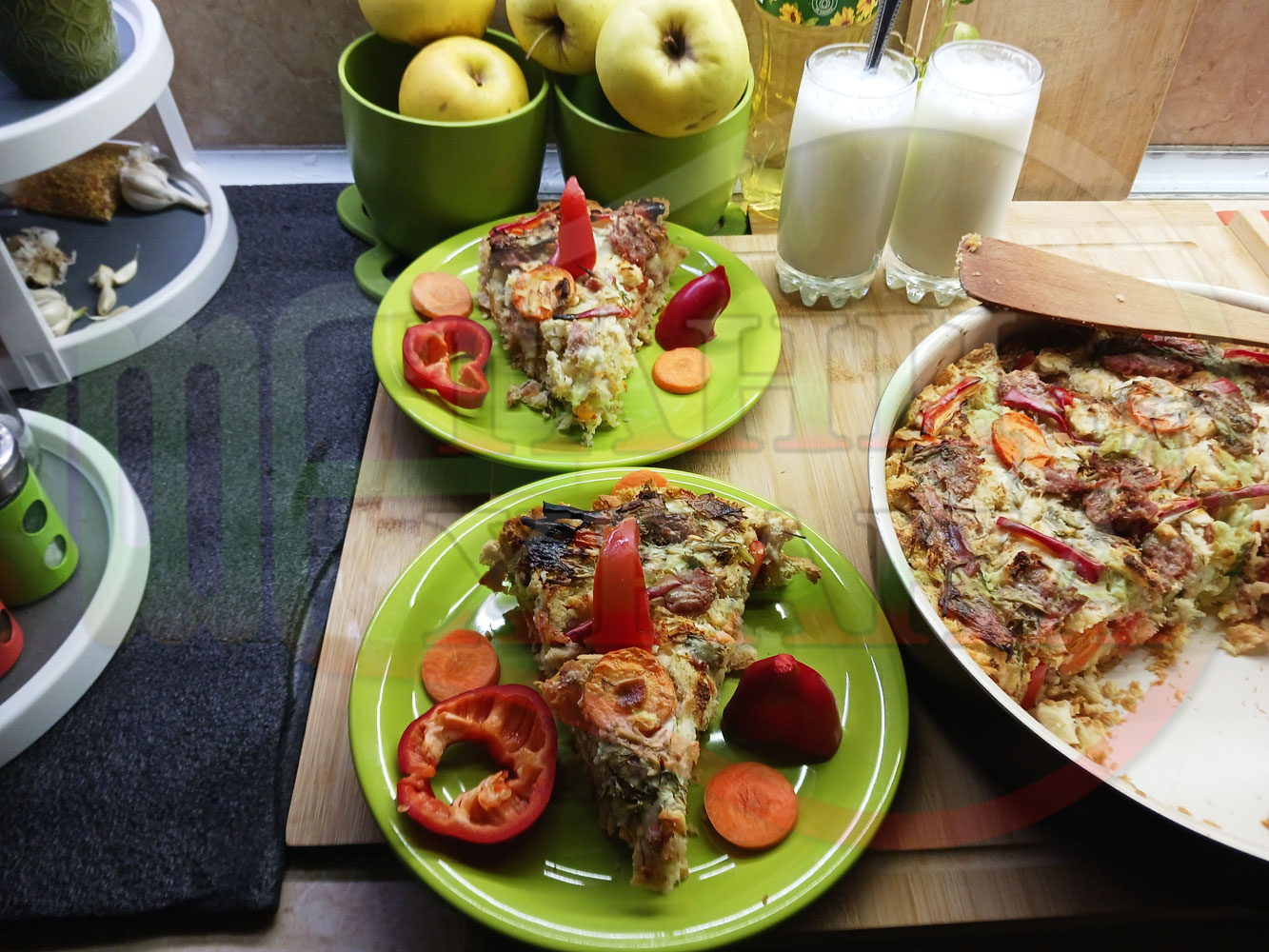 Многопластова хлебна баница "Каймянодоматена киселомлечна червеночушковоморковена" запечена на фурна с кайма, домати, червени пресни чушки и моркови с яйчено млечна заливка приготвена със свеж копър, стар чесън и кисело мляко от България