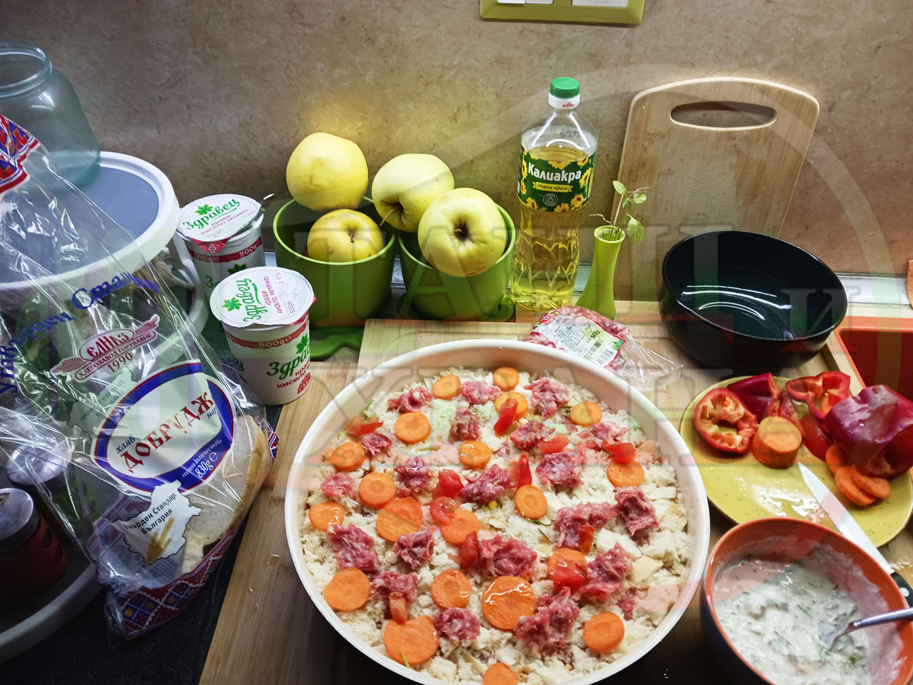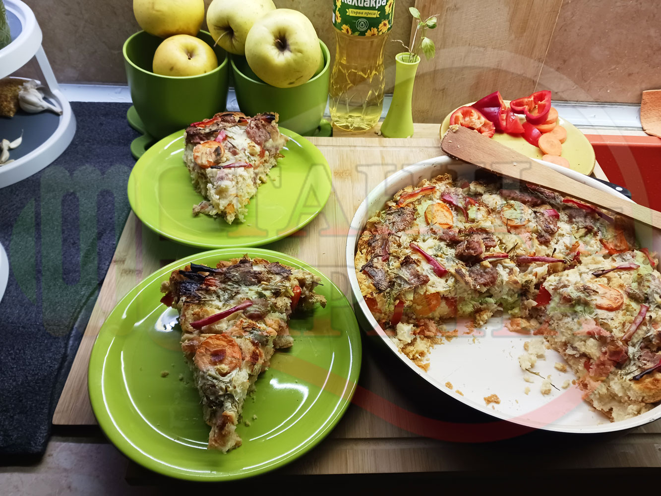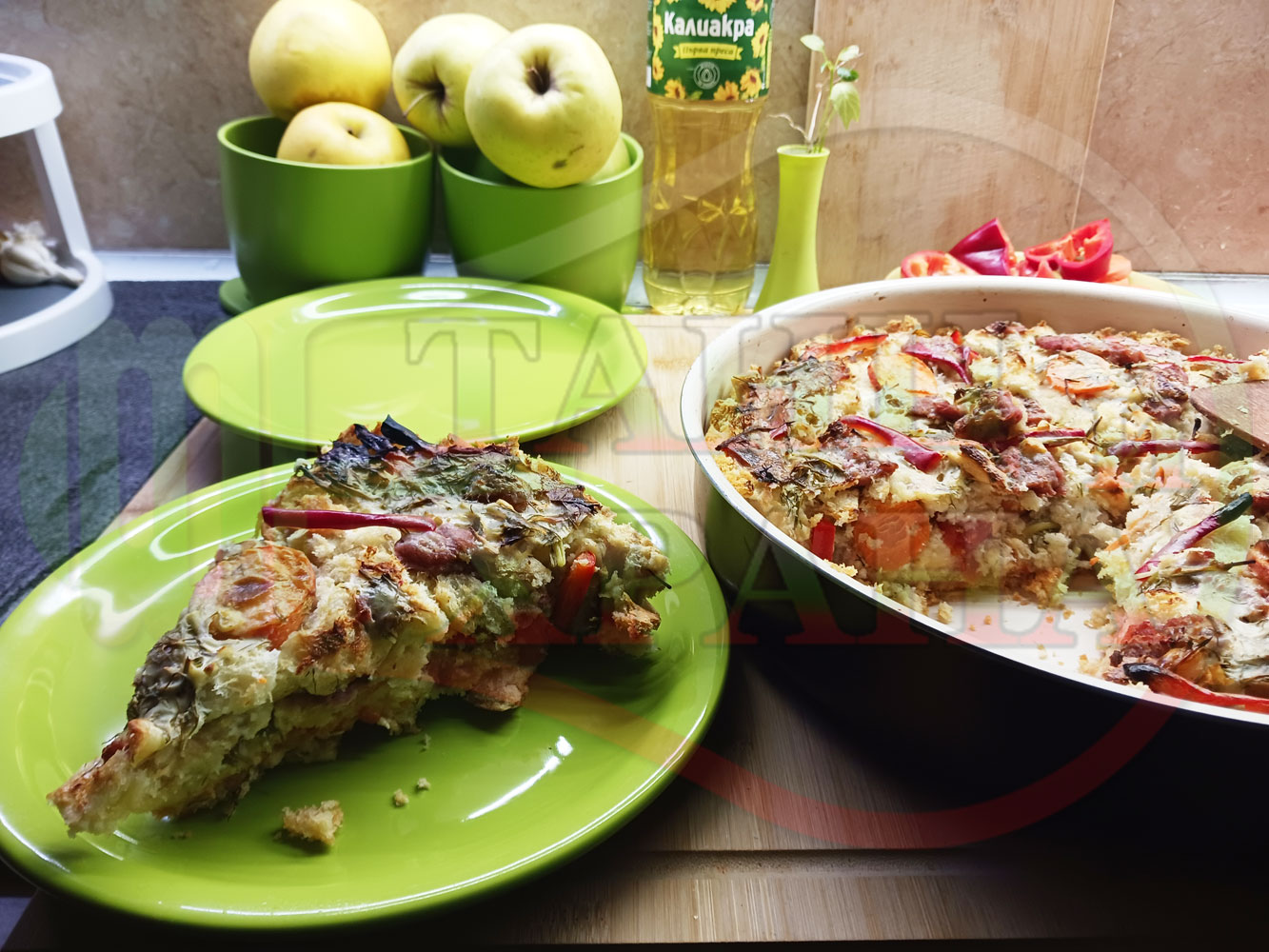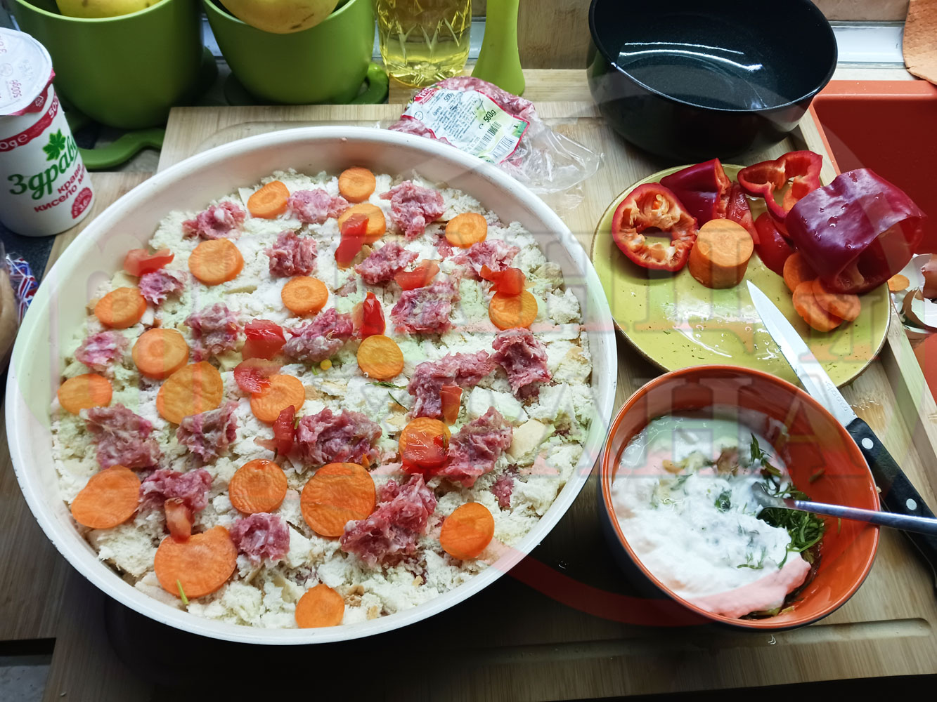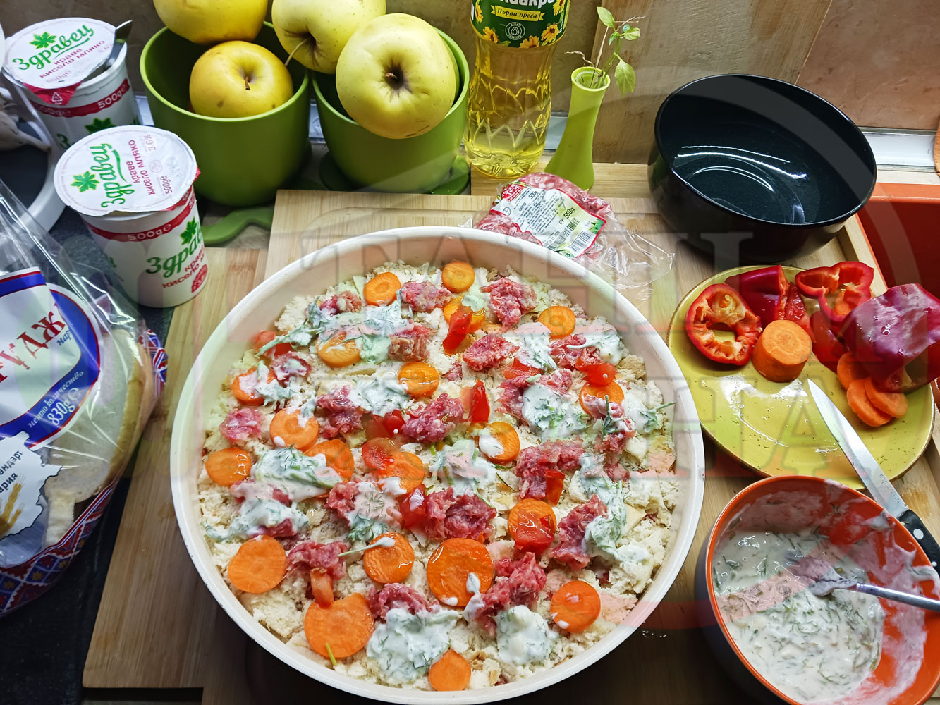 Многопластова хлебна баница "Каймянодоматена киселомлечна червеночушковоморковена" запечена на фурна с кайма, домати, червени пресни чушки и моркови с яйчено млечна заливка приготвена със свеж копър, стар чесън и кисело мляко от България