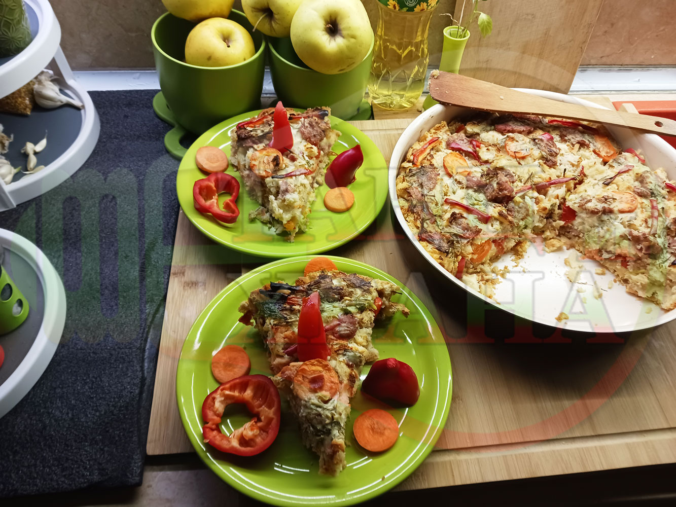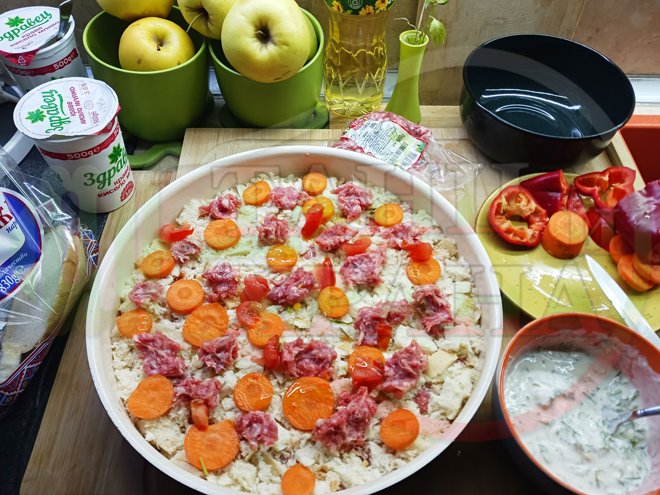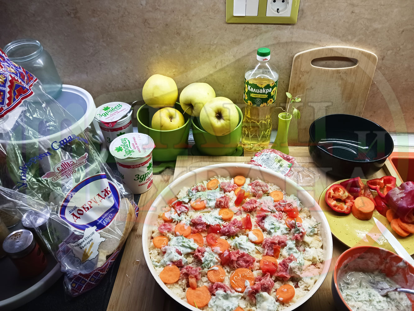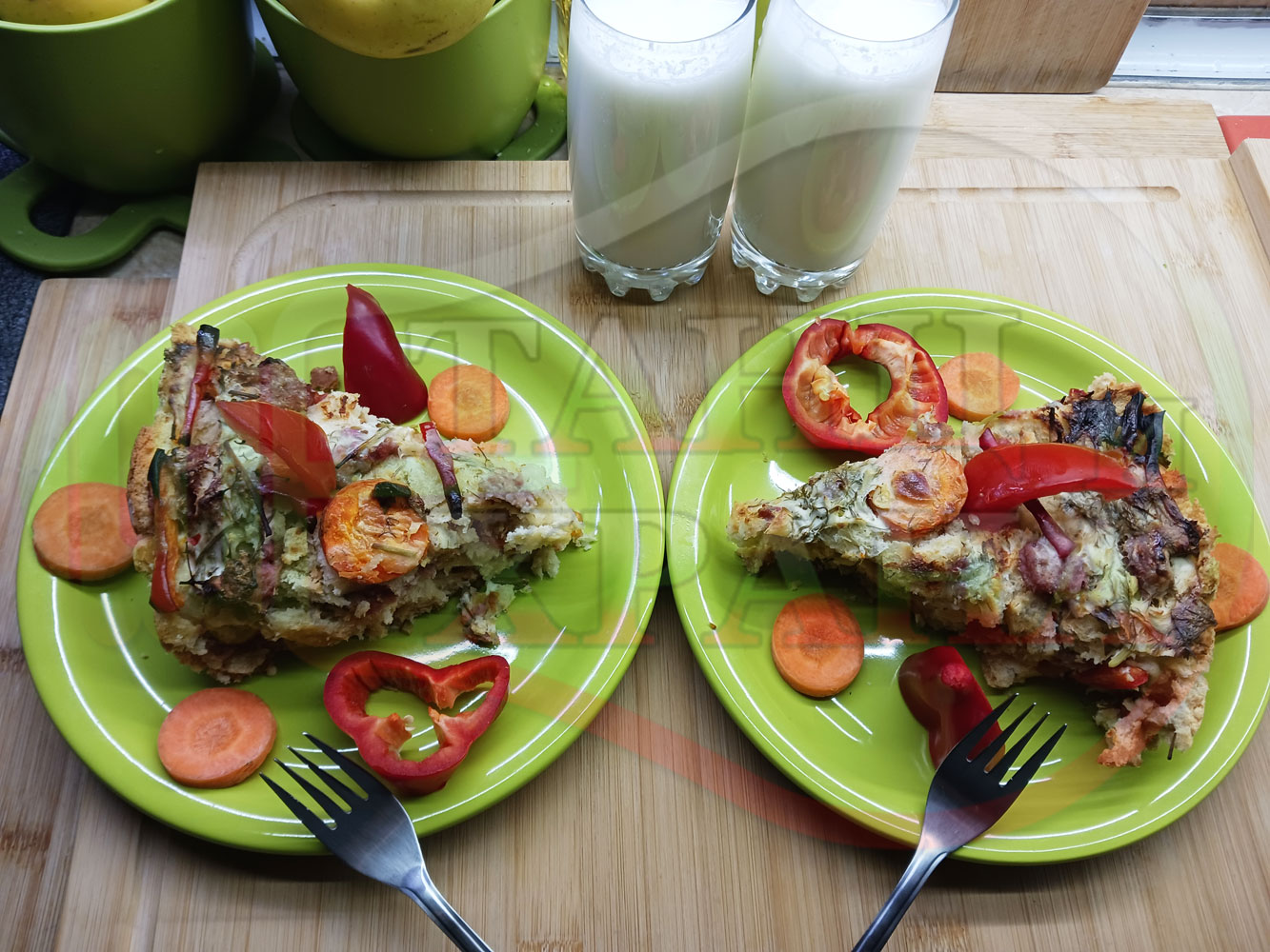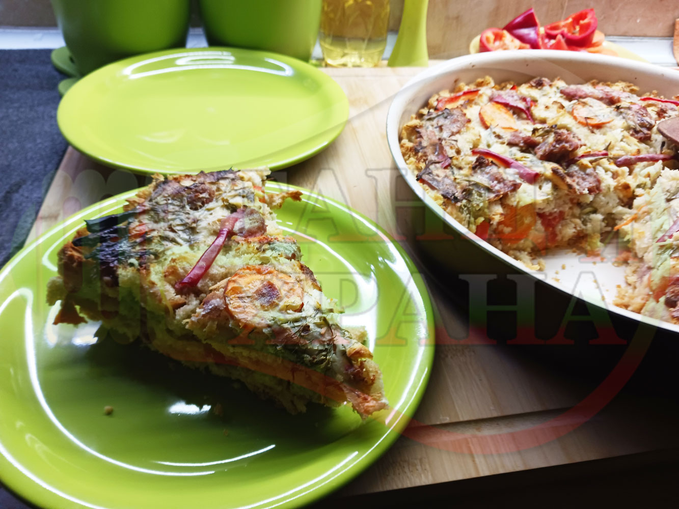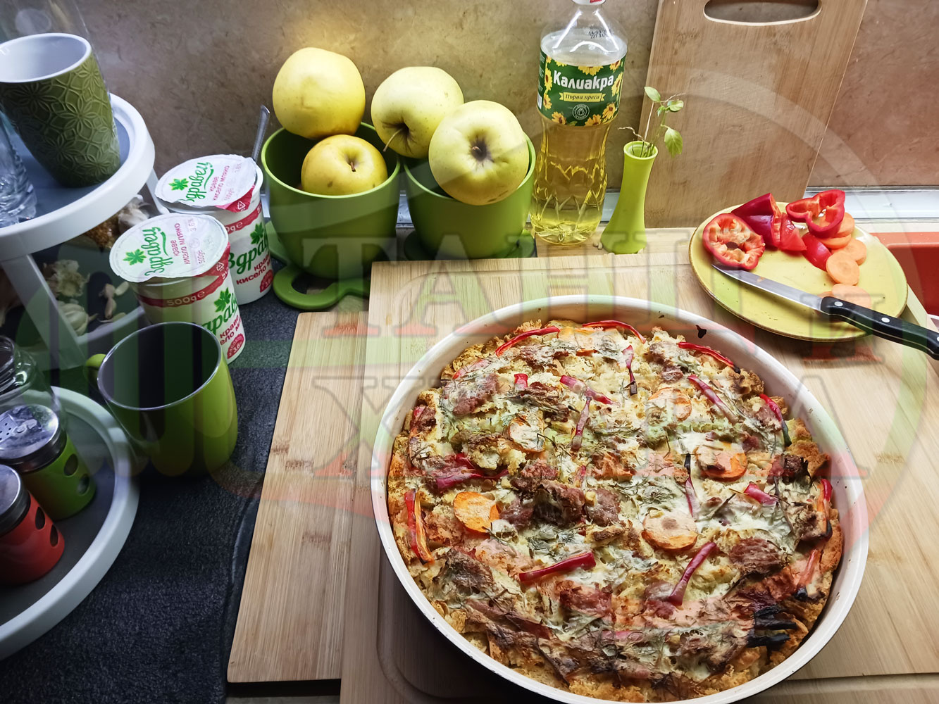 Многопластова хлебна баница "Каймянодоматена киселомлечна червеночушковоморковена" запечена на фурна с кайма, домати, червени пресни чушки и моркови с яйчено млечна заливка приготвена със свеж копър, стар чесън и кисело мляко от България