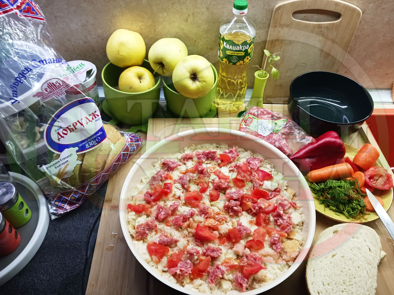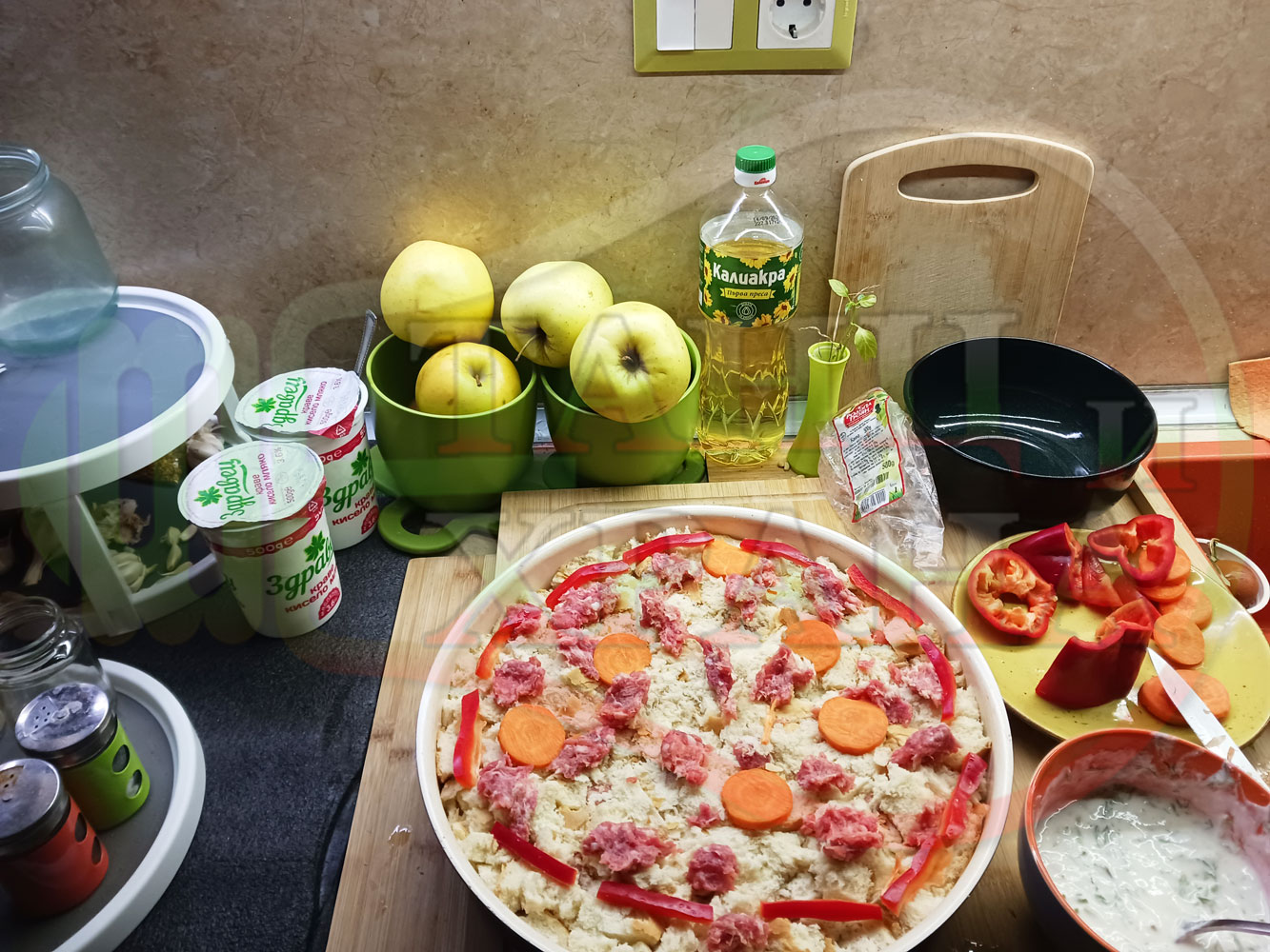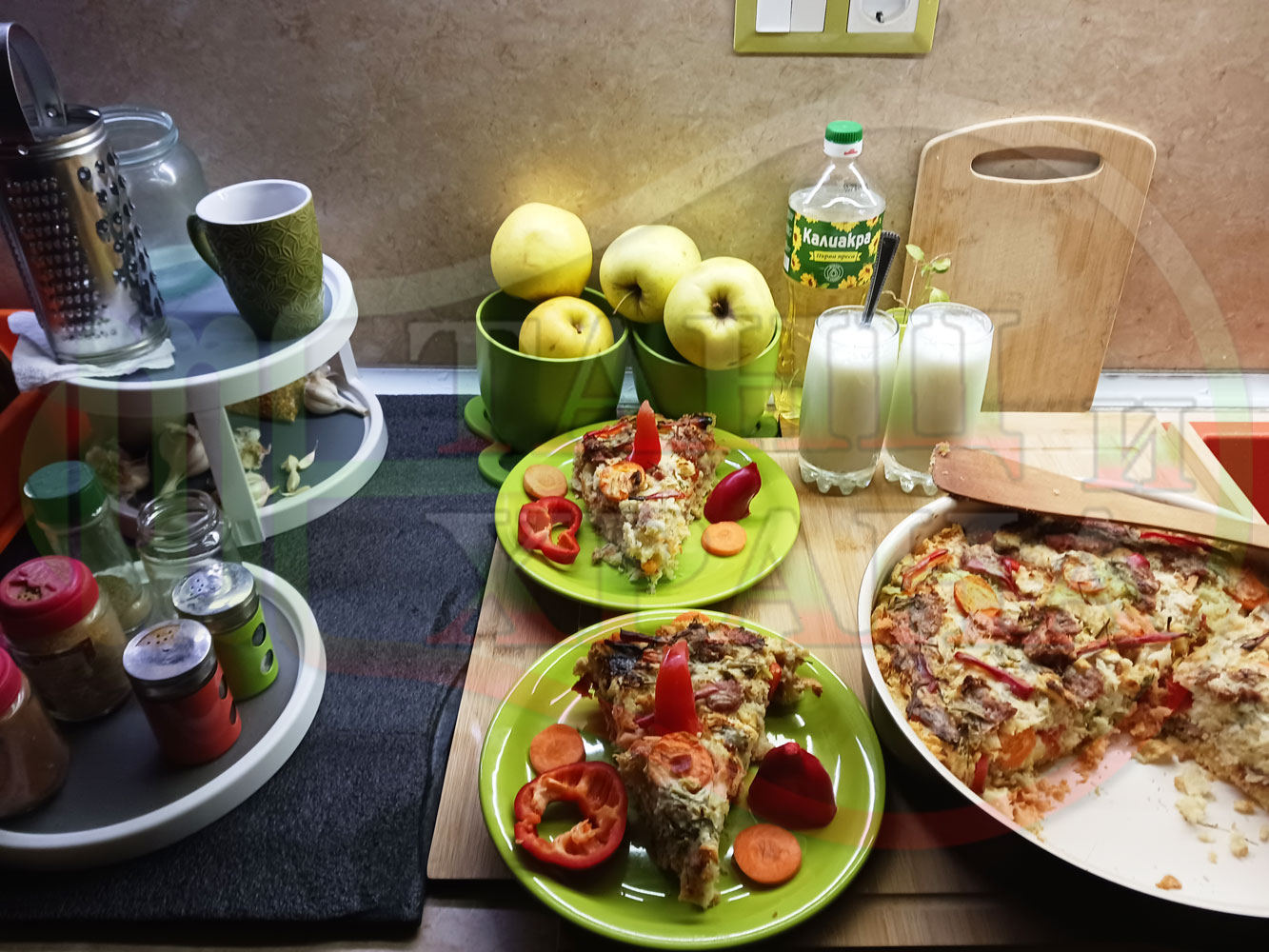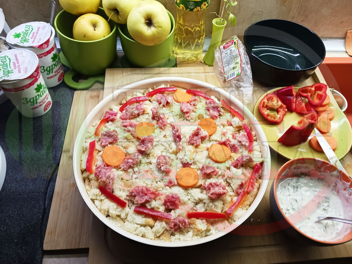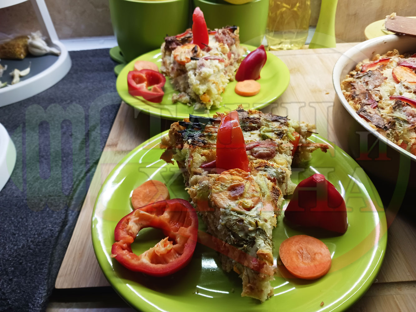 Многопластова хлебна баница "Каймянодоматена киселомлечна червеночушковоморковена" запечена на фурна с кайма, домати, червени пресни чушки и моркови с яйчено млечна заливка приготвена със свеж копър, стар чесън и кисело мляко от България