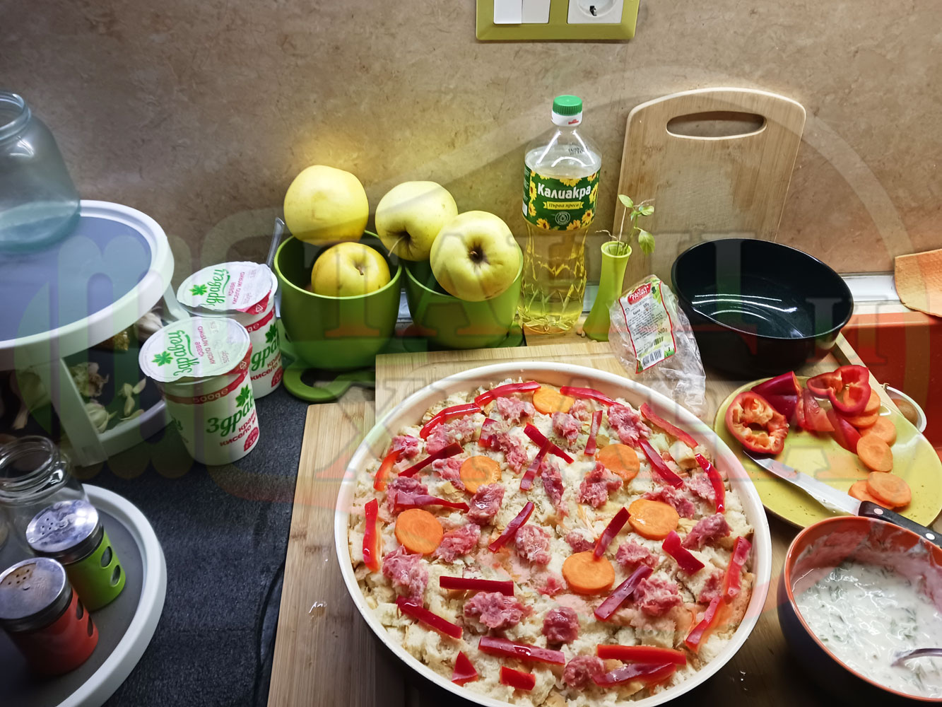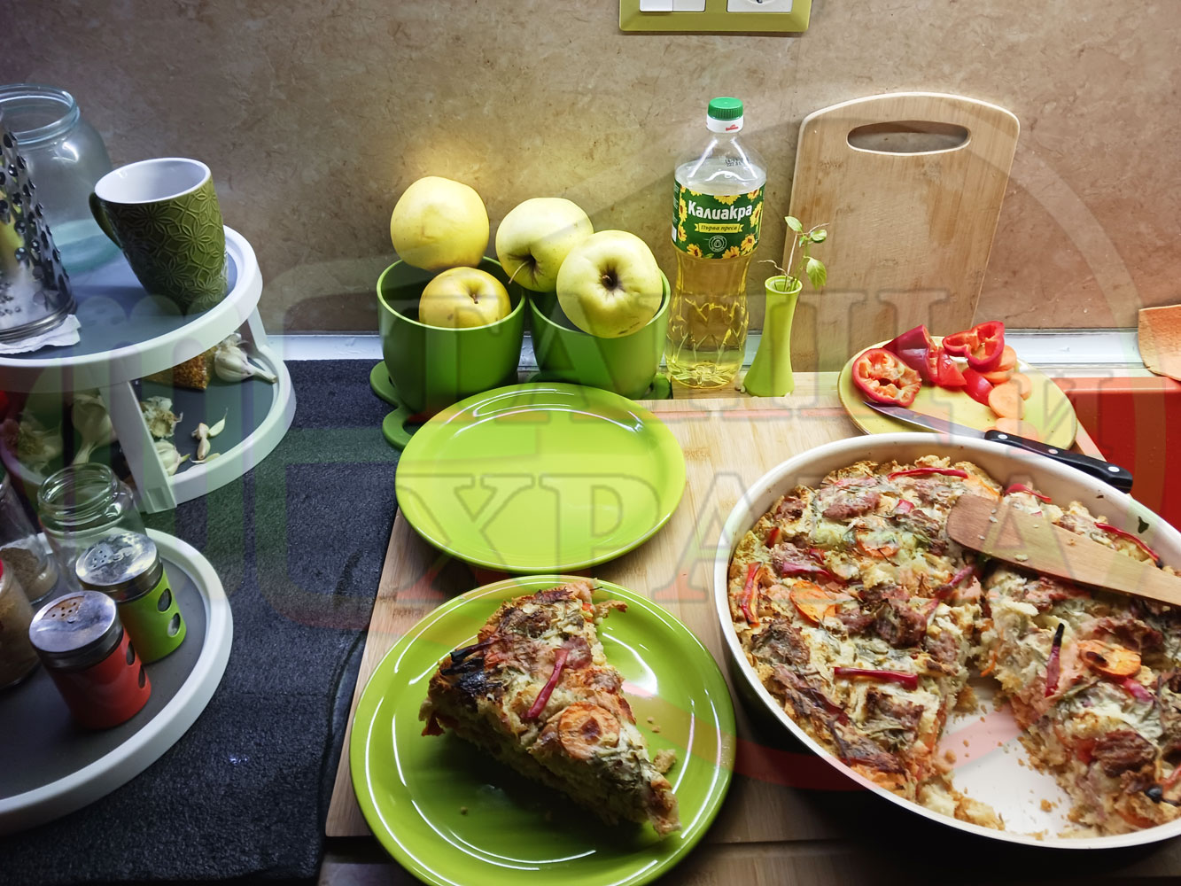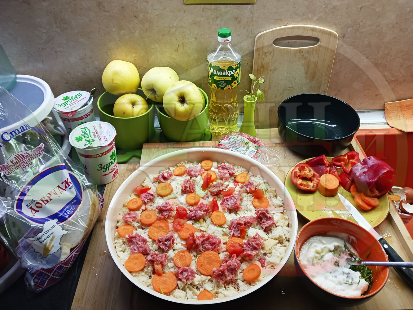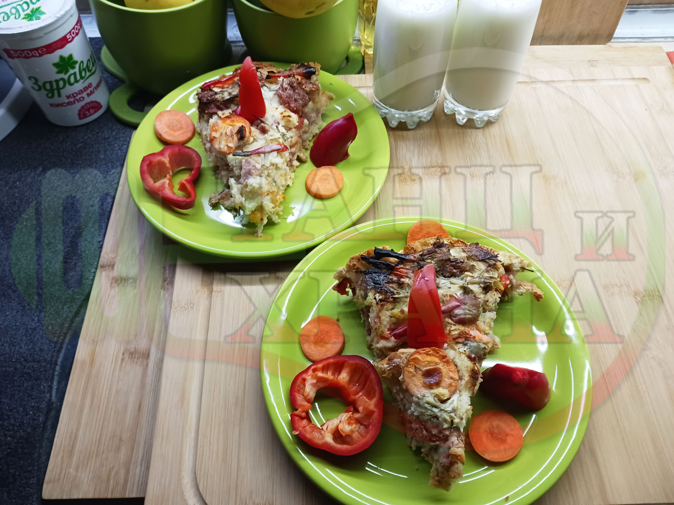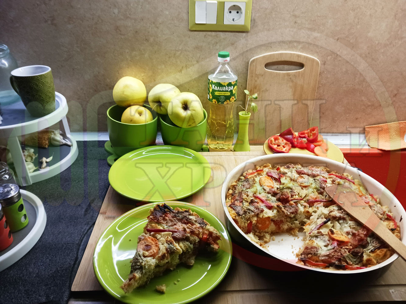 Многопластова хлебна баница "Каймянодоматена киселомлечна червеночушковоморковена" запечена на фурна с кайма, домати, червени пресни чушки и моркови с яйчено млечна заливка приготвена със свеж копър, стар чесън и кисело мляко от България