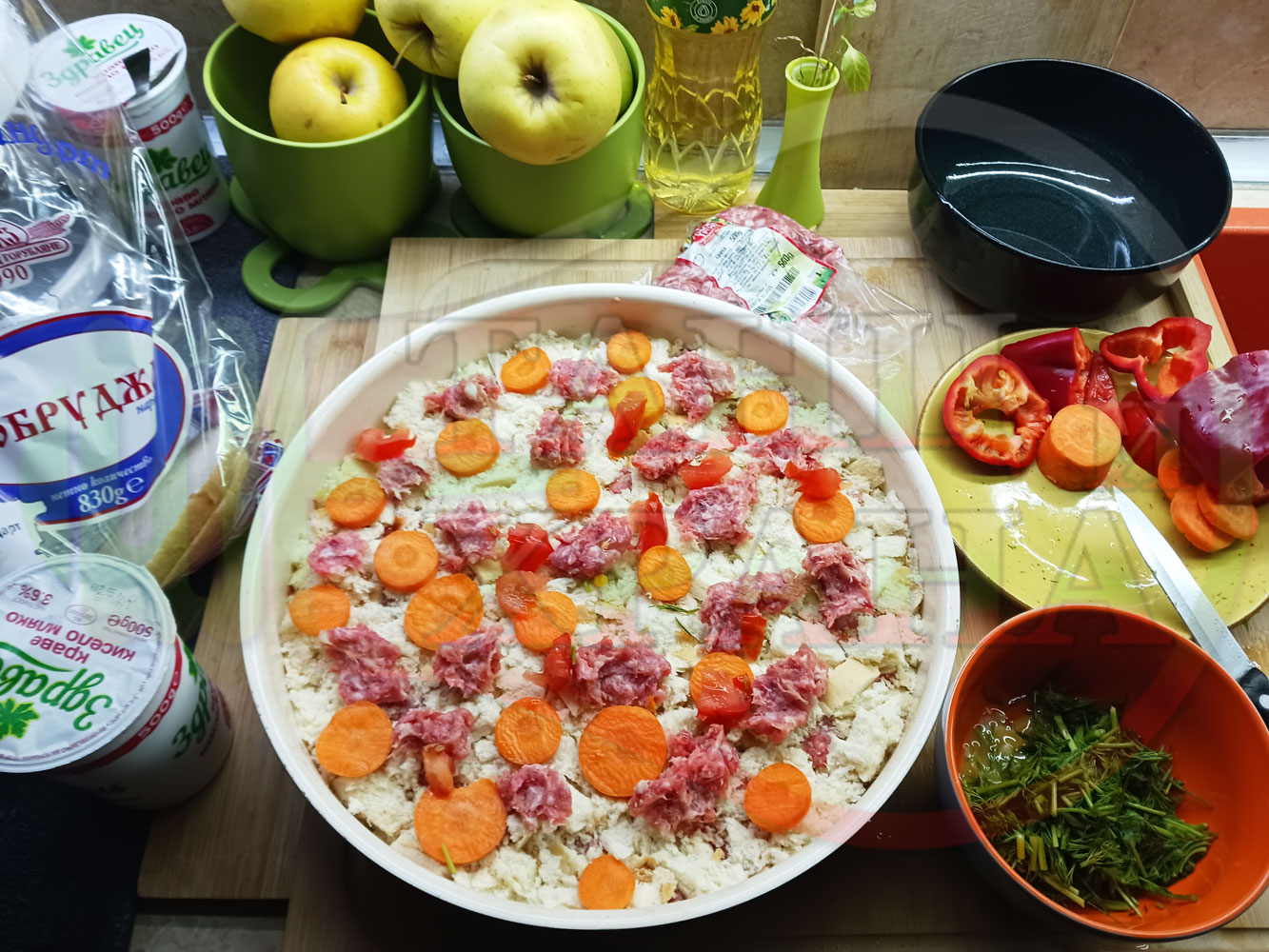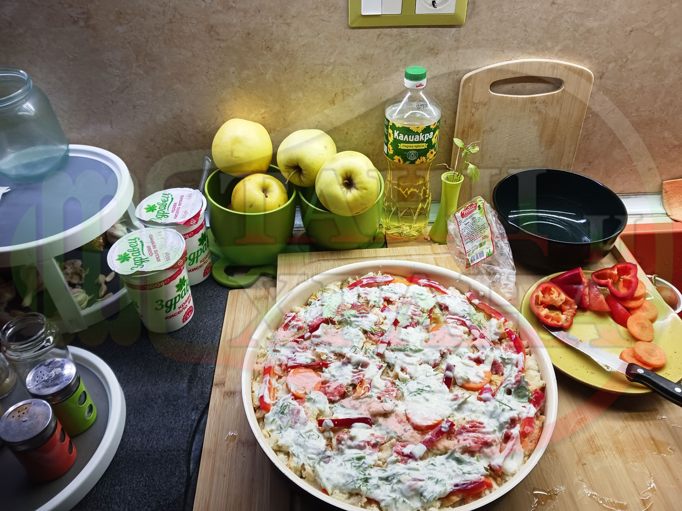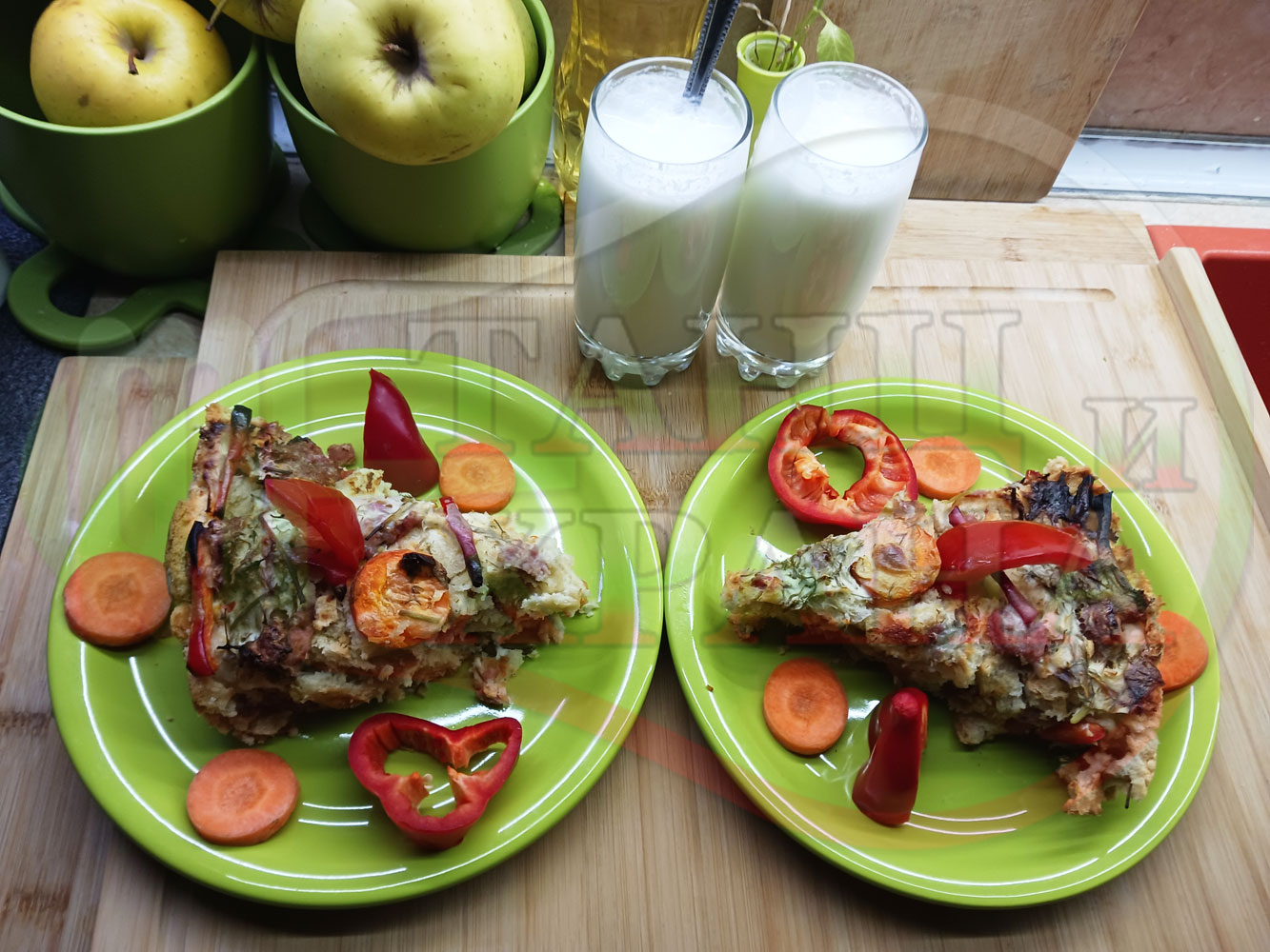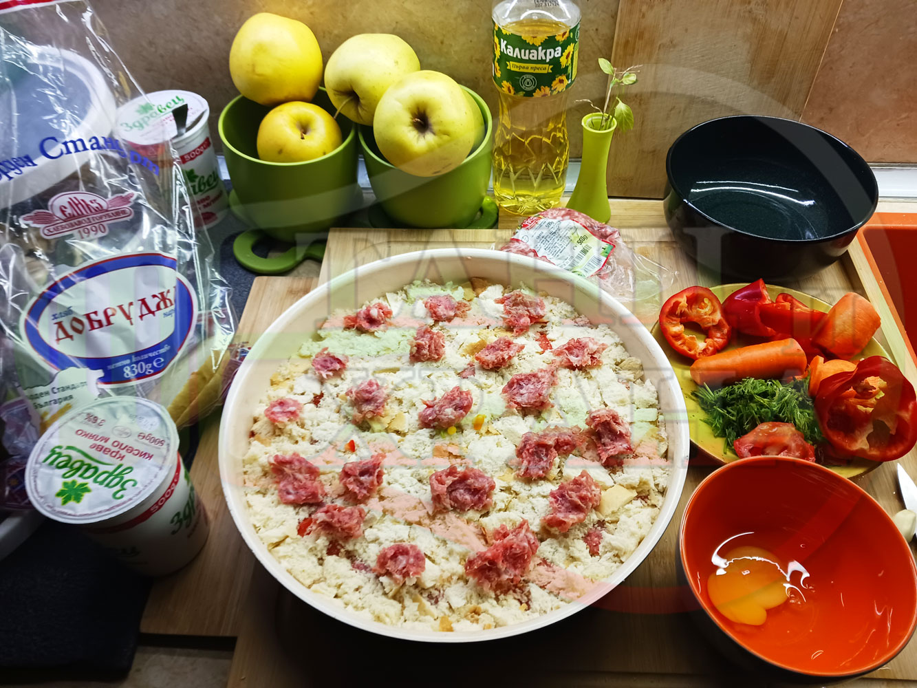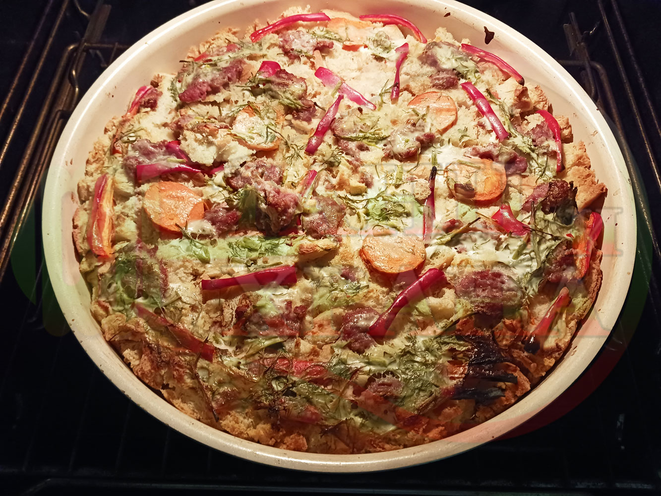 Многопластова хлебна баница "Каймянодоматена киселомлечна червеночушковоморковена" запечена на фурна с кайма, домати, червени пресни чушки и моркови с яйчено млечна заливка приготвена със свеж копър, стар чесън и кисело мляко от България