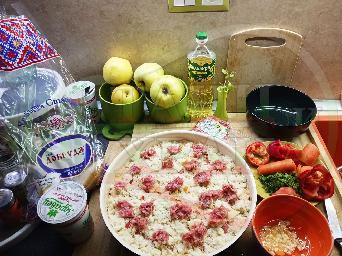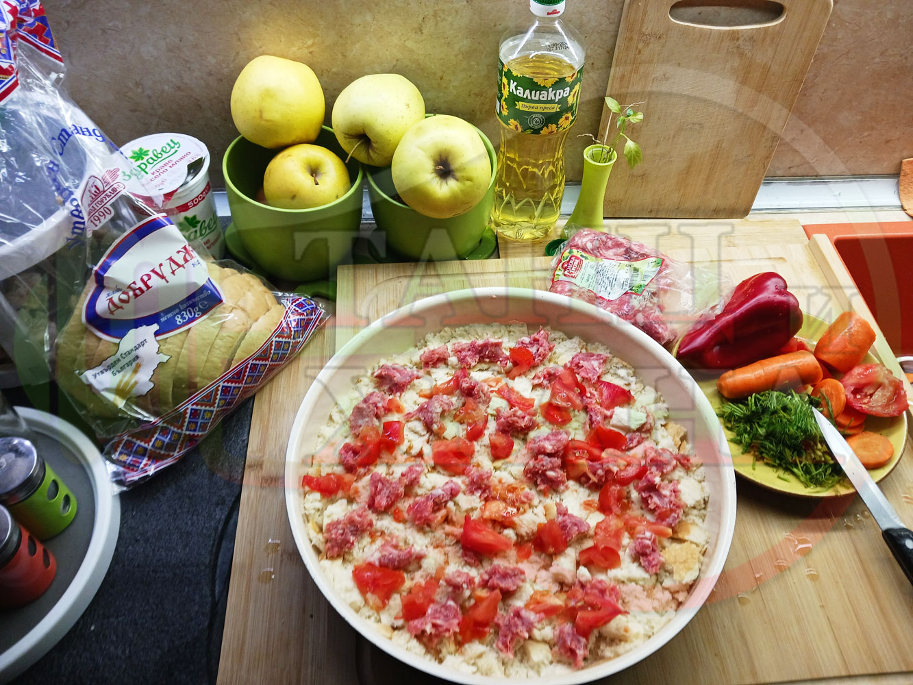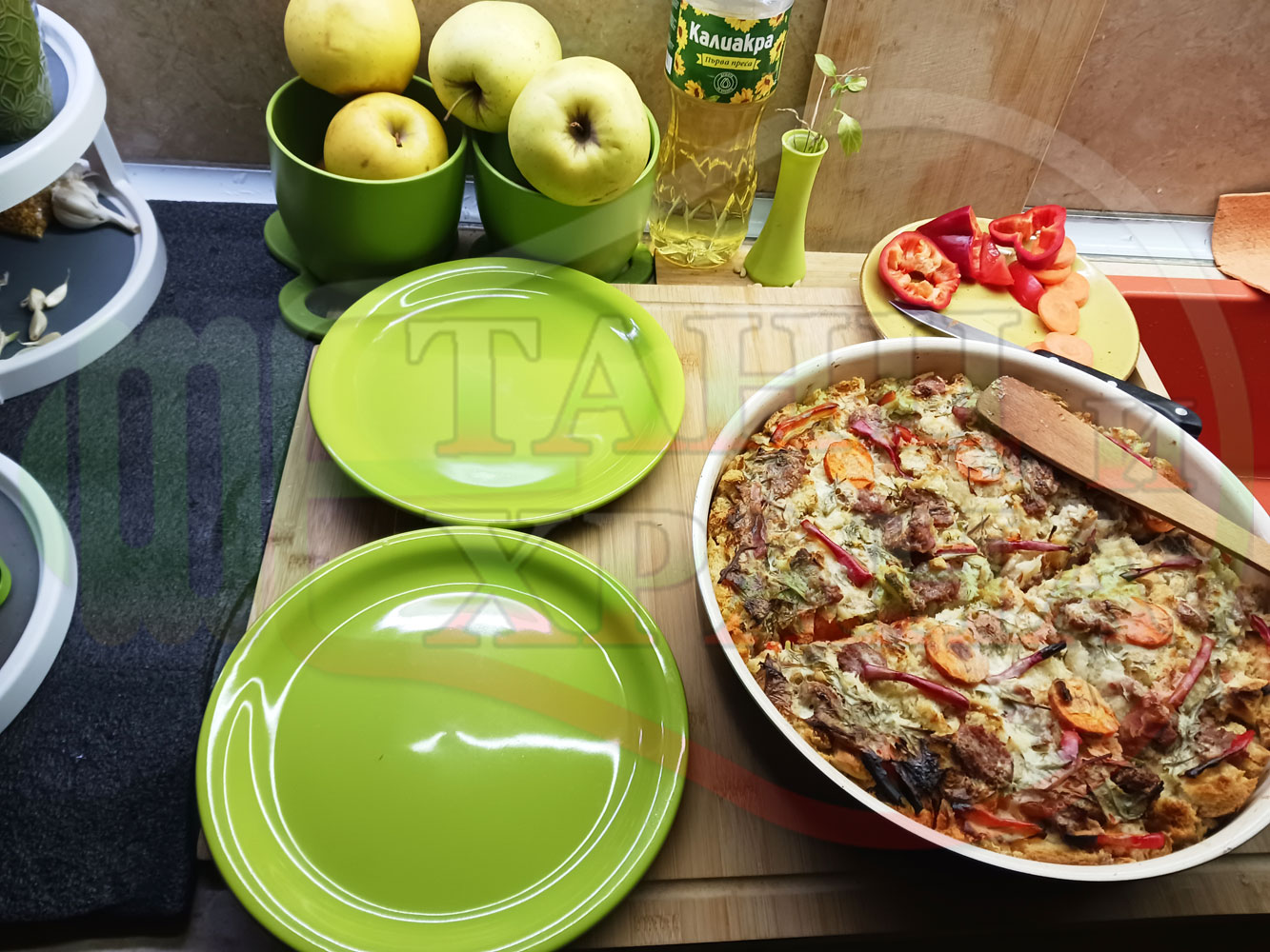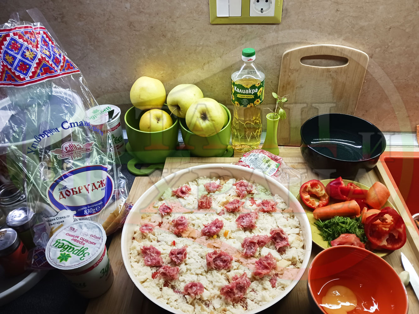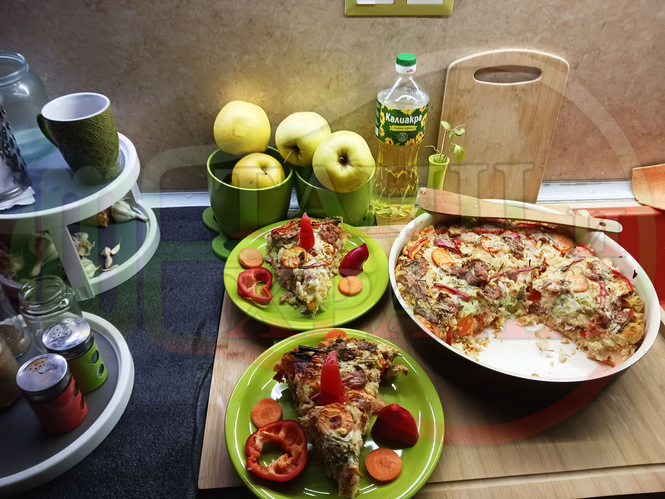Многопластова хлебна баница "Каймянодоматена киселомлечна червеночушковоморковена" запечена на фурна с кайма, домати, червени пресни чушки и моркови с яйчено млечна заливка приготвена със свеж копър, стар чесън и кисело мляко от България