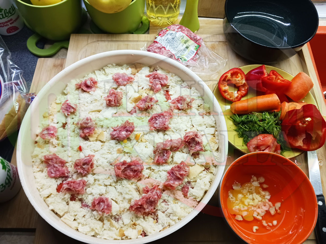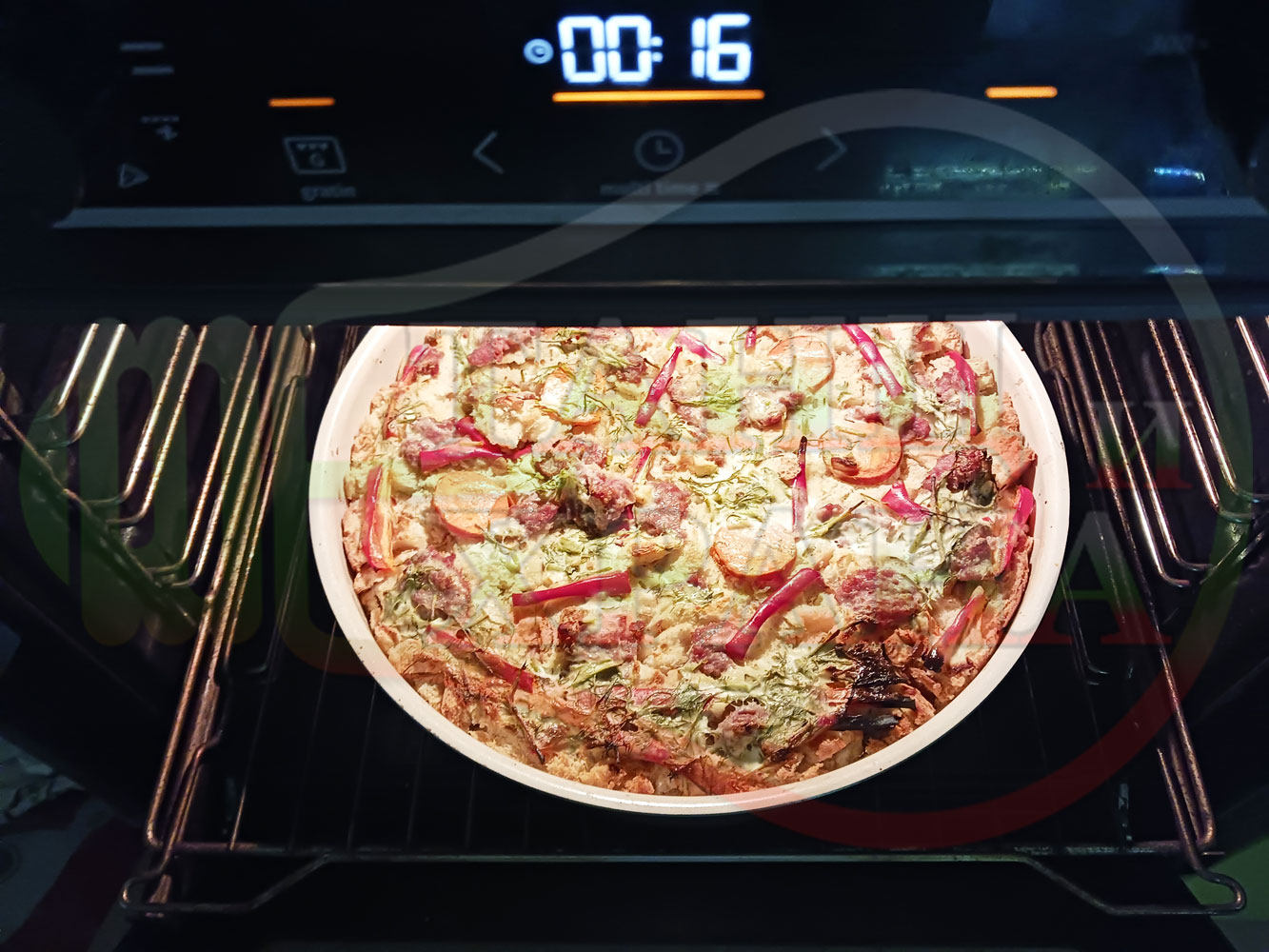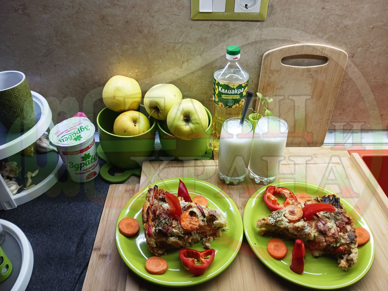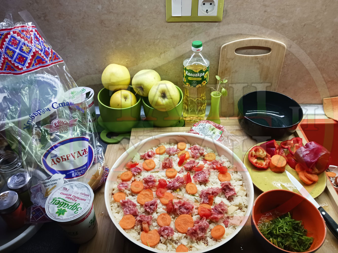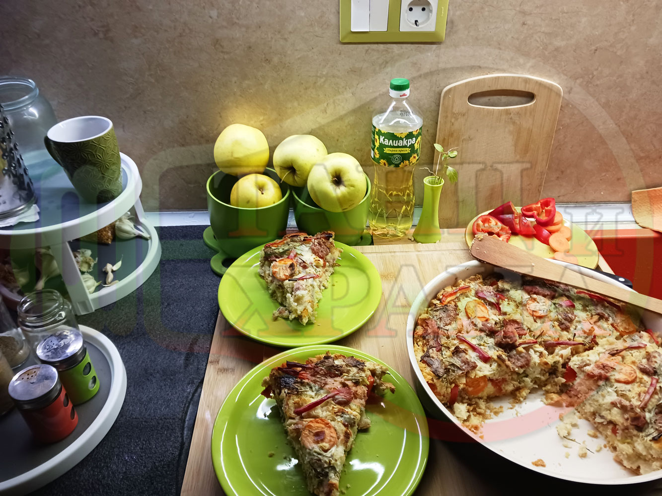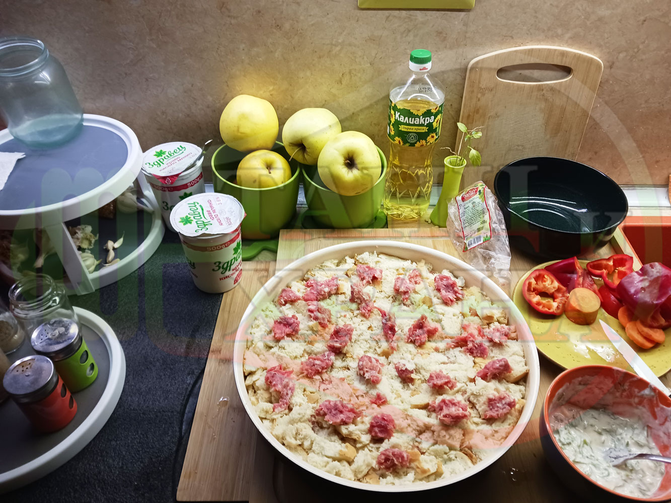 Многопластова хлебна баница "Каймянодоматена киселомлечна червеночушковоморковена" запечена на фурна с кайма, домати, червени пресни чушки и моркови с яйчено млечна заливка приготвена със свеж копър, стар чесън и кисело мляко от България