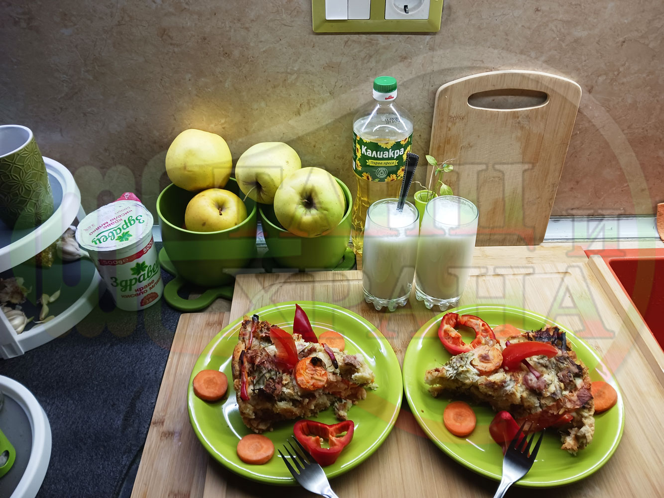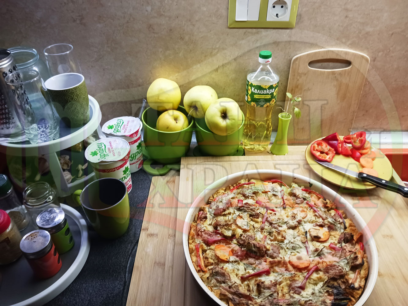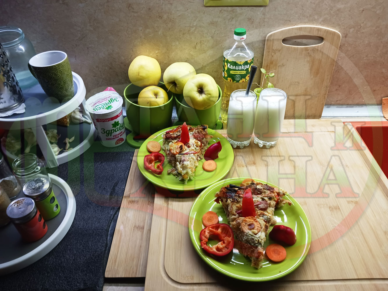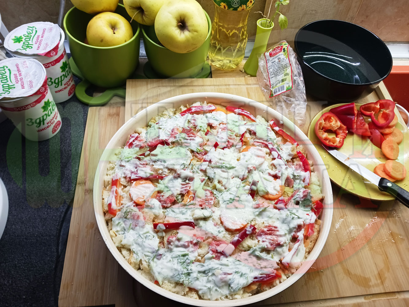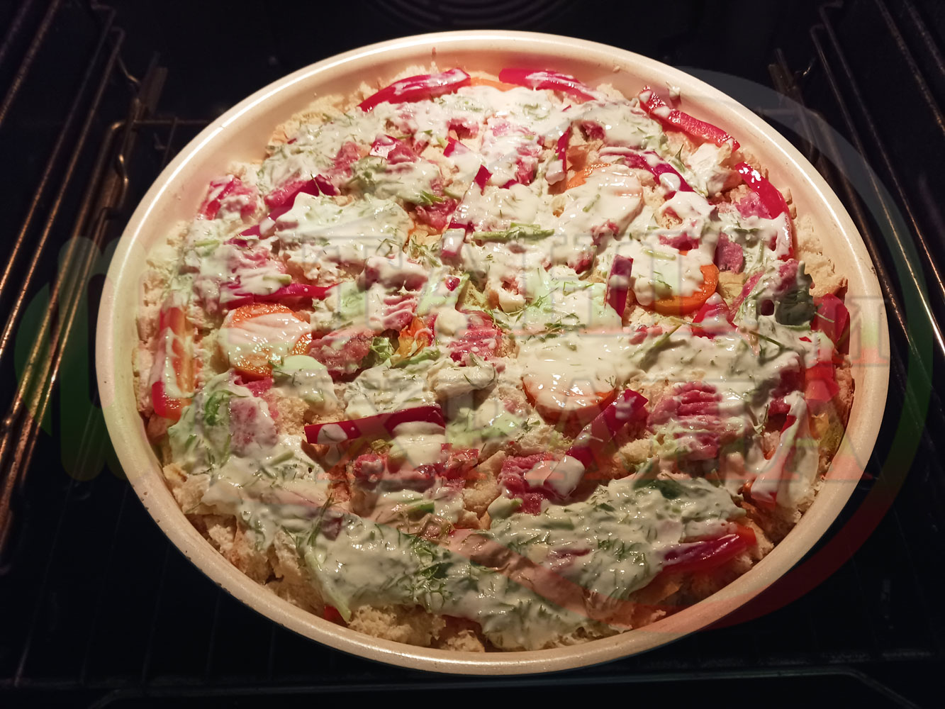 Многопластова хлебна баница "Каймянодоматена киселомлечна червеночушковоморковена" запечена на фурна с кайма, домати, червени пресни чушки и моркови с яйчено млечна заливка приготвена със свеж копър, стар чесън и кисело мляко от България