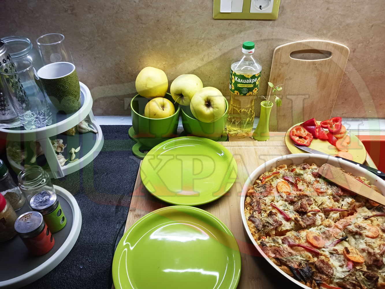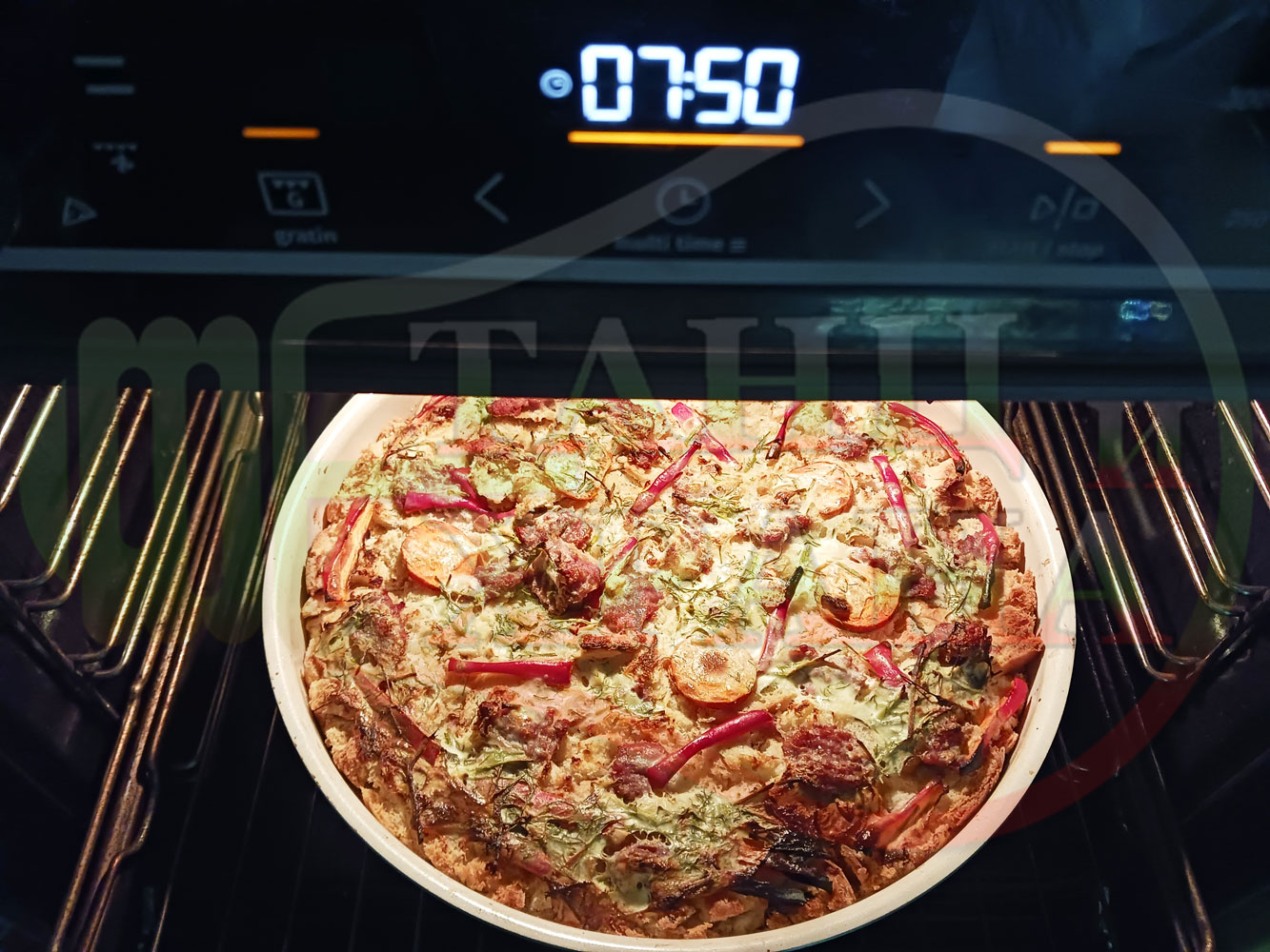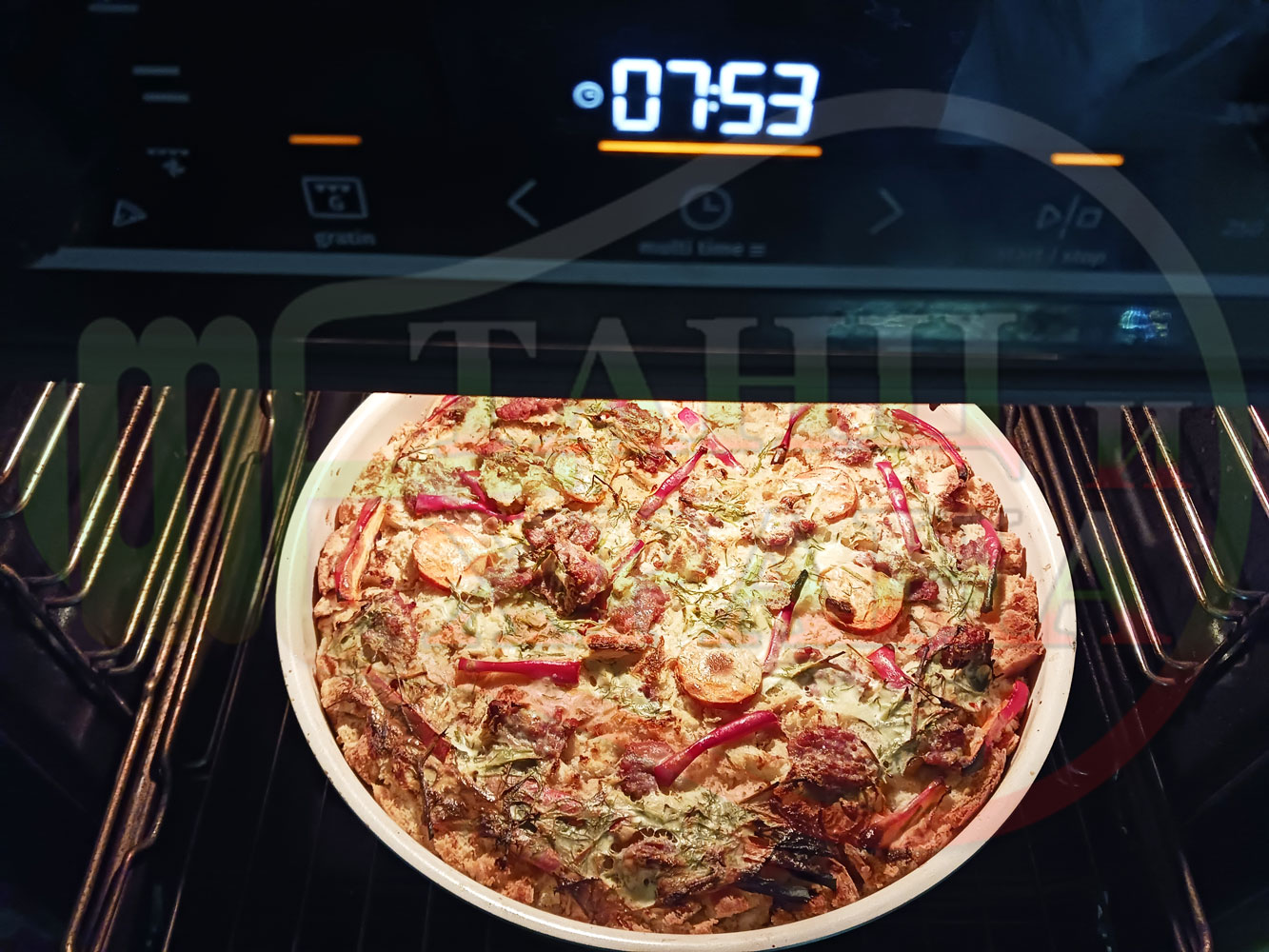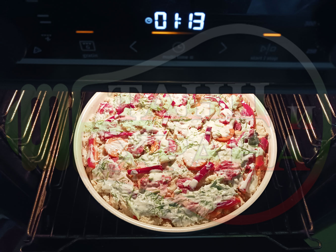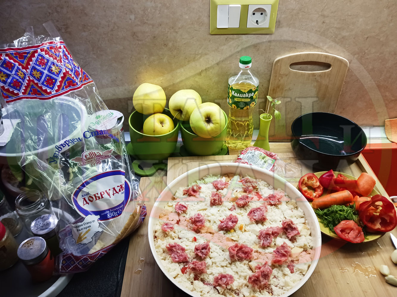 Многопластова хлебна баница "Каймянодоматена киселомлечна червеночушковоморковена" запечена на фурна с кайма, домати, червени пресни чушки и моркови с яйчено млечна заливка приготвена със свеж копър, стар чесън и кисело мляко от България