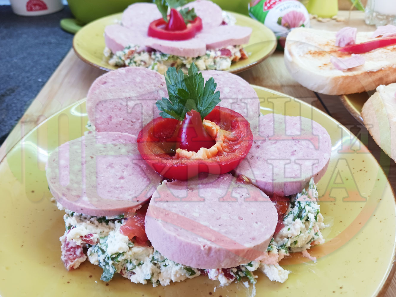 Разпределете сиреново червеночушковия крем в средата на чиниите и оформете широки "кладенчета" с плътно дъно и високи стени, така че да задържат доматения сок с пулпата и салама. Разпределете равномерно доматения сок с пулпата в кладенчетата, загладете го и подредете нарязания на кръгчета салам (подредете салама по ваше желание и усмотрение). Украсете порциите с по един чушков обръч, поставен в центъра на кладенчетата и с чушковите връхчета и магданозени листенца (украсете по ваше желание и усмотрение).