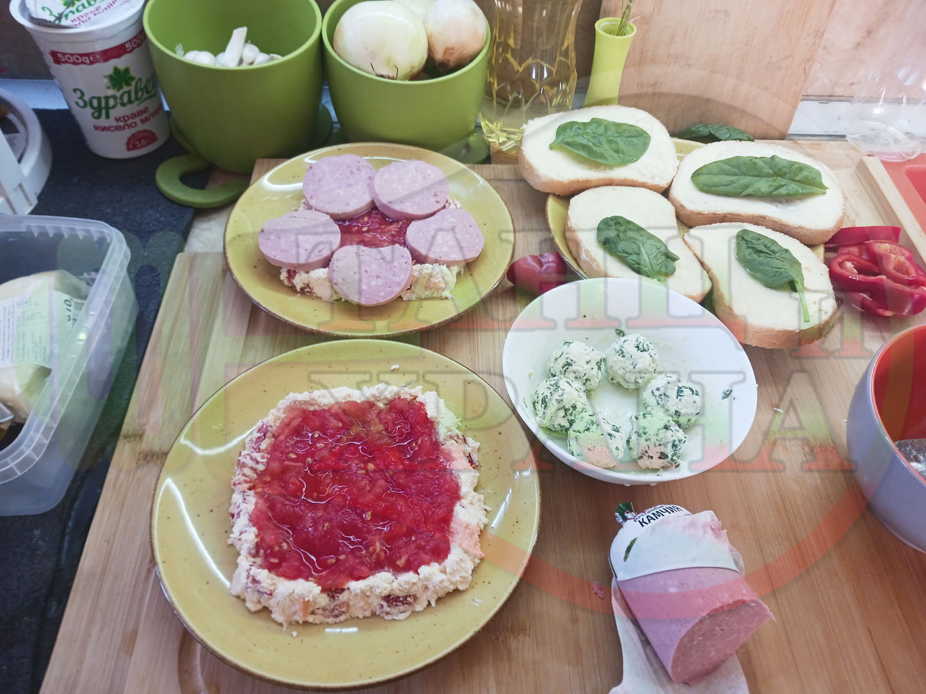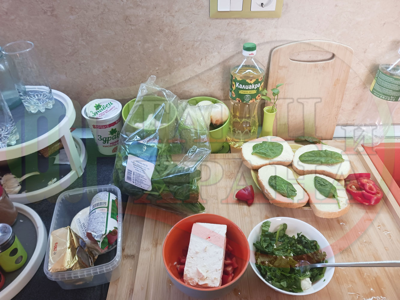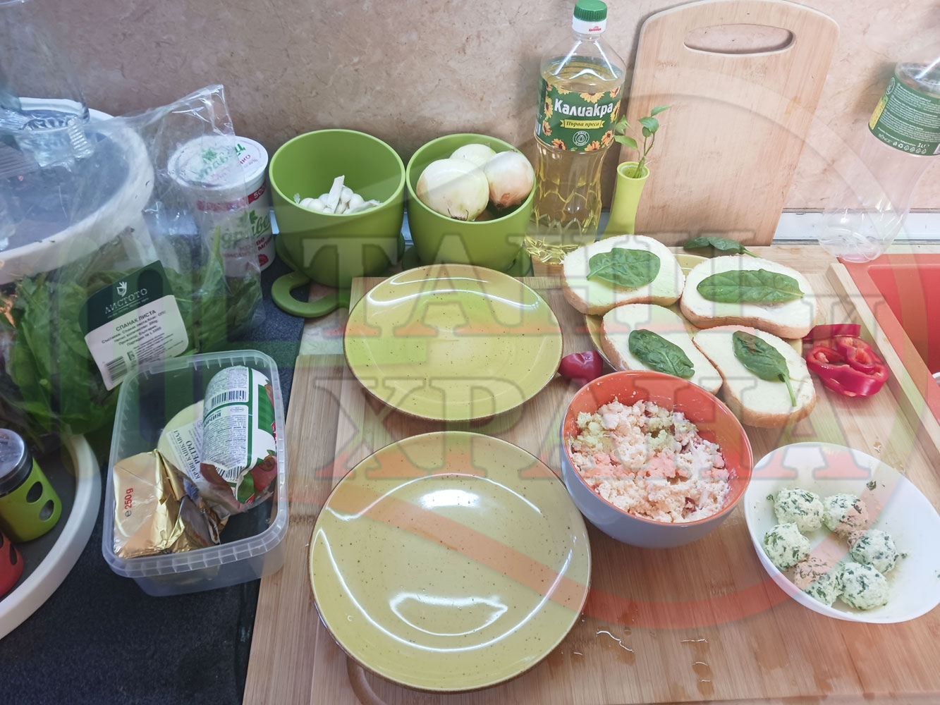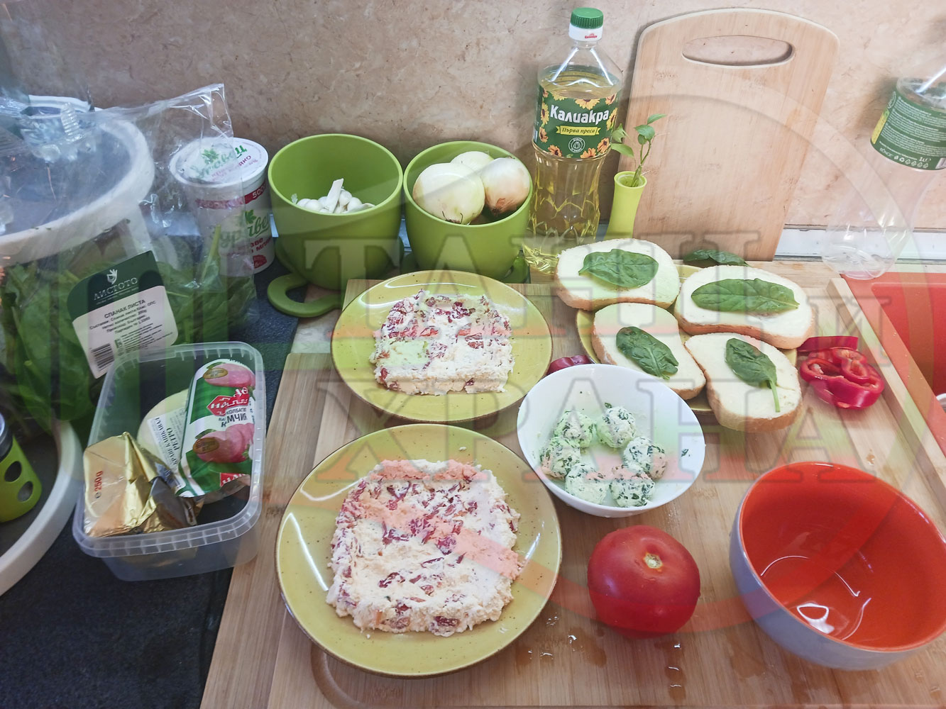 ПРОДУКТИ: Приблизителни количества за българска доматена сурова топчеста супа "Камчиевосаламена доматеночушкова спаначена с БГсирене " приготвена с домати напълнени в кладенчета от червени пресни чушки и краве бяло сирене гарнирана с пикантен салам и сиренови топчета със спанак - двукомпонентна