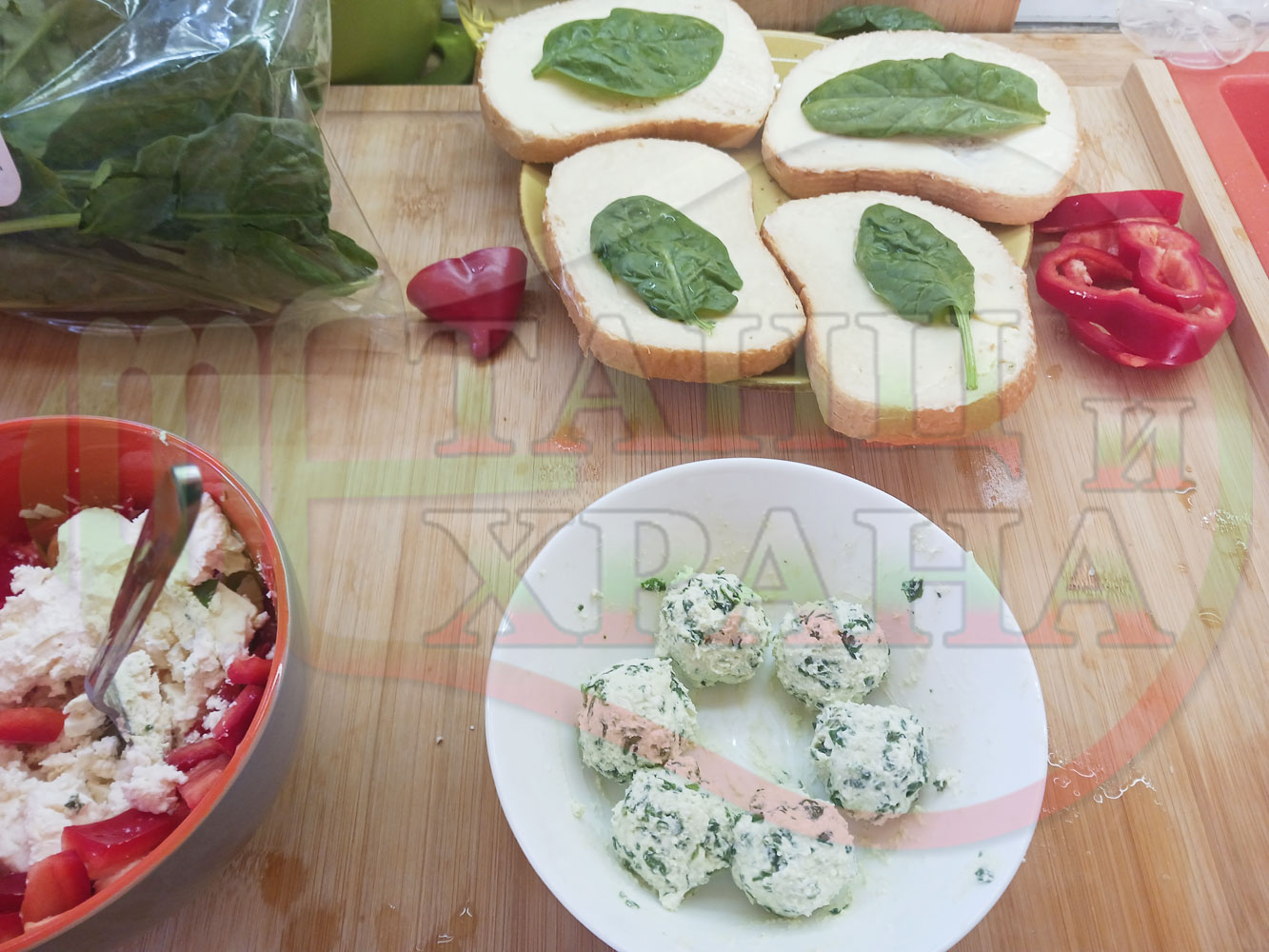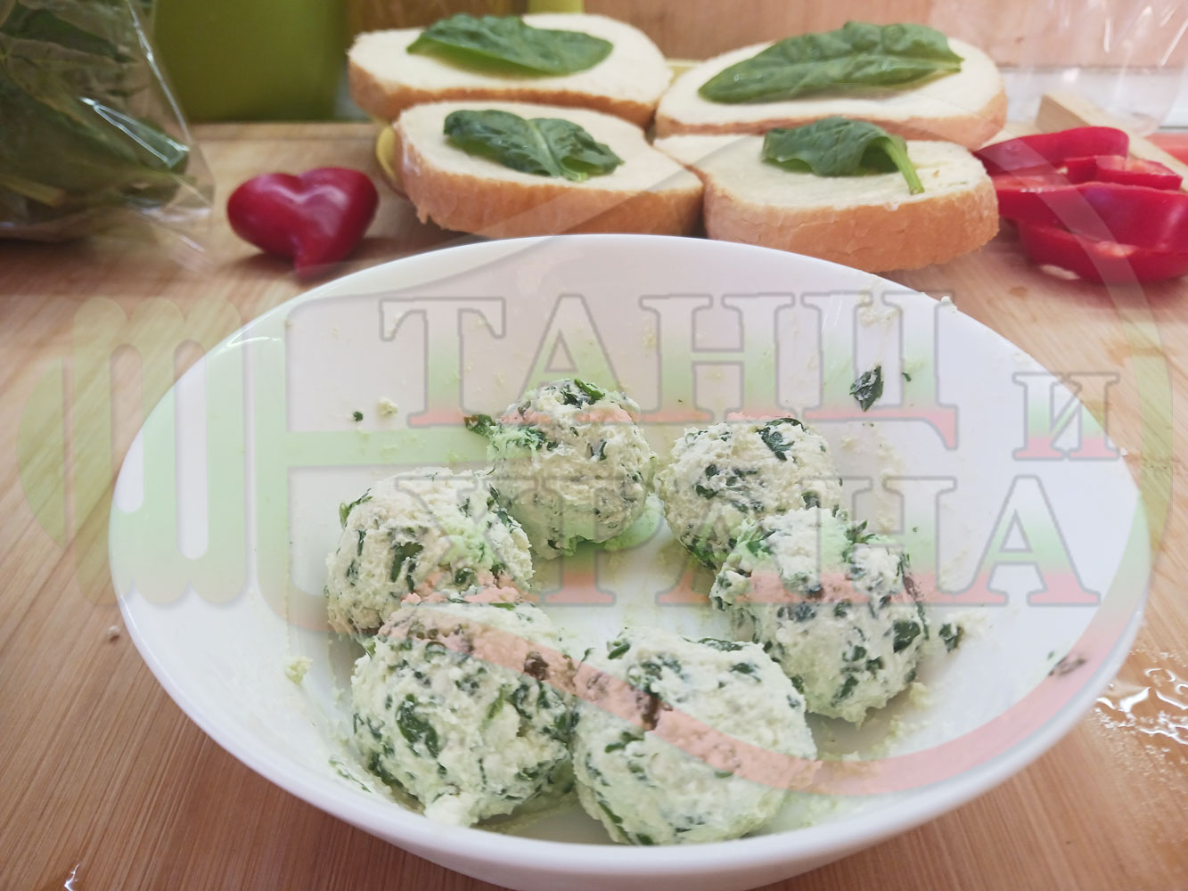 Поставете кравето бяло сирене в купа и добавете измития и нарязан на едро спанак (заделете няколко по-хубави и цели спаначени листа за украса). Разбъркайте и намачкайте с вилица до образуване на сравнително гъст сиреново спаначен, хомогенизиран крем. Оформете 6 малки топчета от сиреново спаначения крем (по 3 топчета за всяка порция).