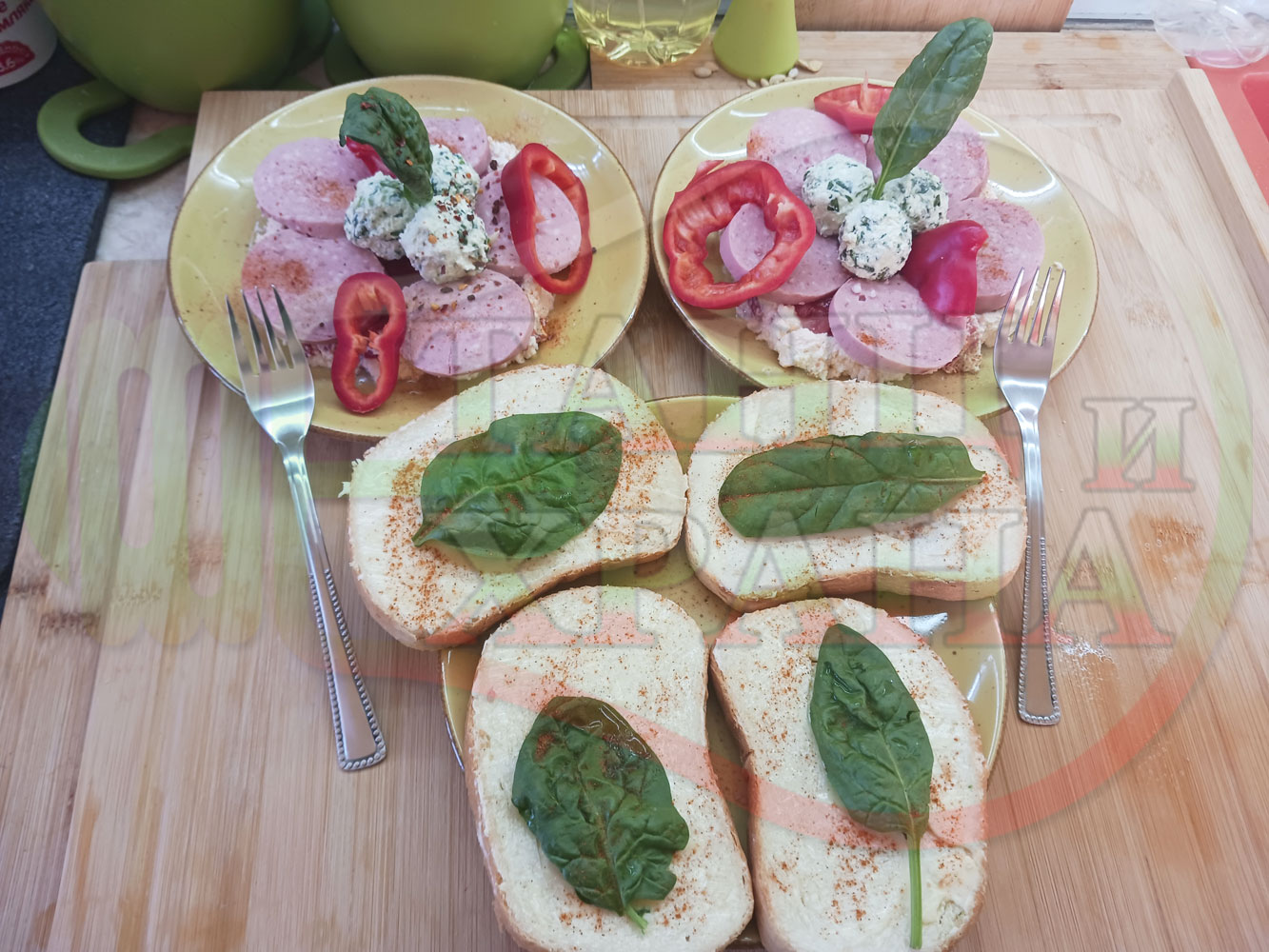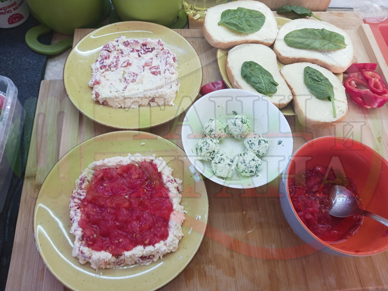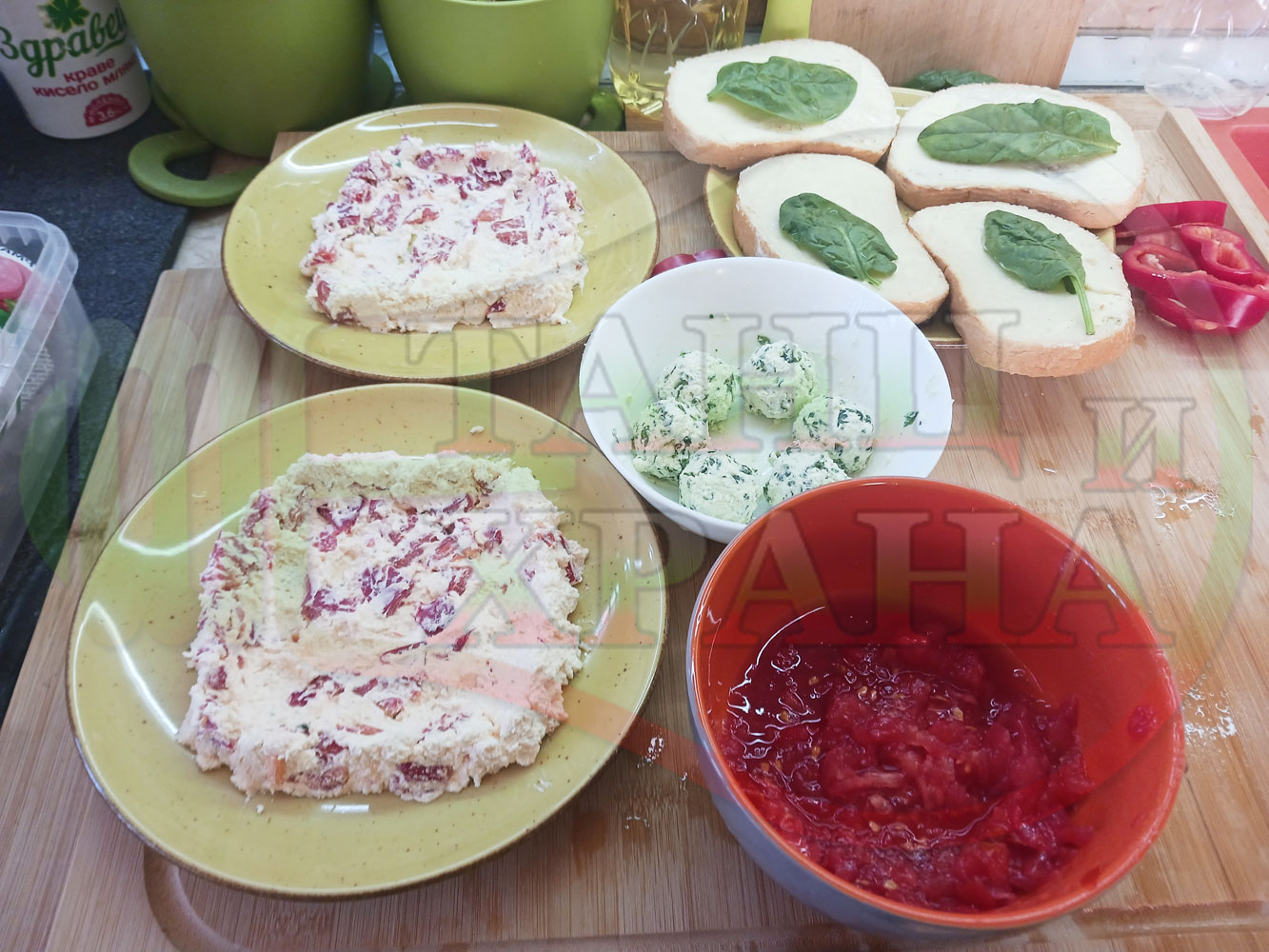 Добавете червен лют и/или сладък пипер при приготвянето на сиреново червеночушковия крем и/или поръсете готовите порции на вкус. Поднесете порциите с препечени на тостер филийки, намазани с краве масло и поръсени с червен сладък пипер и/или шарена сол. Украсете филийките със спаначени листа (украсете по ваше желание и усмотрение).