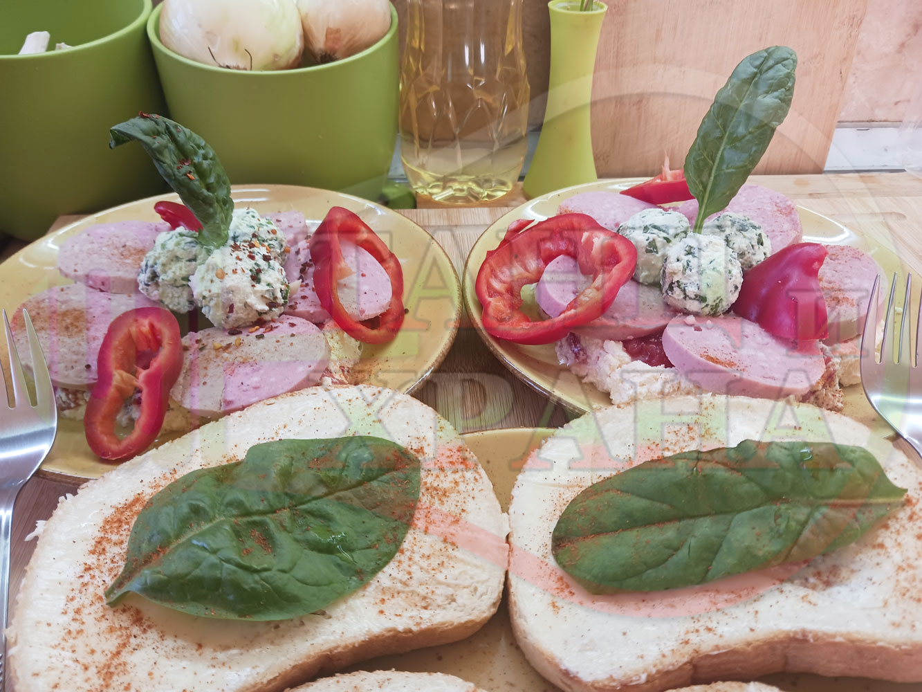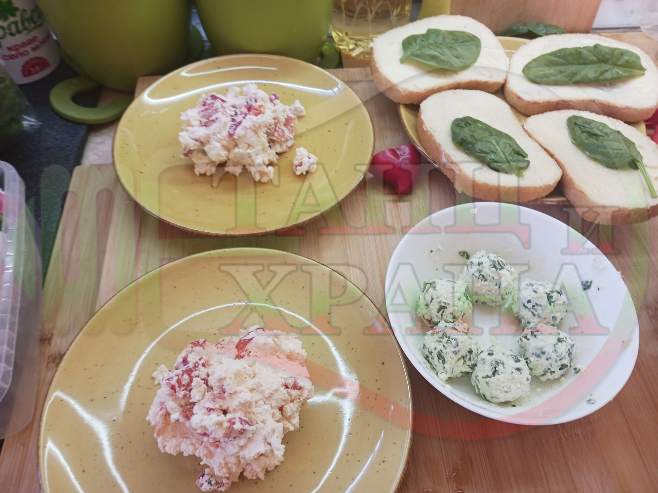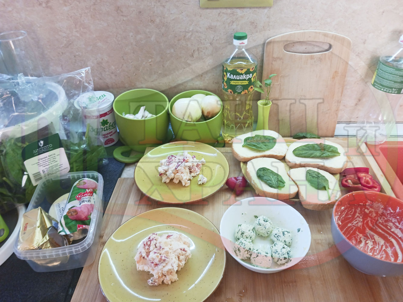 Добавете червен лют и/или сладък пипер при приготвянето на сиреново червеночушковия крем и/или поръсете готовите порции на вкус. Поднесете порциите с препечени на тостер филийки, намазани с краве масло и поръсени с червен сладък пипер и/или шарена сол. Украсете филийките със спаначени листа (украсете по ваше желание и усмотрение).