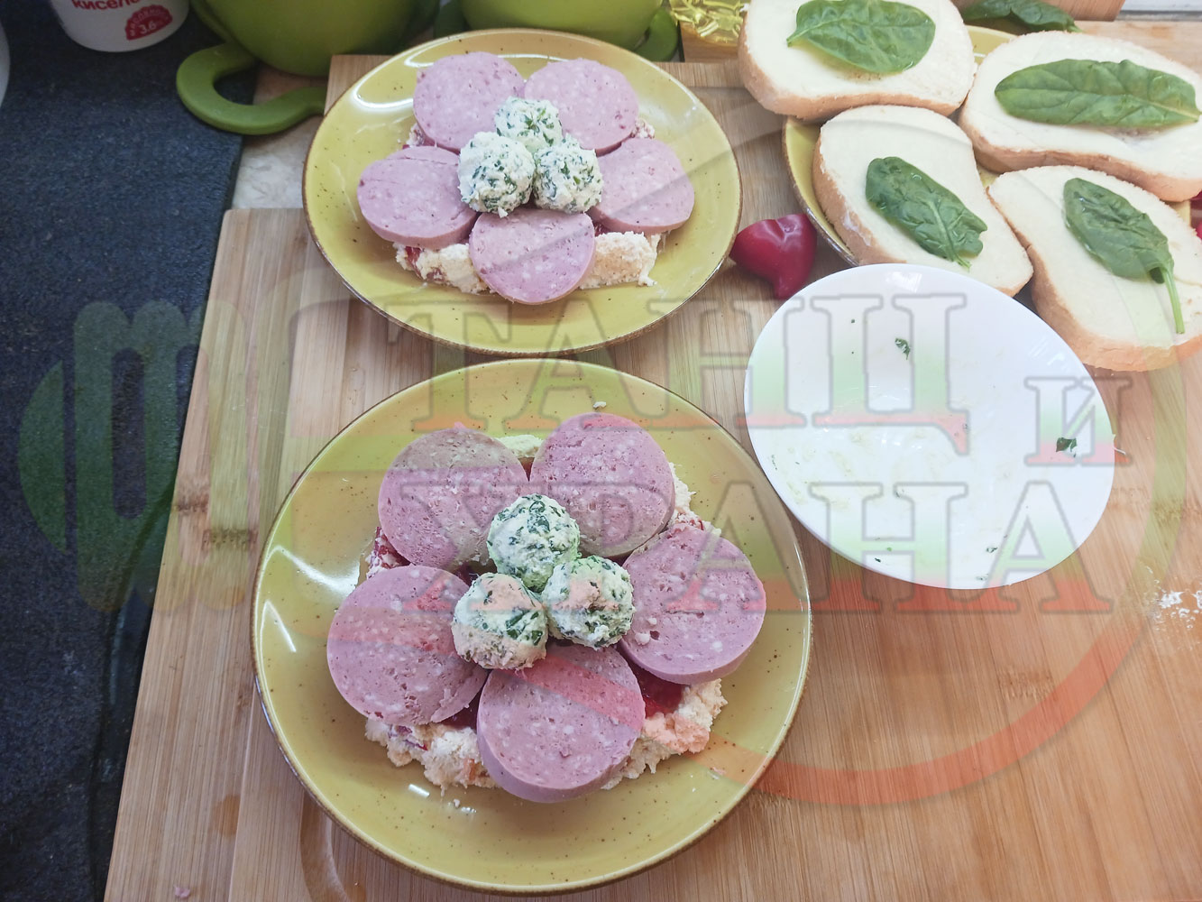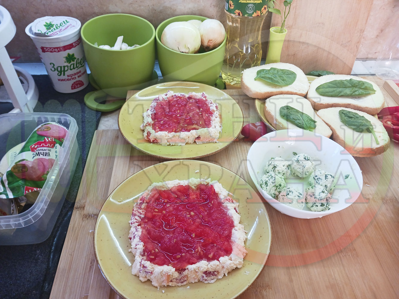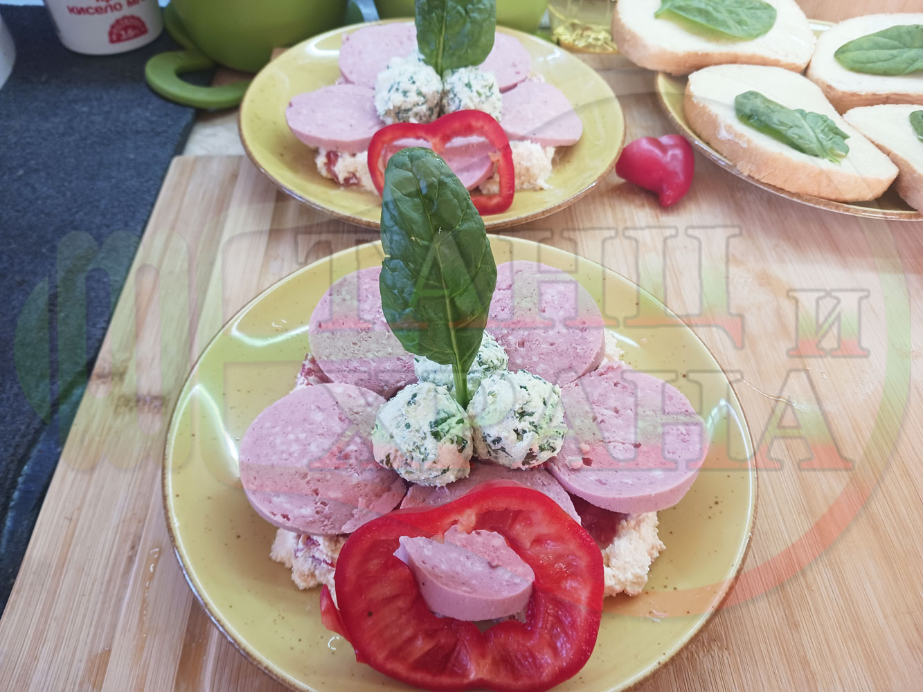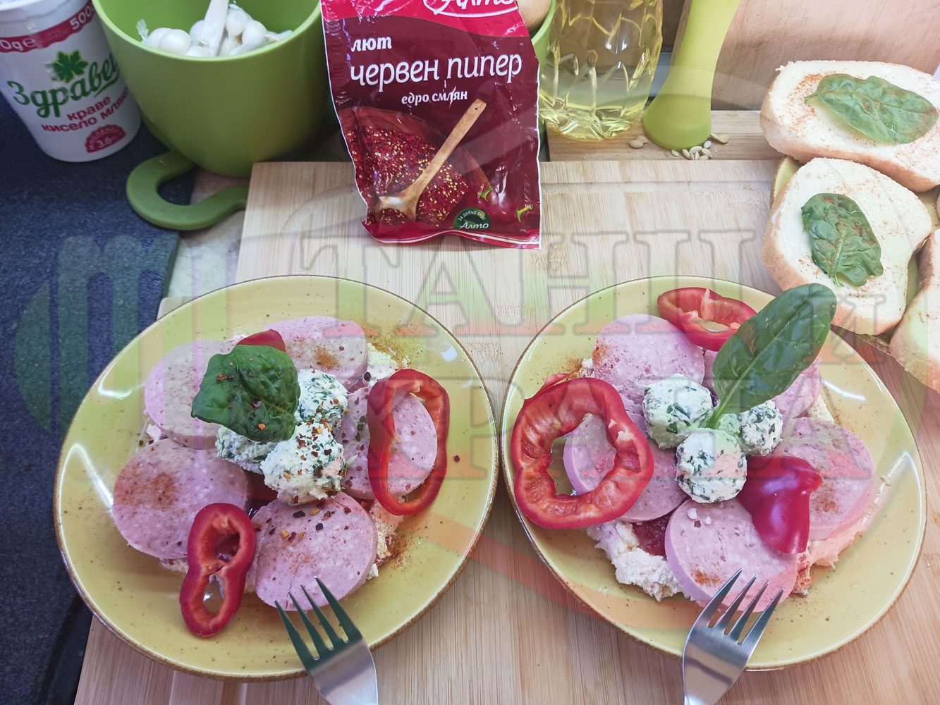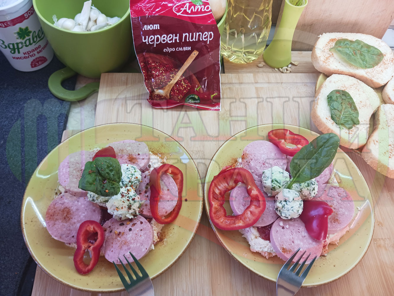 Разпределете сиреново червеночушковия крем в средата на чиниите и оформете широки "кладенчета" с плътно дъно и високи стени, така че да задържат доматения сок с пулпата и салама. Разпределете равномерно доматения сок с пулпата в кладенчетата, загладете го и подредете нарязания на кръгчета салам (подредете салама по ваше желание и усмотрение). Поставете по 3 сиреново спаначени топчета в центъра на кладенчетата между подредените саламени кръгчета. Украсете порциите с по един чушков обръч, с чушковите връхчета и спаначени листенца (украсете по ваше желание и усмотрение).