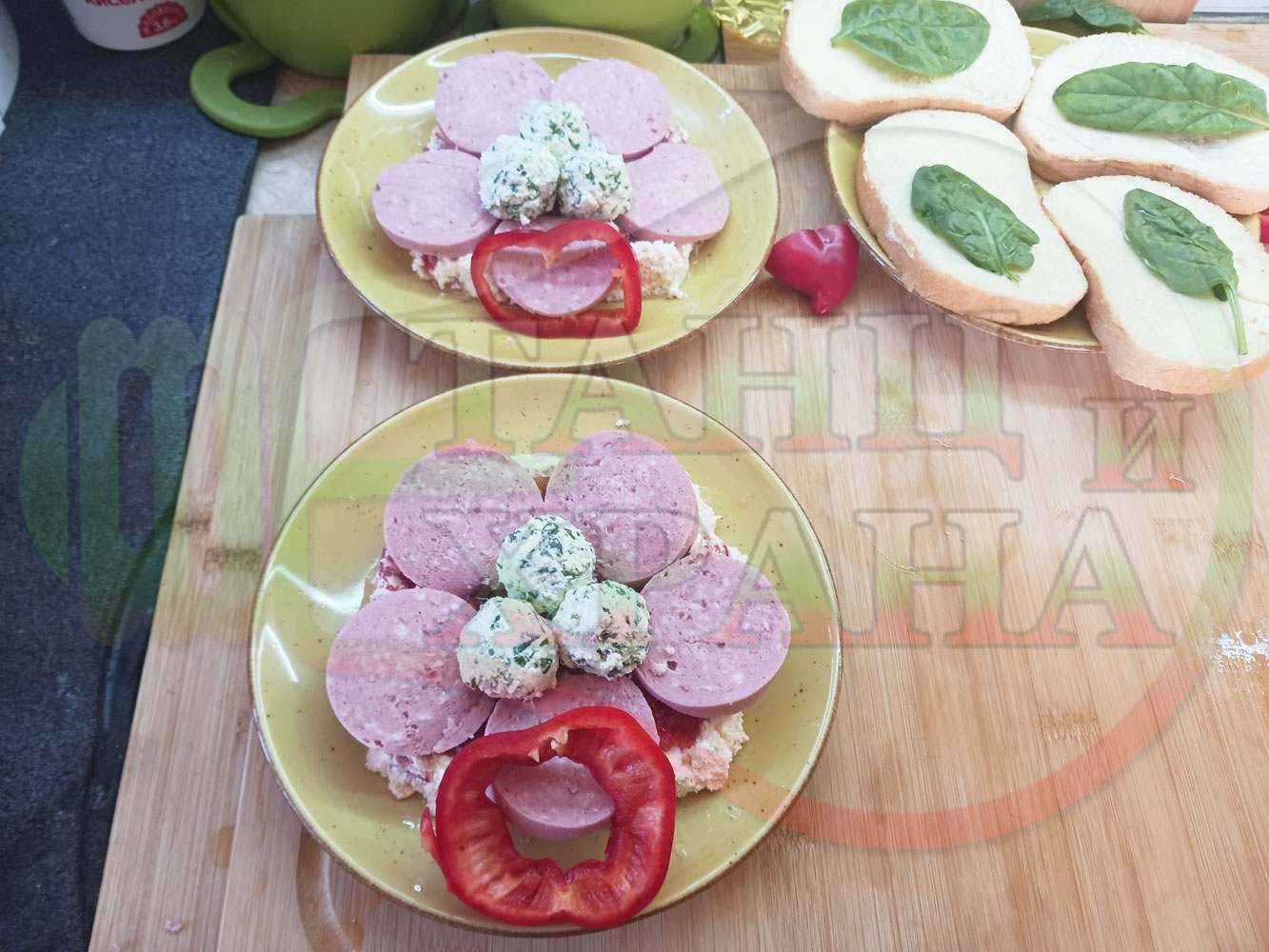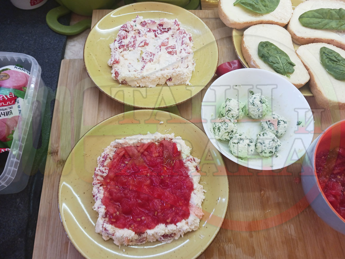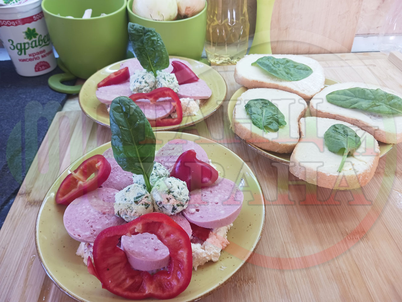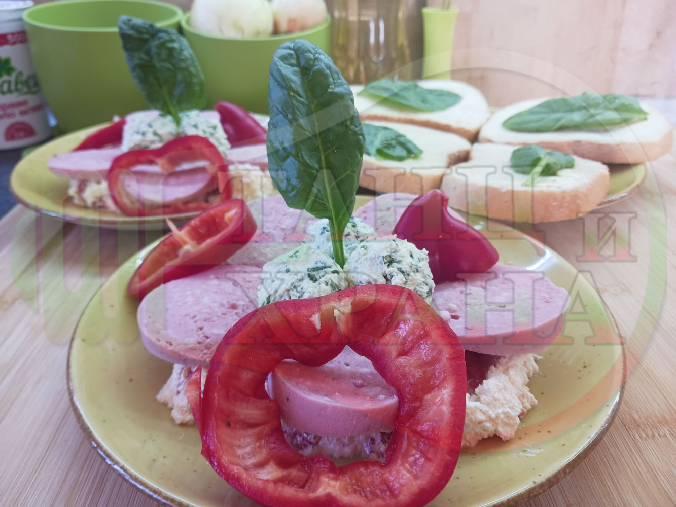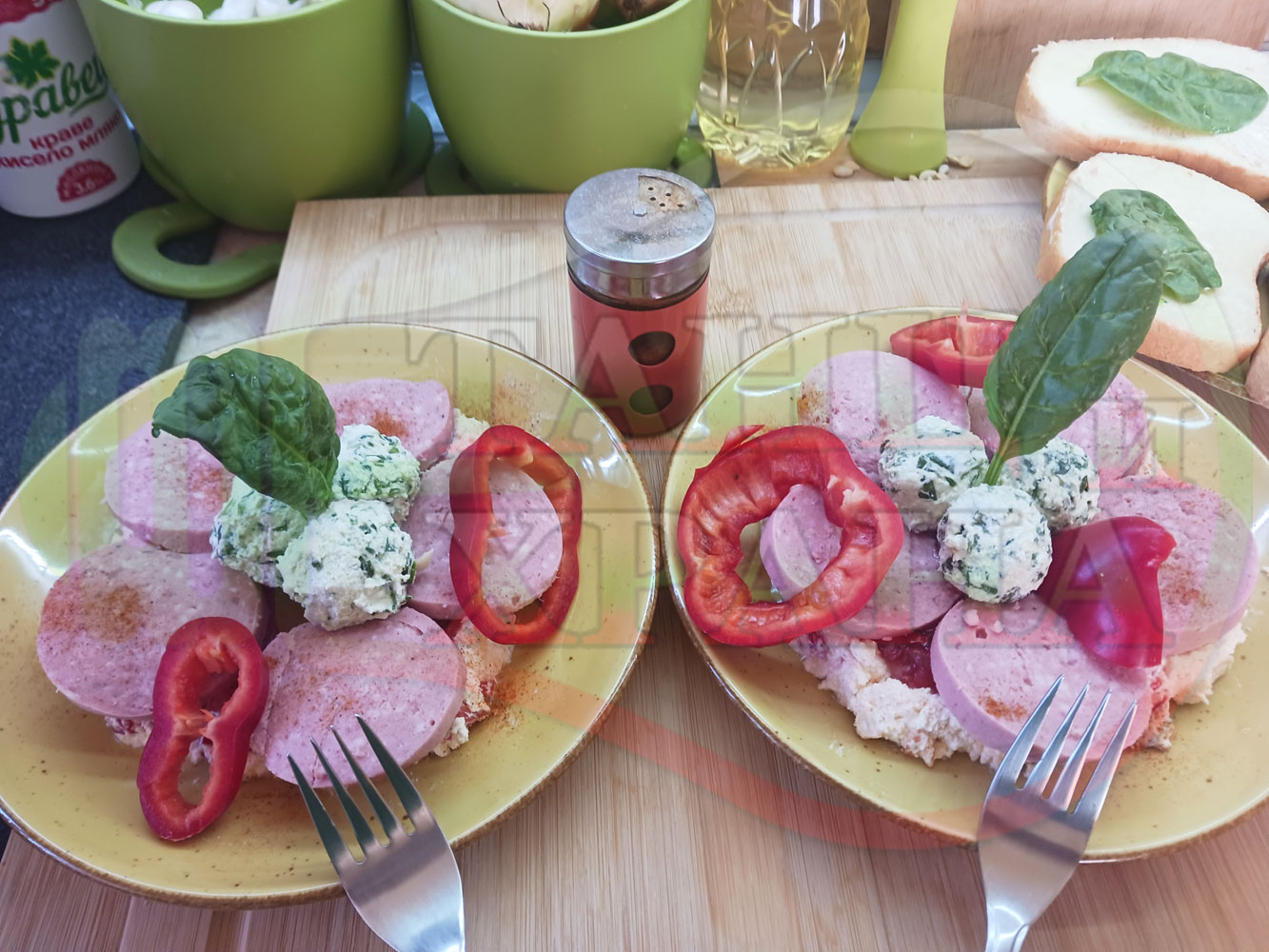 Разпределете сиреново червеночушковия крем в средата на чиниите и оформете широки "кладенчета" с плътно дъно и високи стени, така че да задържат доматения сок с пулпата и салама. Разпределете равномерно доматения сок с пулпата в кладенчетата, загладете го и подредете нарязания на кръгчета салам (подредете салама по ваше желание и усмотрение). Поставете по 3 сиреново спаначени топчета в центъра на кладенчетата между подредените саламени кръгчета. Украсете порциите с по един чушков обръч, с чушковите връхчета и спаначени листенца (украсете по ваше желание и усмотрение).