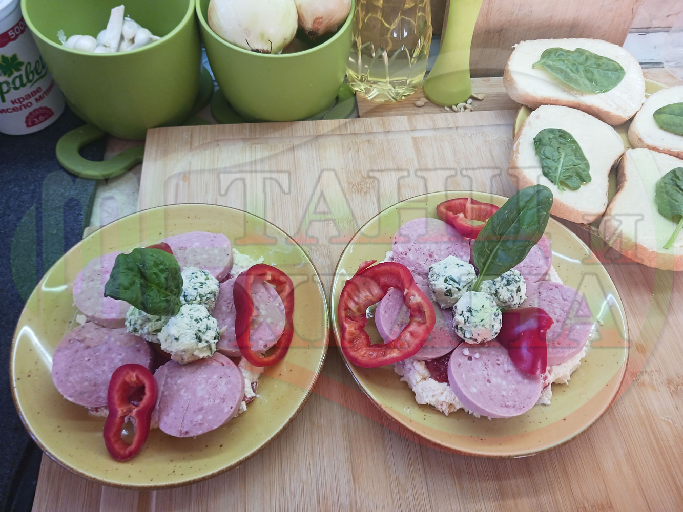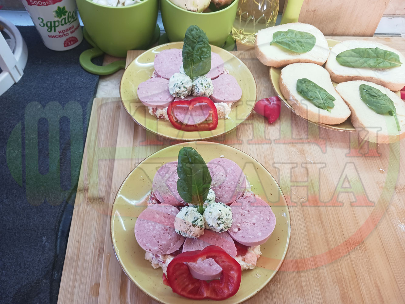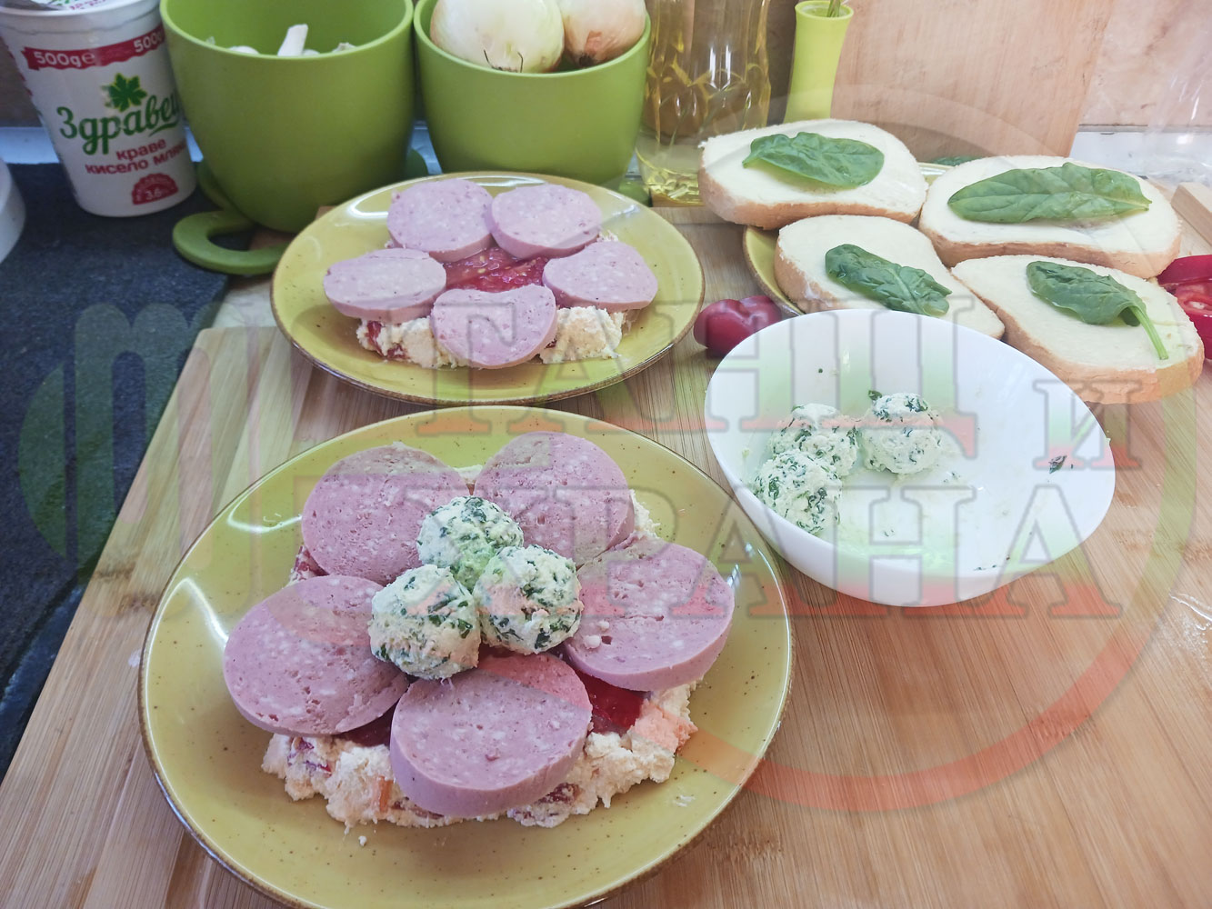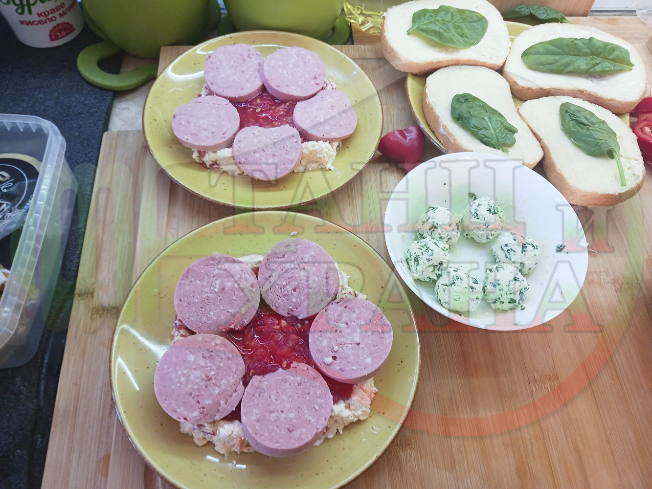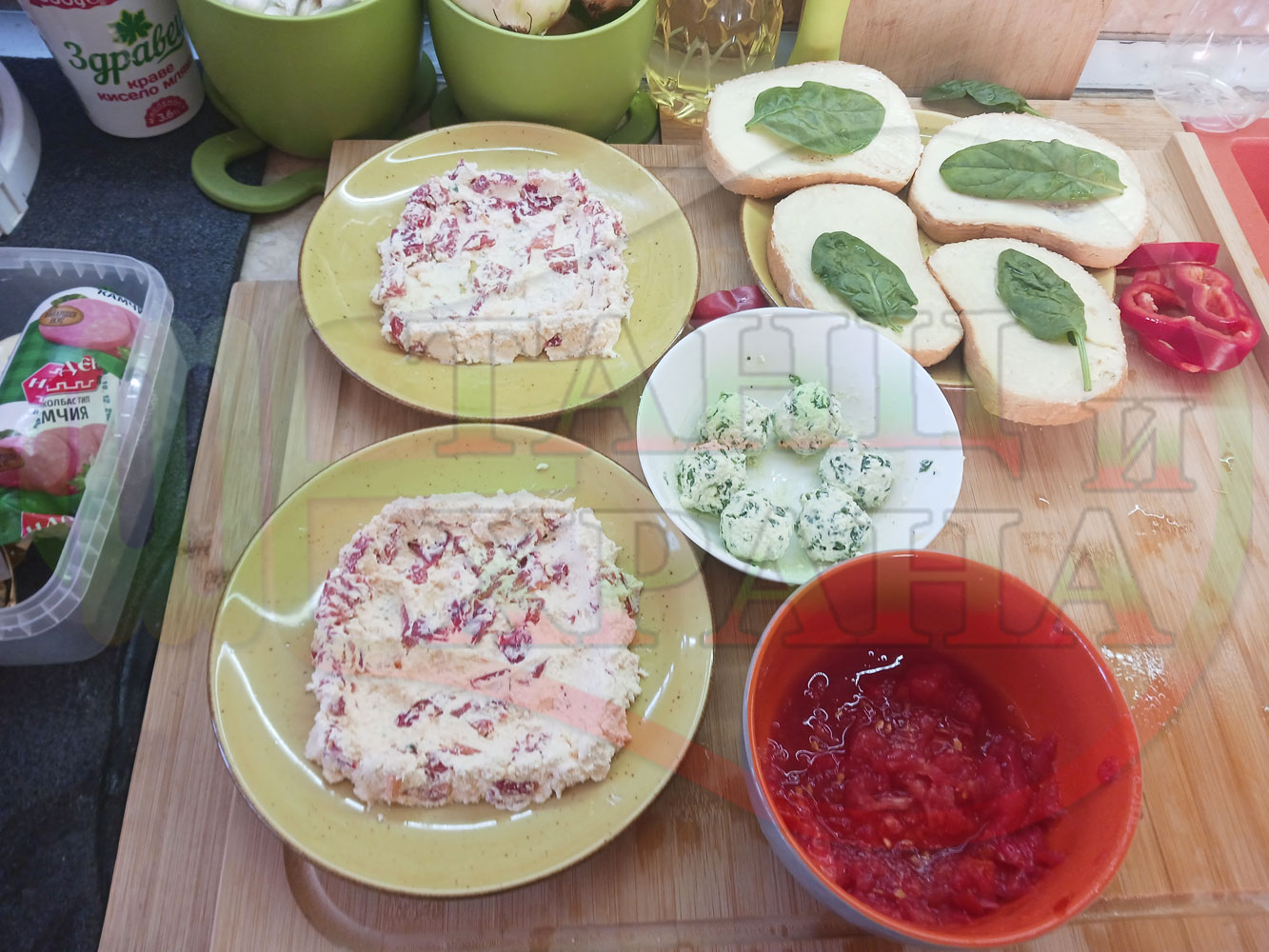 Разпределете сиреново червеночушковия крем в средата на чиниите и оформете широки "кладенчета" с плътно дъно и високи стени, така че да задържат доматения сок с пулпата и салама. Разпределете равномерно доматения сок с пулпата в кладенчетата, загладете го и подредете нарязания на кръгчета салам (подредете салама по ваше желание и усмотрение). Поставете по 3 сиреново спаначени топчета в центъра на кладенчетата между подредените саламени кръгчета. Украсете порциите с по един чушков обръч, с чушковите връхчета и спаначени листенца (украсете по ваше желание и усмотрение).