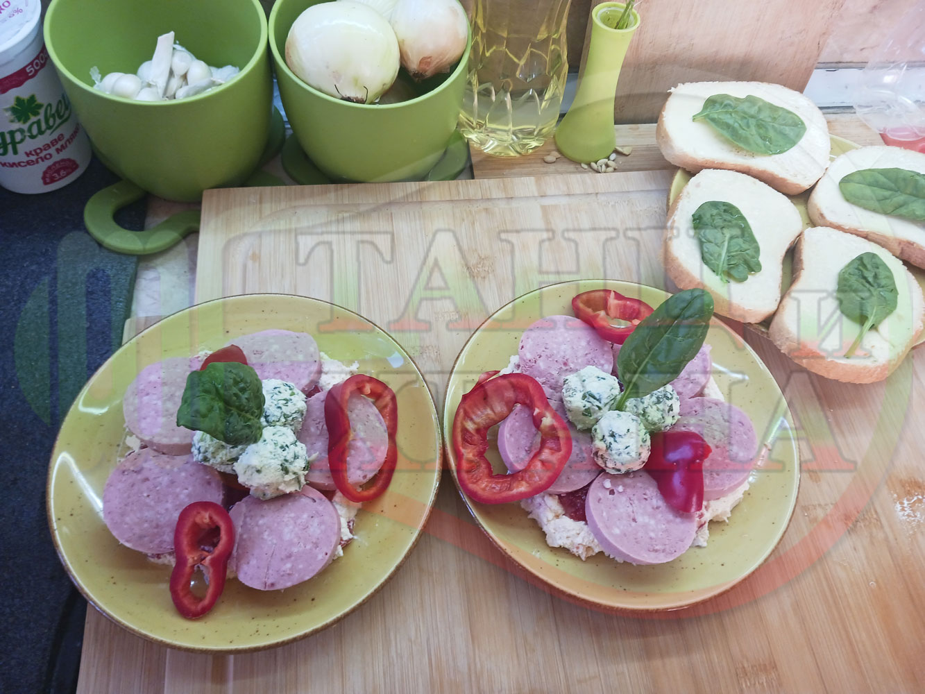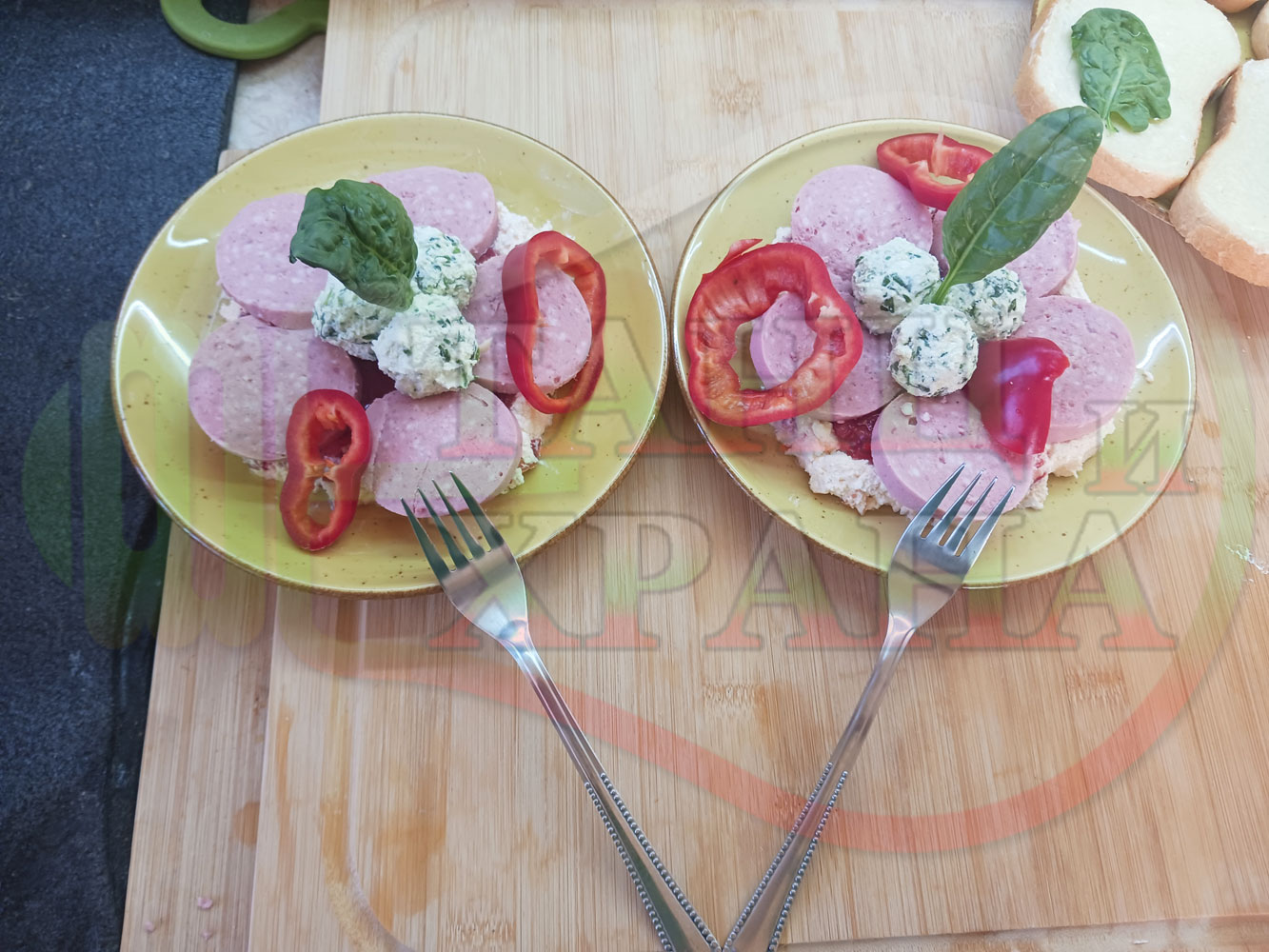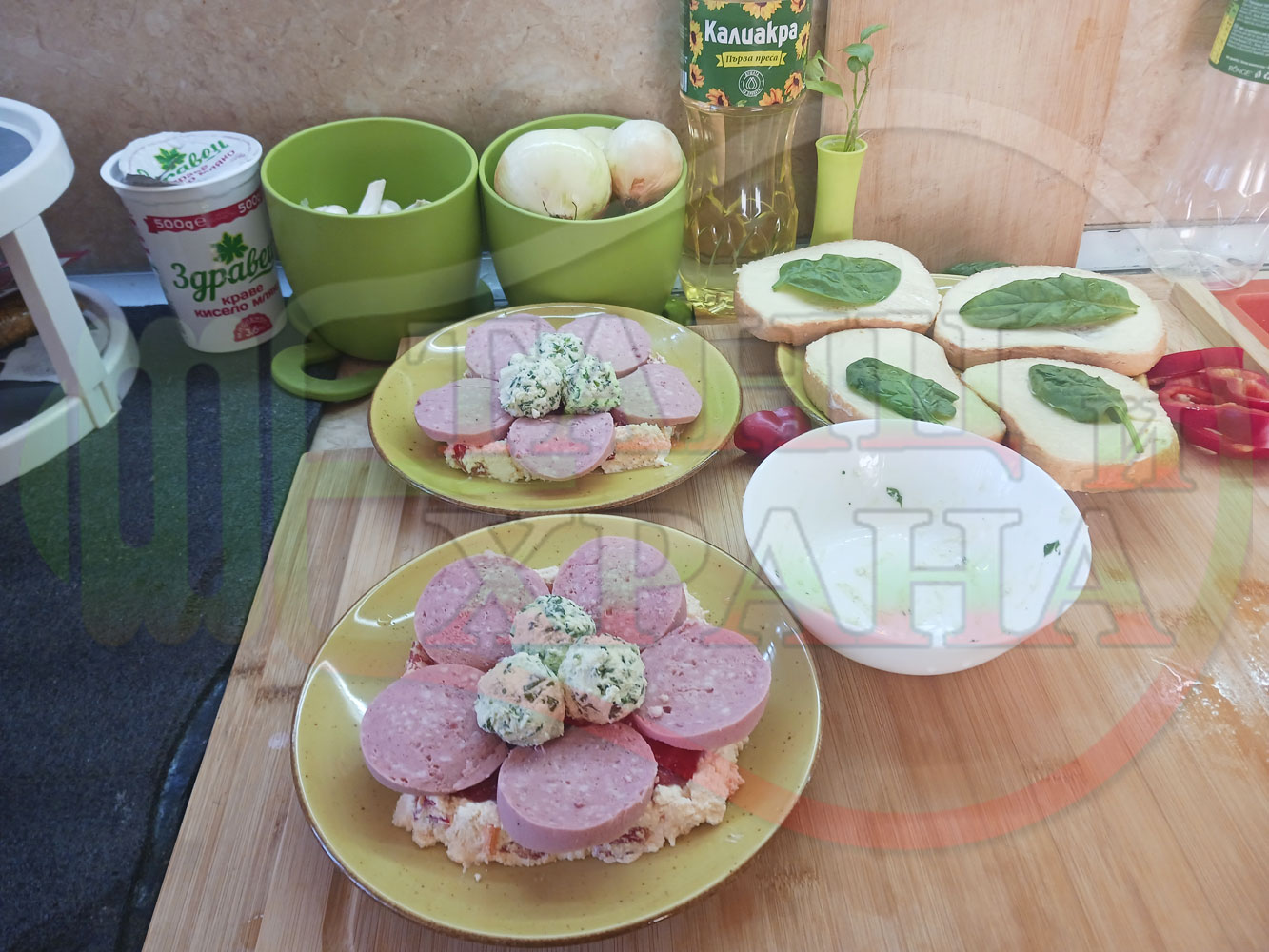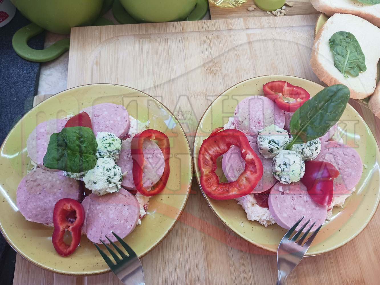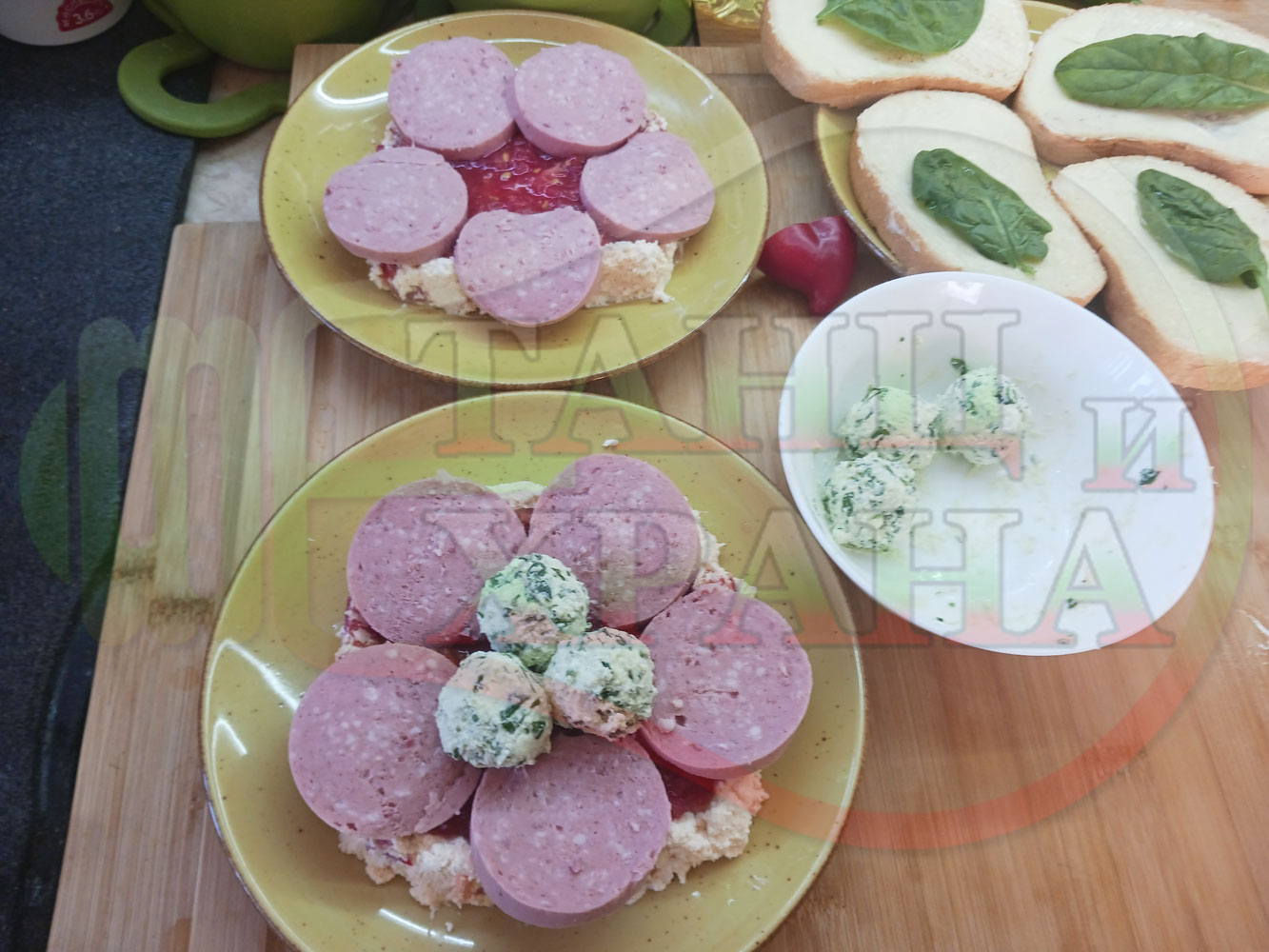 Разпределете сиреново червеночушковия крем в средата на чиниите и оформете широки "кладенчета" с плътно дъно и високи стени, така че да задържат доматения сок с пулпата и салама. Разпределете равномерно доматения сок с пулпата в кладенчетата, загладете го и подредете нарязания на кръгчета салам (подредете салама по ваше желание и усмотрение). Поставете по 3 сиреново спаначени топчета в центъра на кладенчетата между подредените саламени кръгчета. Украсете порциите с по един чушков обръч, с чушковите връхчета и спаначени листенца (украсете по ваше желание и усмотрение).