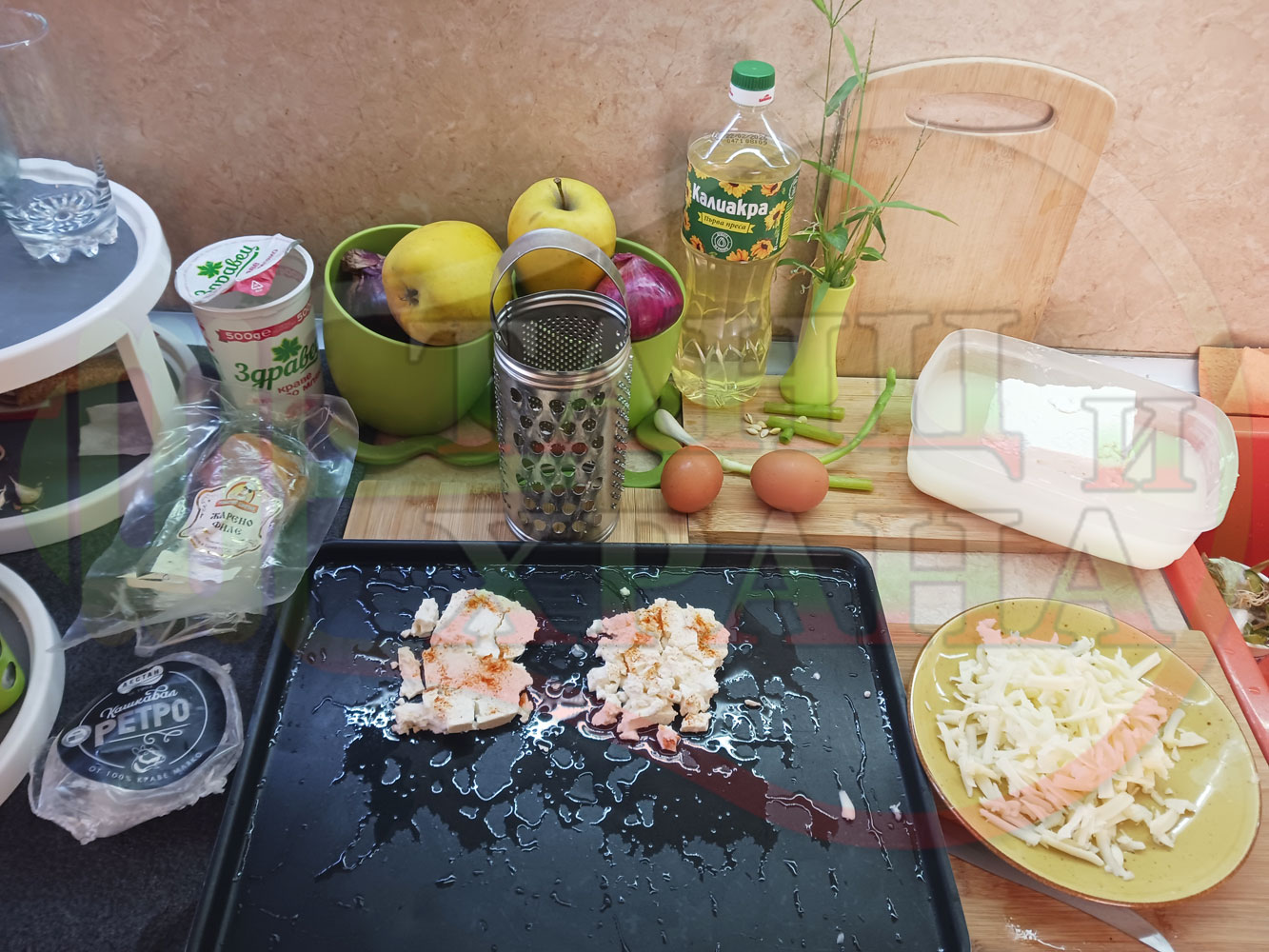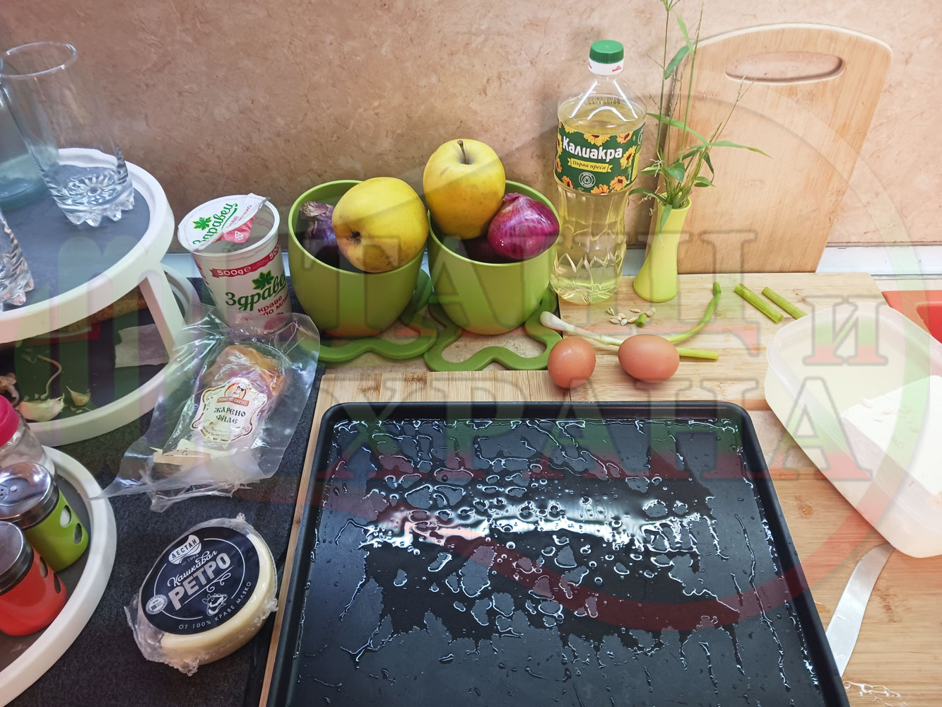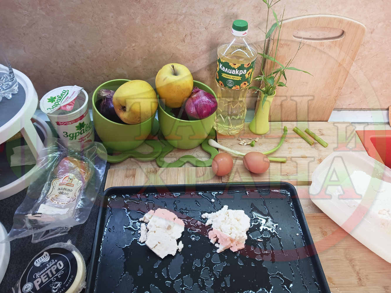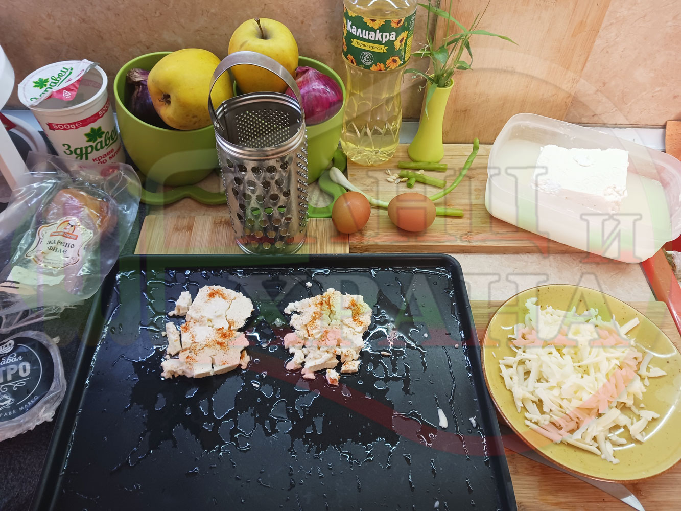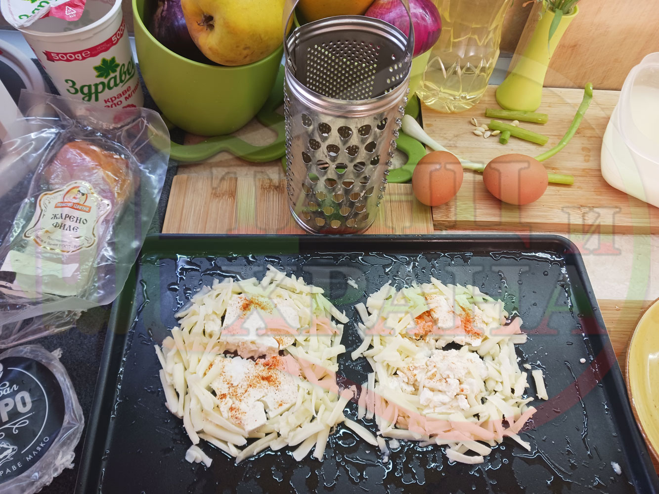 ПРОДУКТИ: Приблизителни количества за яйца на очи "Кашкаваленояйчени филежаренови с БГсирене" запечени на фурна с млечен кашкавал, жарено филе, червен сладък пипер, пресен лук и краве бяло сирене (българско, саламурено) гарнирани с млечна основа от кисело мляко от България и магданоз