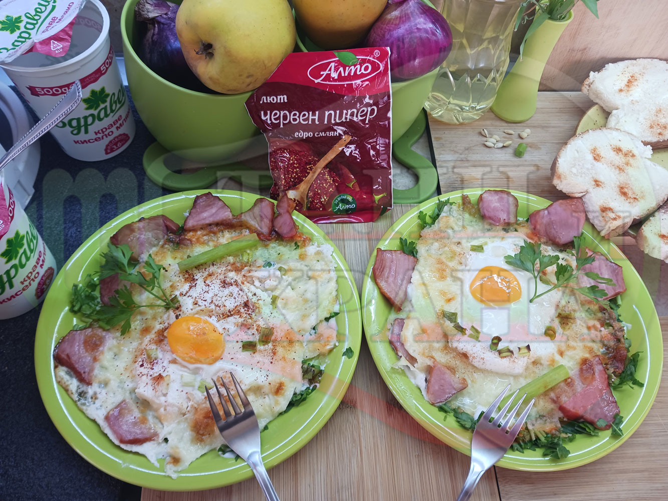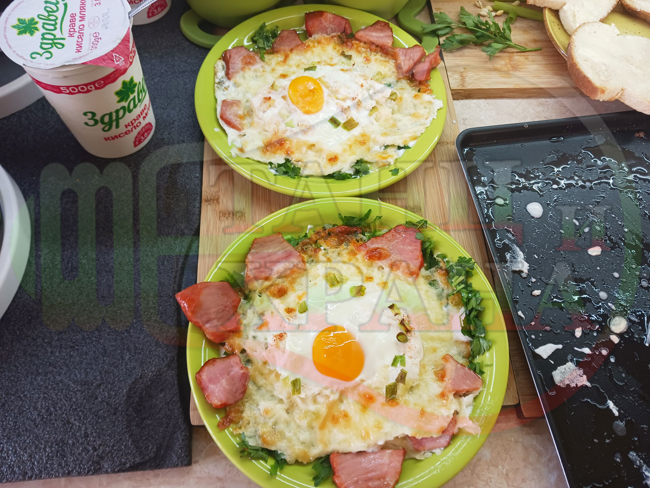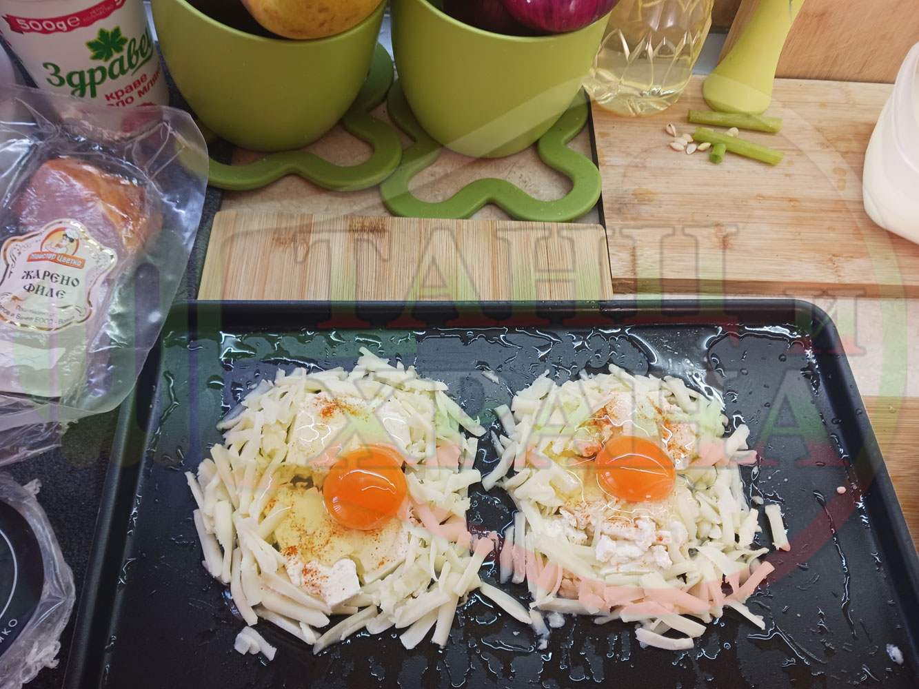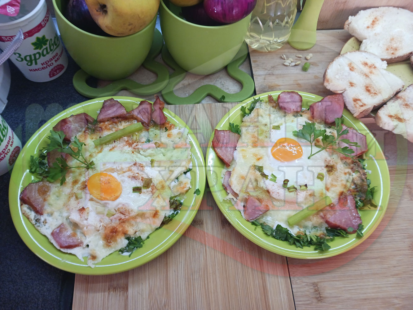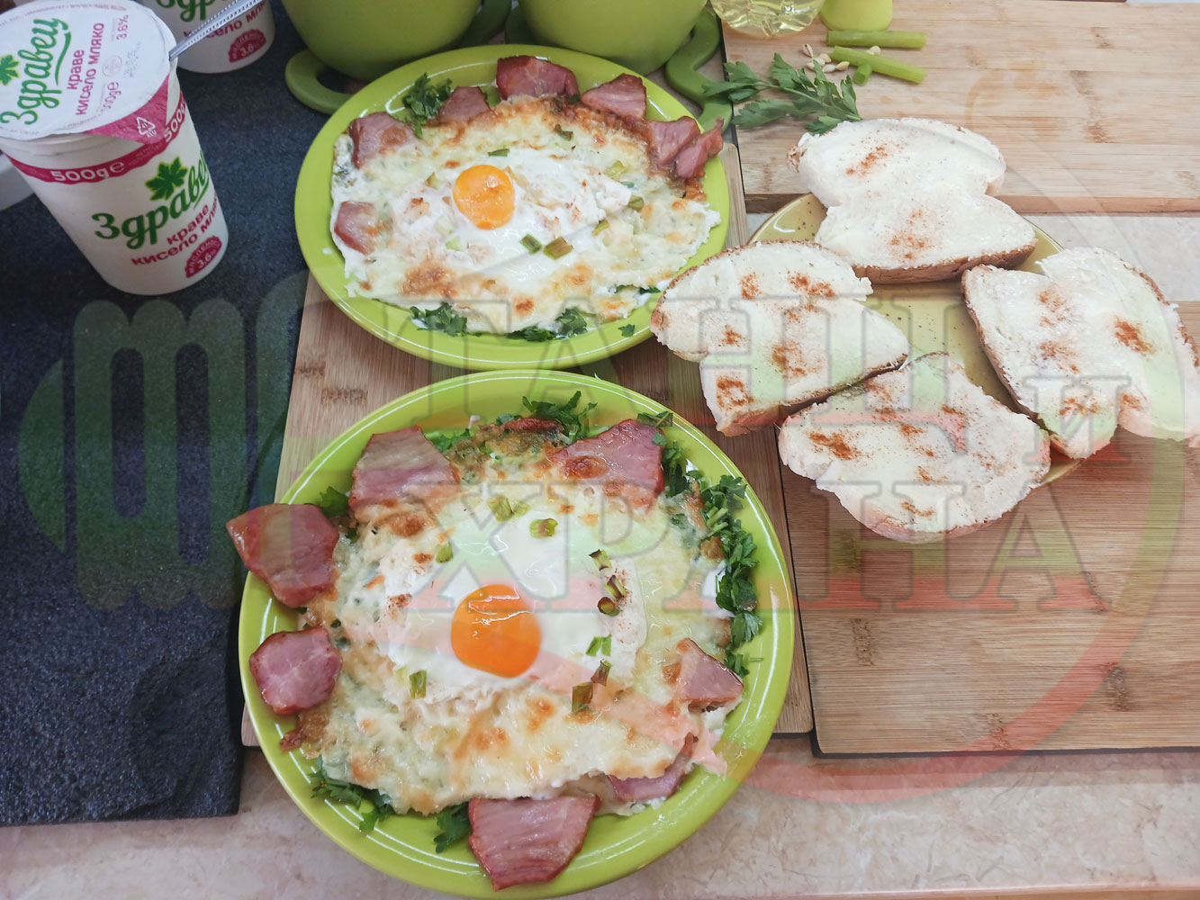 Яйца на очи "Кашкаваленояйчени филежаренови с БГсирене" запечени на фурна с млечен кашкавал, жарено филе, червен сладък пипер, пресен лук и краве бяло сирене (българско, саламурено) гарнирани с млечна основа от кисело мляко от България и магданоз