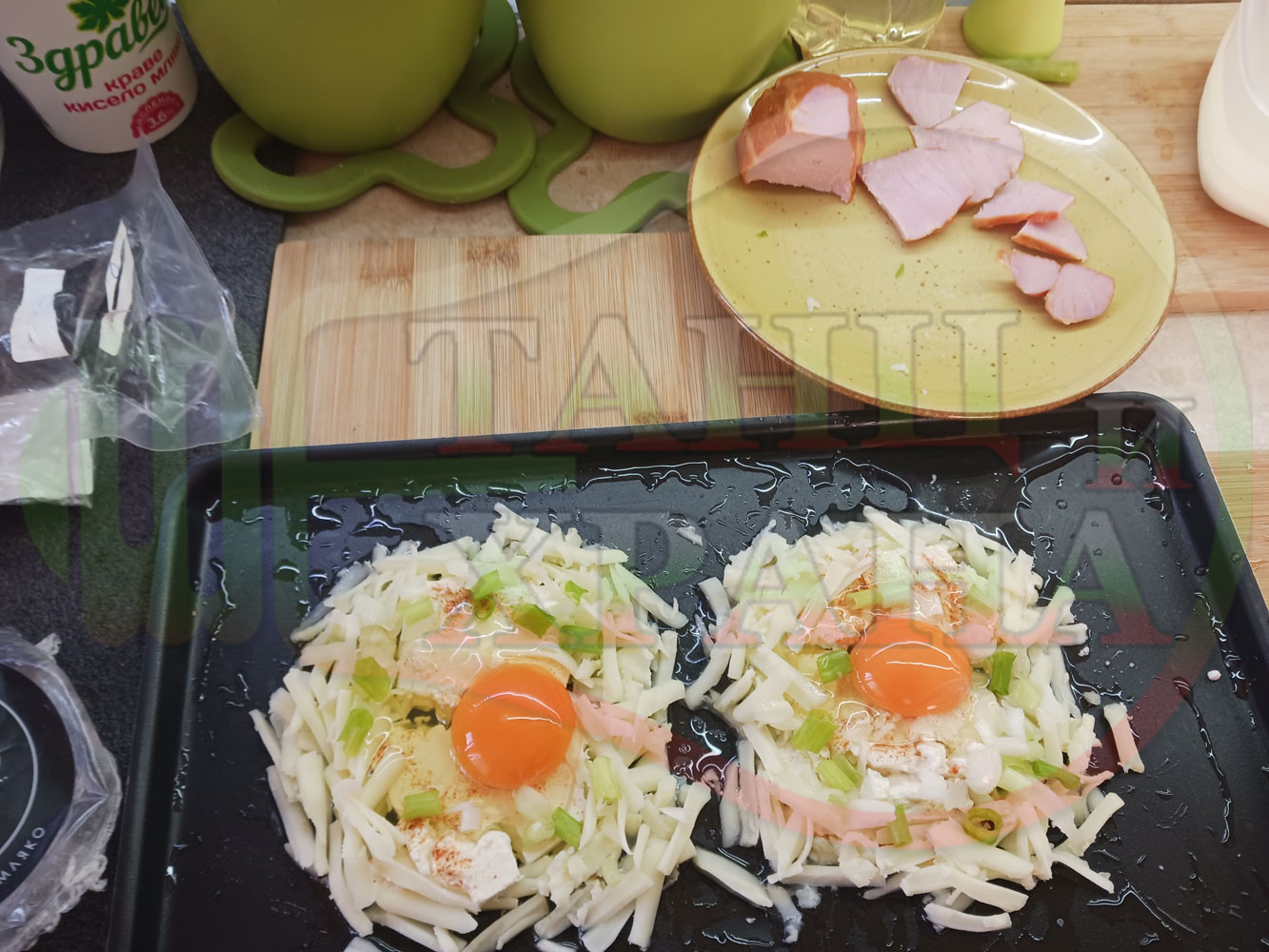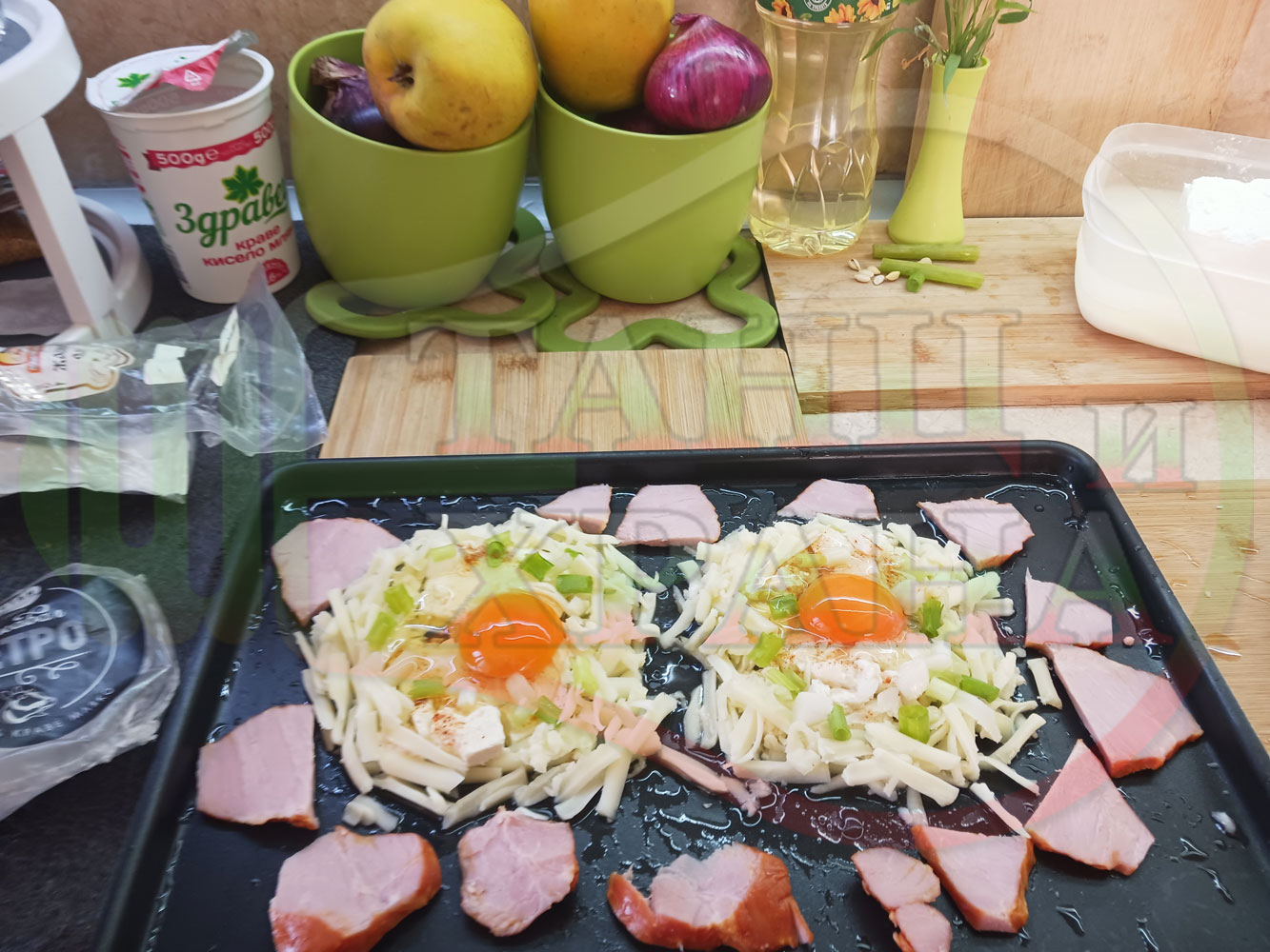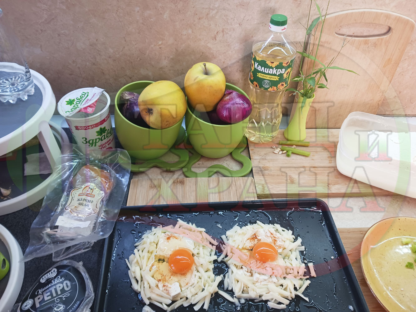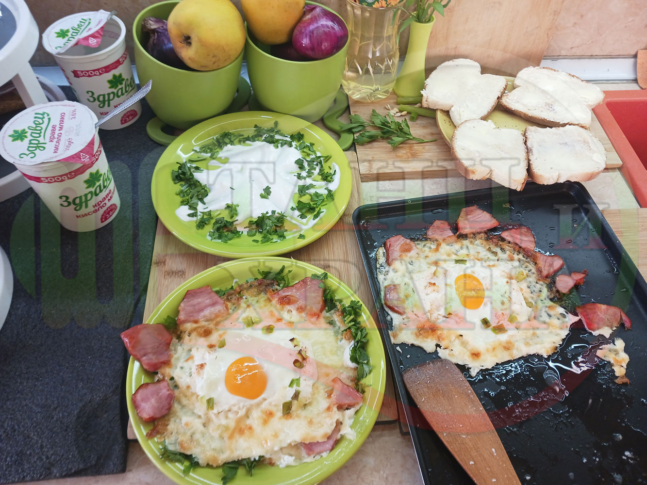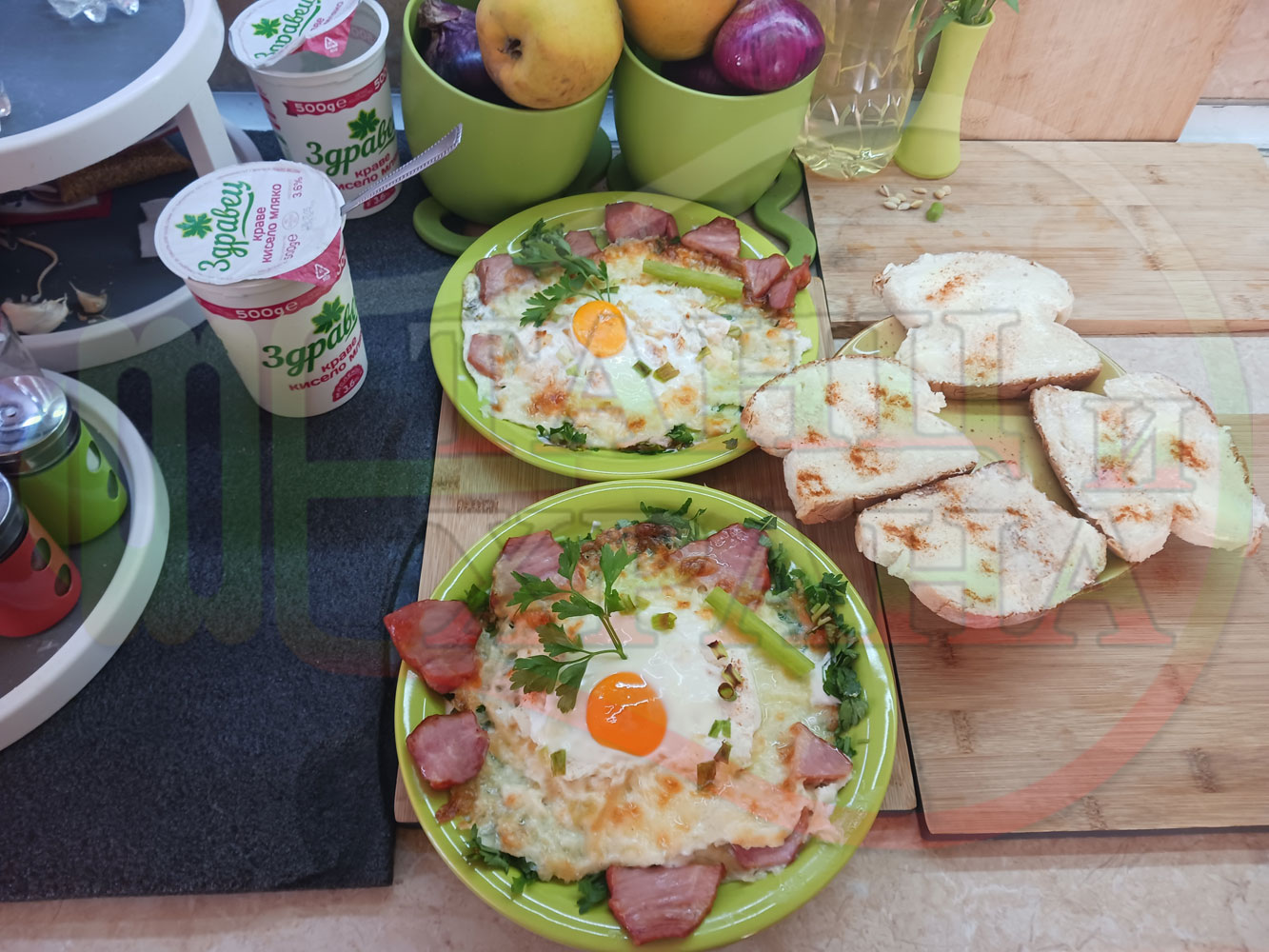 Яйца на очи "Кашкаваленояйчени филежаренови с БГсирене" запечени на фурна с млечен кашкавал, жарено филе, червен сладък пипер, пресен лук и краве бяло сирене (българско, саламурено) гарнирани с млечна основа от кисело мляко от България и магданоз