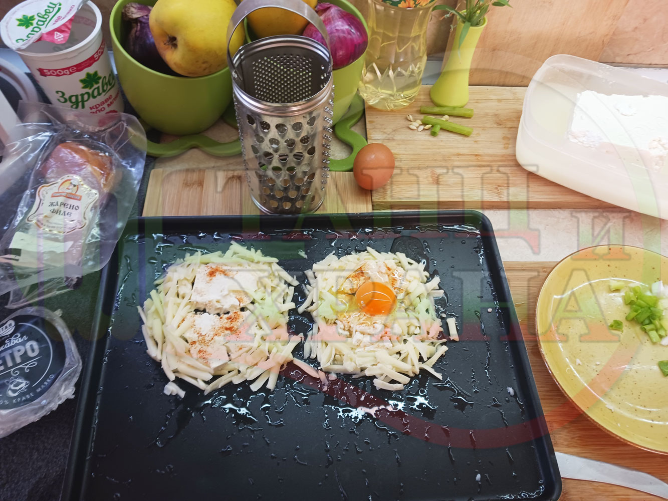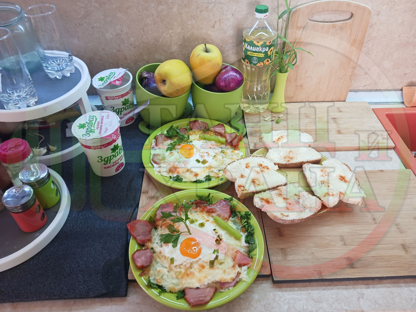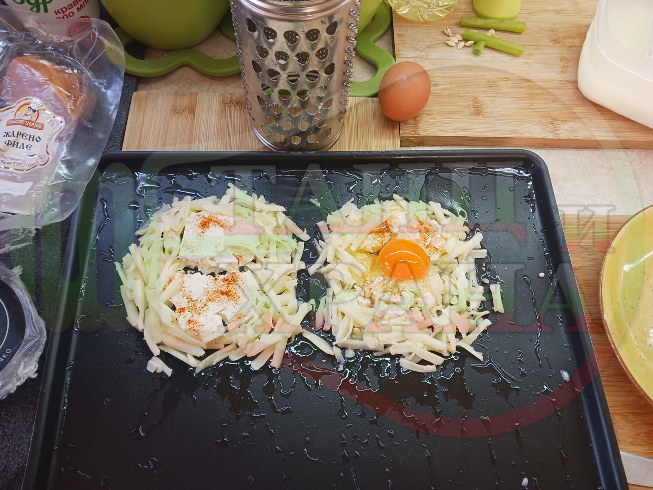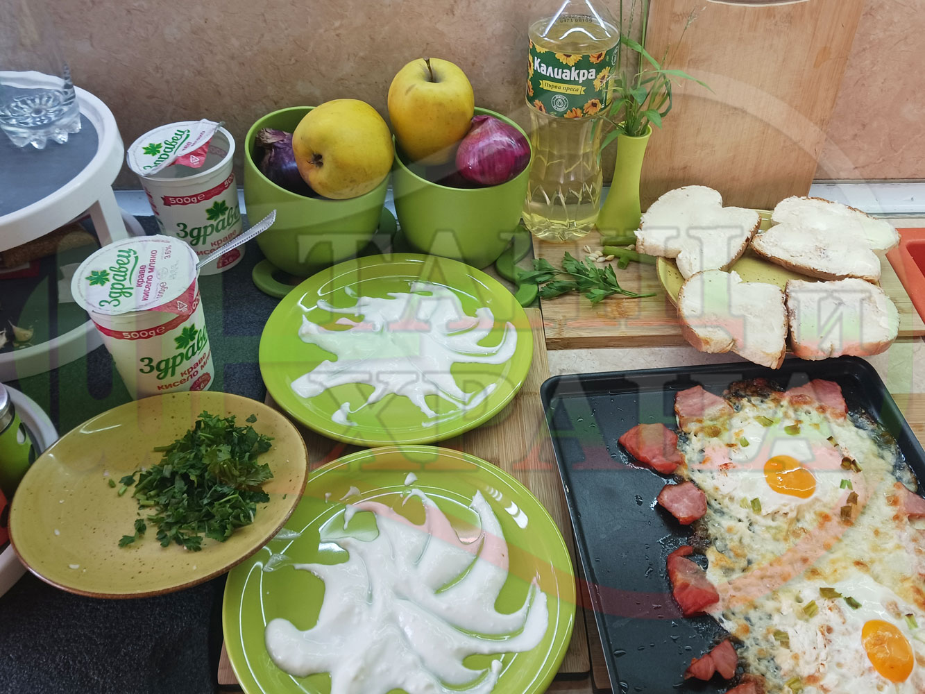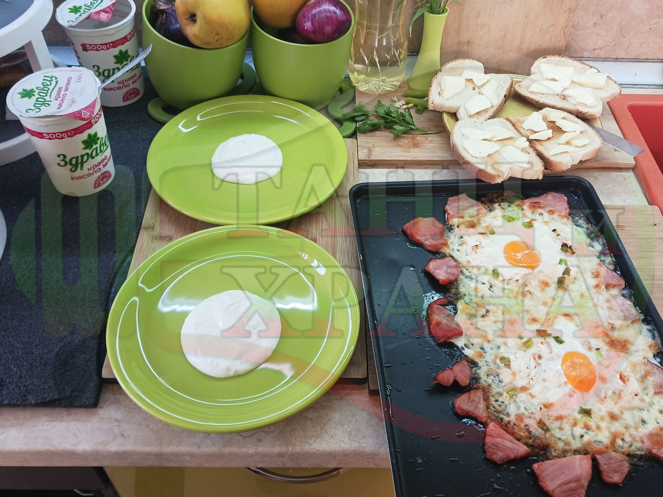 Яйца на очи "Кашкаваленояйчени филежаренови с БГсирене" запечени на фурна с млечен кашкавал, жарено филе, червен сладък пипер, пресен лук и краве бяло сирене (българско, саламурено) гарнирани с млечна основа от кисело мляко от България и магданоз