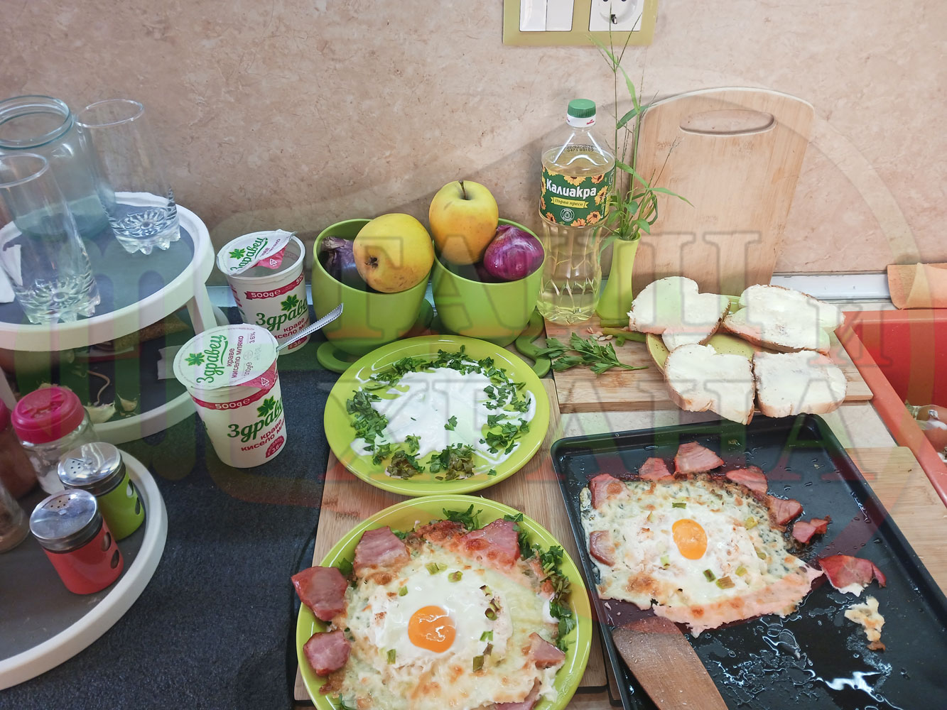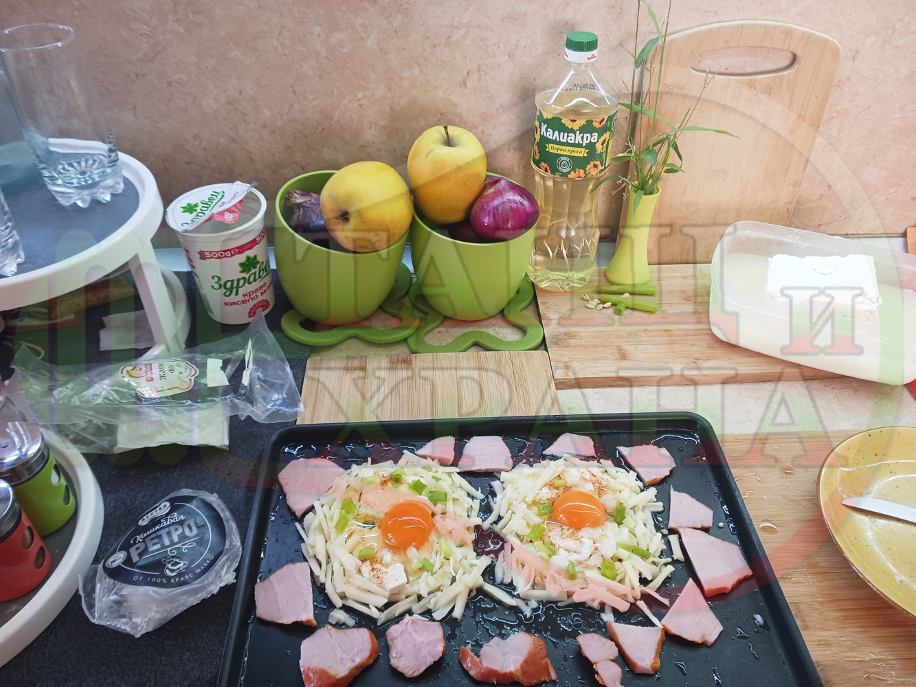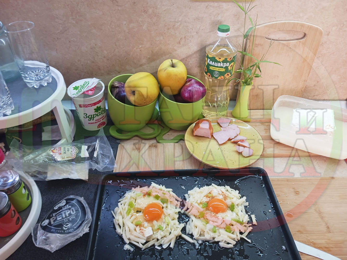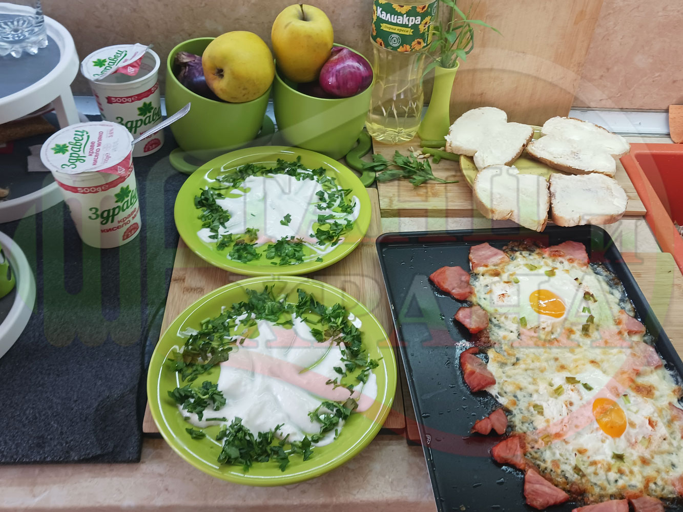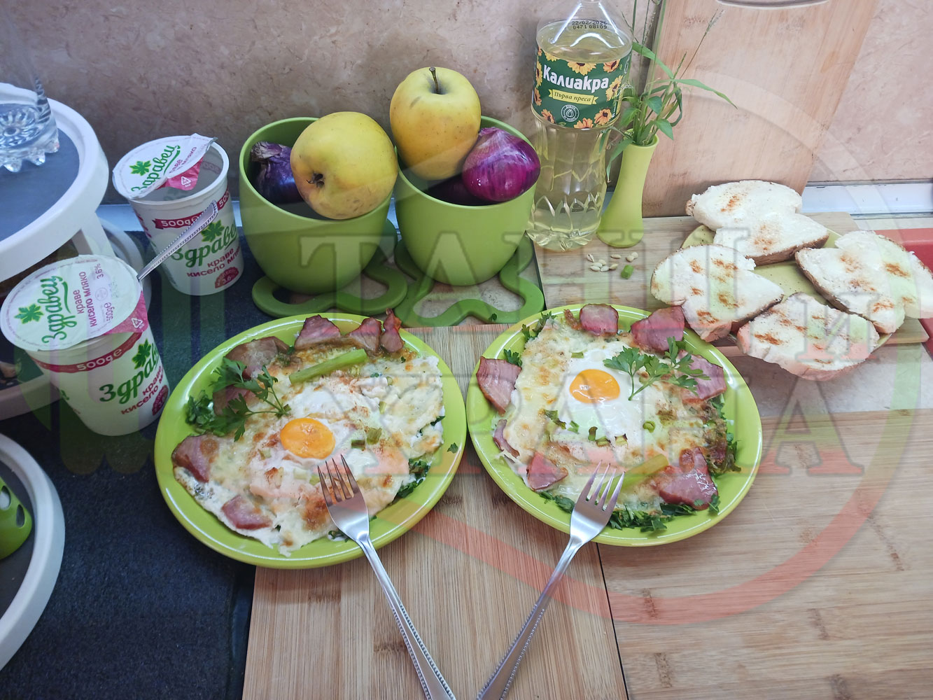 Яйца на очи "Кашкаваленояйчени филежаренови с БГсирене" запечени на фурна с млечен кашкавал, жарено филе, червен сладък пипер, пресен лук и краве бяло сирене (българско, саламурено) гарнирани с млечна основа от кисело мляко от България и магданоз