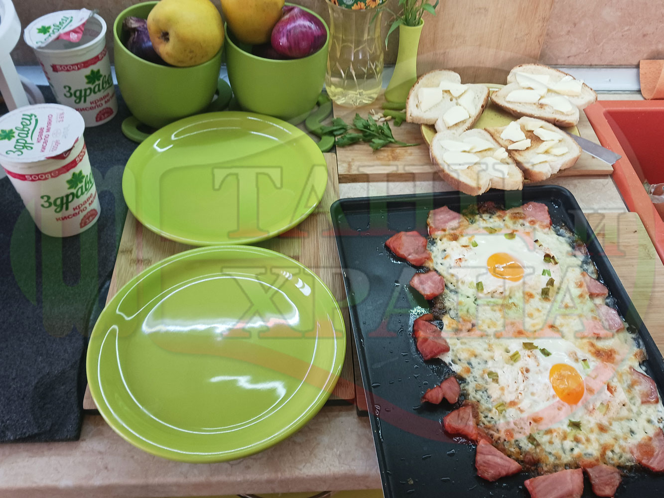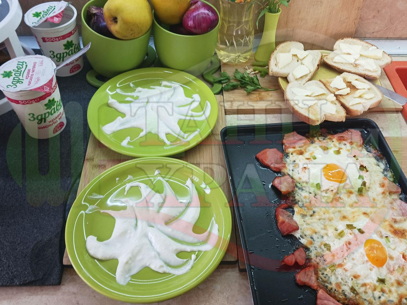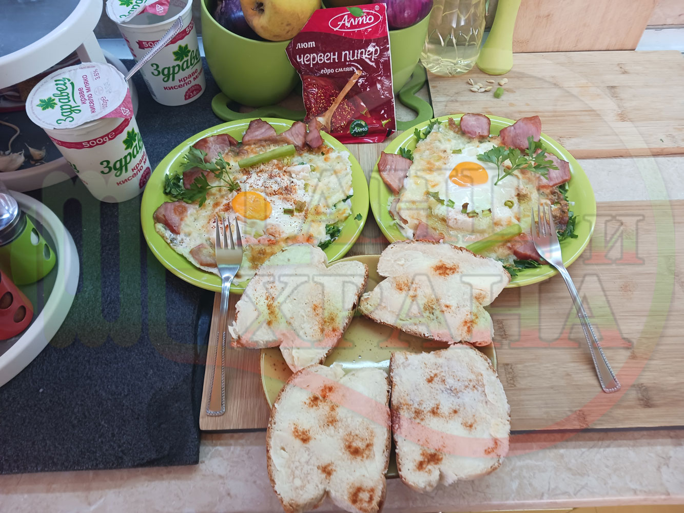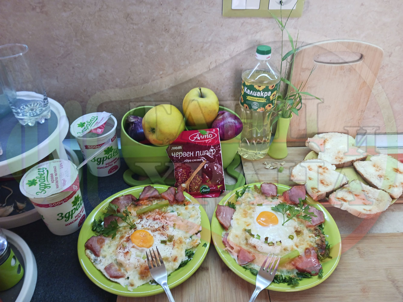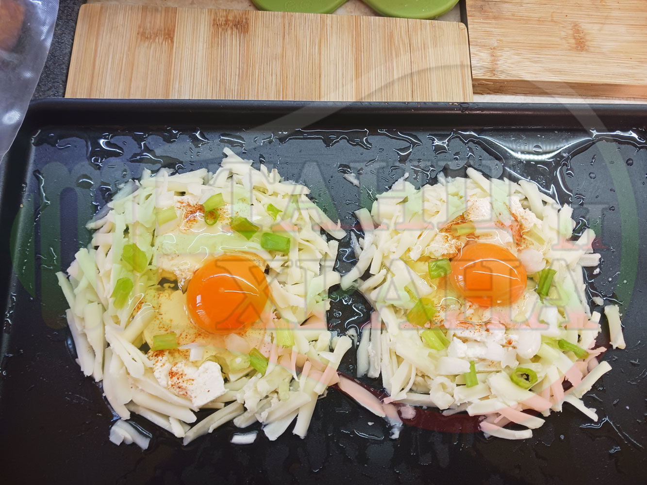 Яйца на очи "Кашкаваленояйчени филежаренови с БГсирене" запечени на фурна с млечен кашкавал, жарено филе, червен сладък пипер, пресен лук и краве бяло сирене (българско, саламурено) гарнирани с млечна основа от кисело мляко от България и магданоз